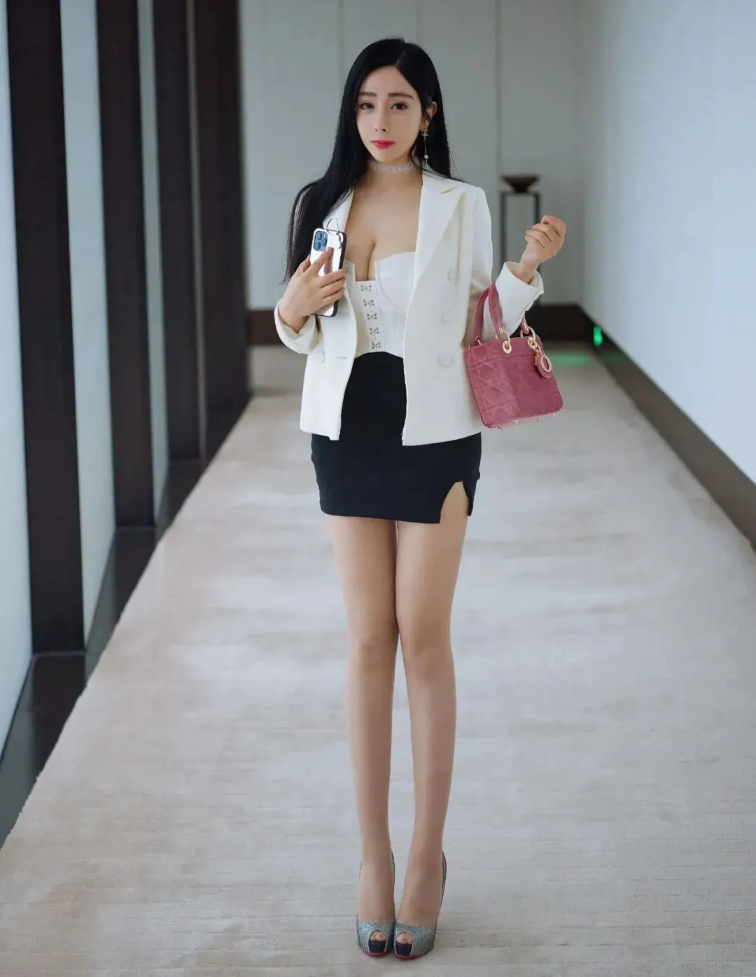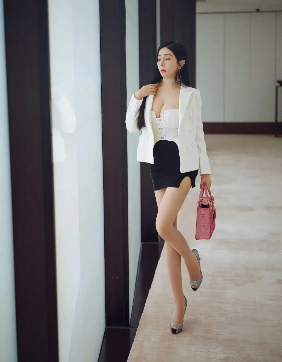 白色小西装外套,内搭白色束胸,下搭一条黑色超短裙,配肉色丝袜和银色鱼嘴高跟鞋,办公室OL风,确实令人心动。