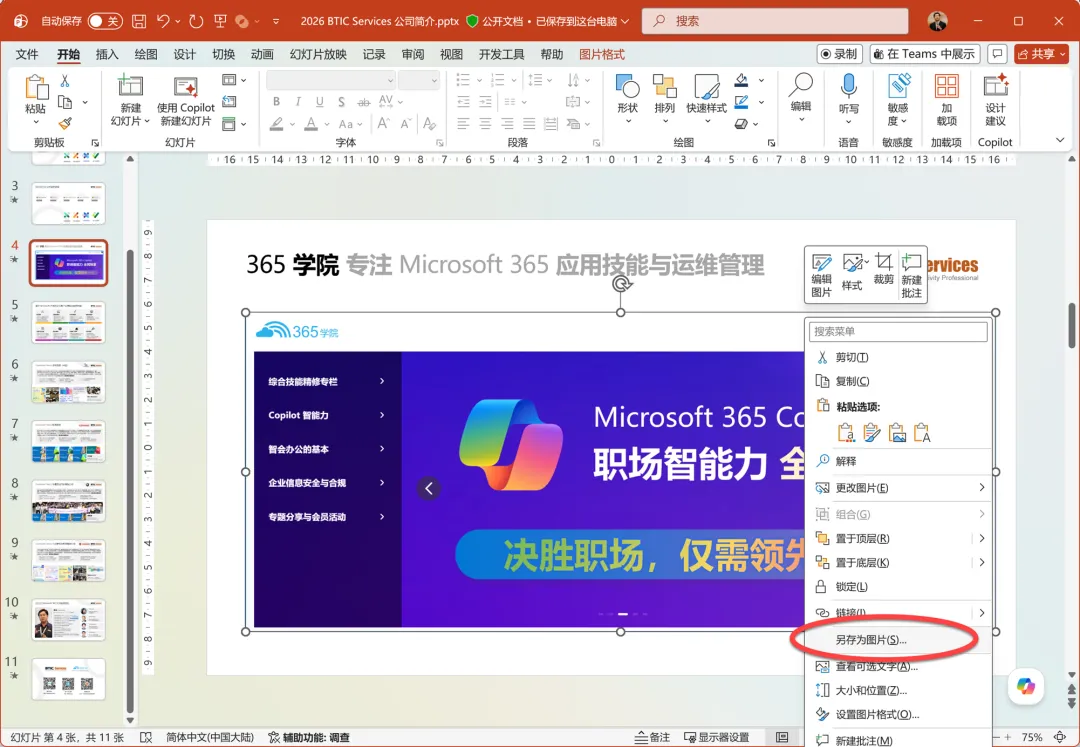 PowerPoint 幻灯片中,右键单击需要保存的图片,执行其中的另存为图片命令。