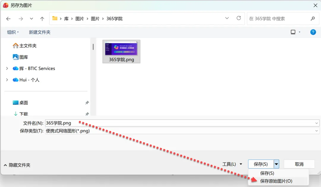 在随即打开的“另存为图片”对话框中,不要直接单击保存按钮,而是执行该按钮右侧的下拉箭头,在展开的下拉列表中,选择保存原始图片选项。