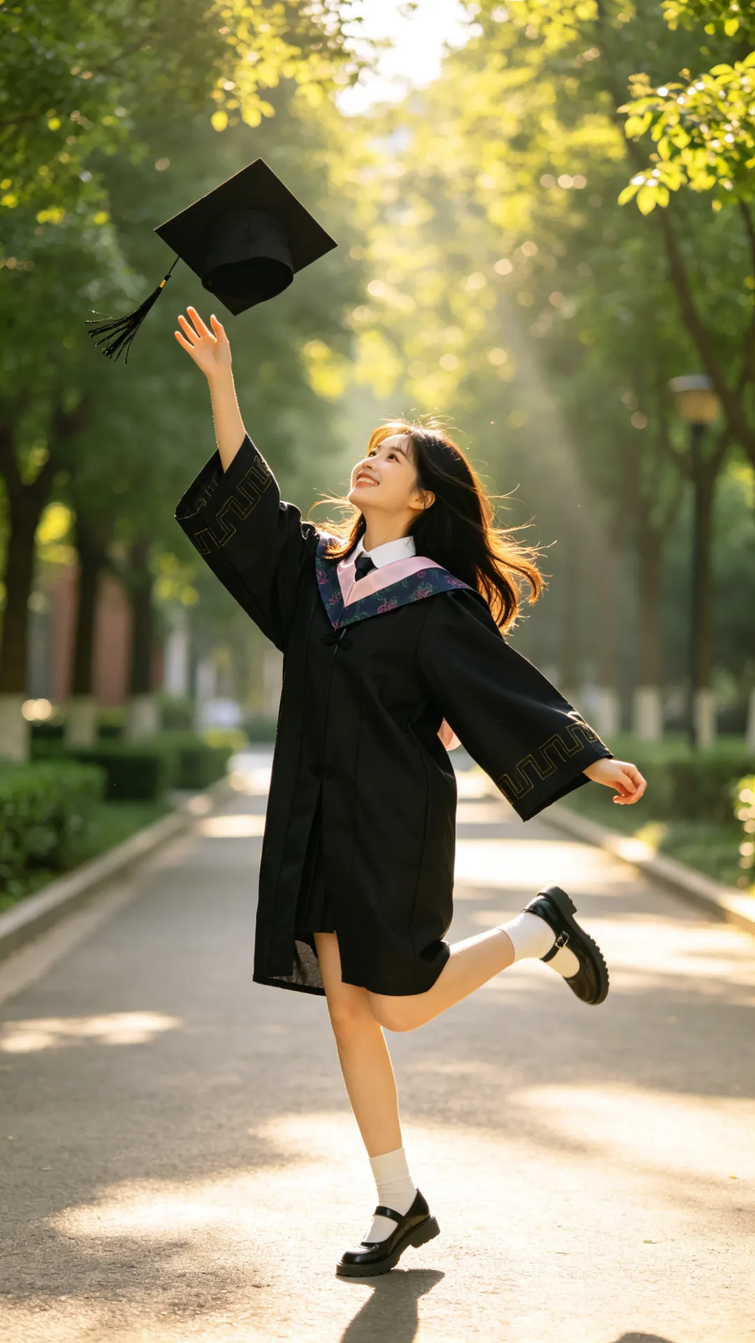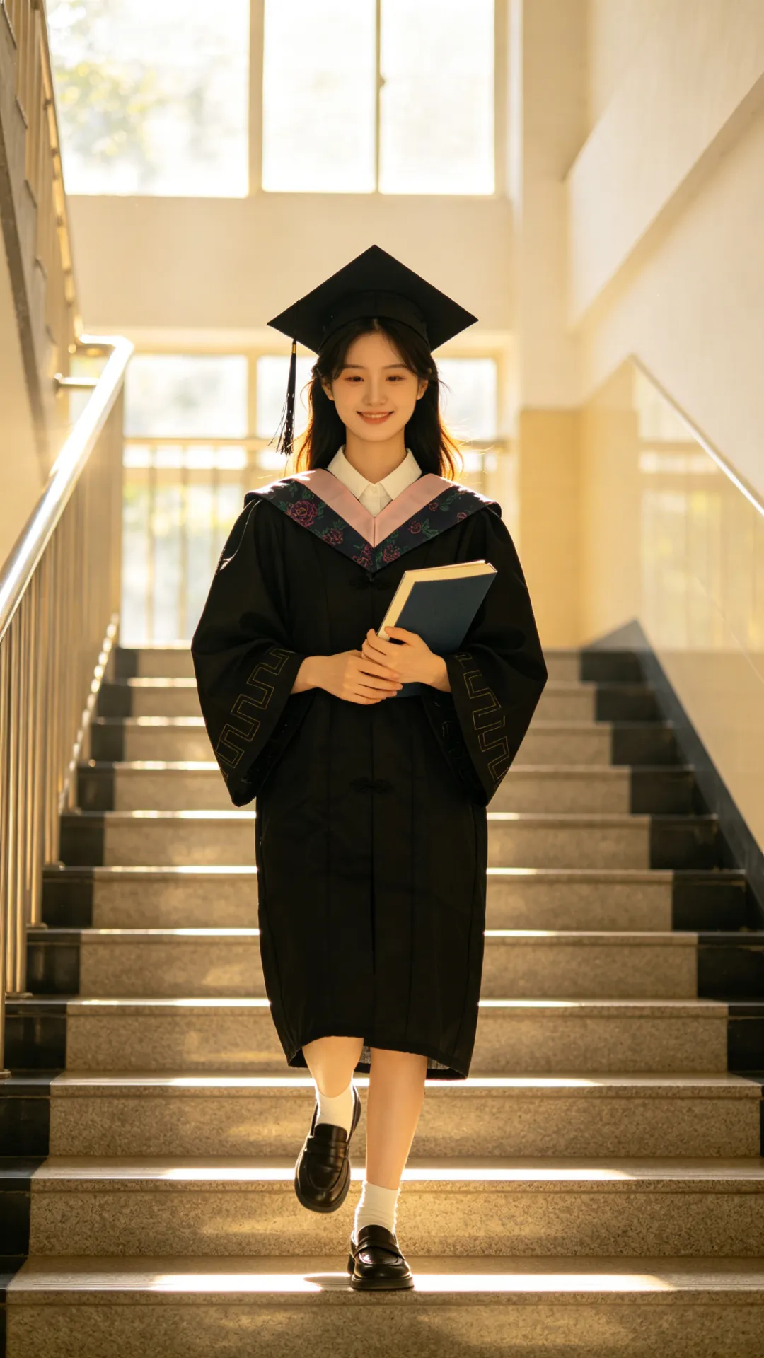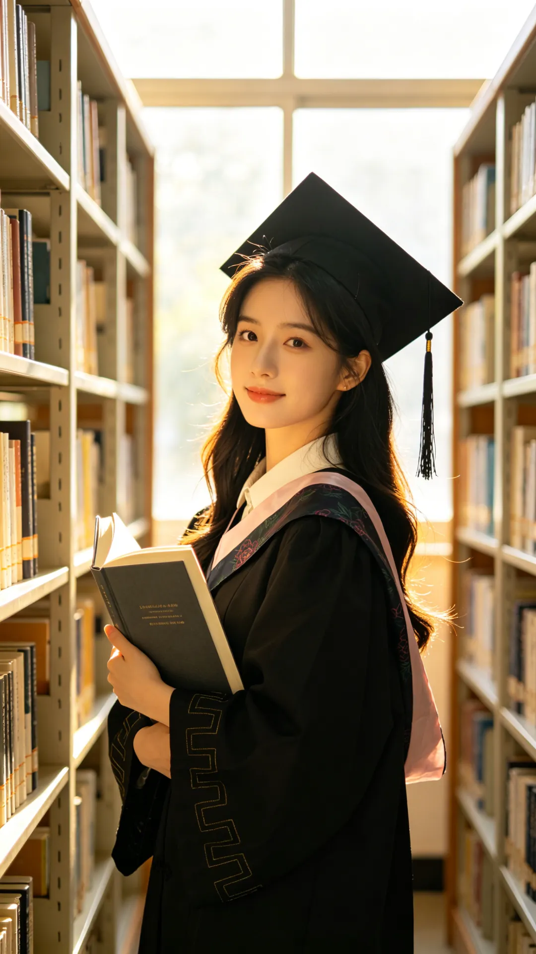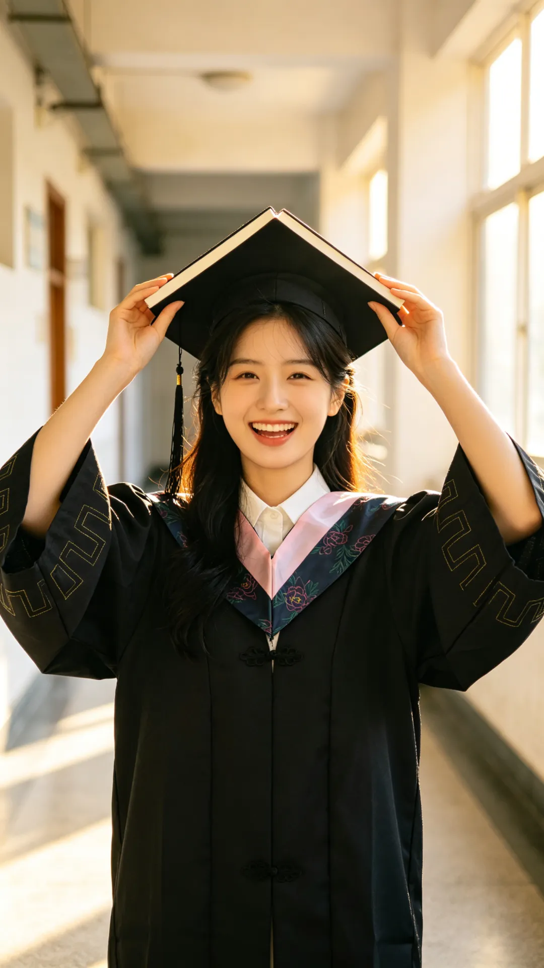 提示词:帮我生成12张图片:8K超高清,超写实人像,电影感,毕业季写真,年轻清新的东亚女大学生,黑色学士服+学士帽,12张不同构图的校园写真,场景包含林荫道、图书馆、教学楼走廊、室外台阶,动作包含捧花、捧书、抛学士帽、微笑、眨眼、比耶,阳光斑驳的林荫道上,穿学士服的女生手持粉白小花束,微笑看向镜头,清新治愈的毕业写真,柔和暖光,浅景深 女生双手捧着一本白书,对着镜头眨眼,背景是虚化的校园绿植,电影感侧逆光,胶片质感 女生蹲在校园步道上,抱着花束低头浅笑,暖金色阳光洒在身上,清新日系毕业照 图书馆书架间,女生侧身捧着书本,看向镜头,柔和自然光,安静文艺的氛围 教学楼走廊里,女生双手举着书本过头顶,开心大笑,明亮通透的光线 女生坐在图书馆地面上,低头翻书,周围是高大的书架,温暖安静的氛围 女生站在图书馆书架前,捧着书本侧头看镜头,阳光透过窗户洒在身上 女生走下教学楼台阶,双手捧着书本,脸上带着温柔的笑容 女生在校园绿道上单脚起跳,把学士帽抛向空中,充满活力的动态瞬间 女生抬手抛起学士帽,仰头大笑,背景是虚化的树木,青春感拉满 女生靠在教学楼走廊的白墙上,对着镜头比耶,清新俏皮的毕业照 女生站在阳光下,双手捧着花束,闭着眼睛微笑,暖金色逆光,氛围感拉满,柔和暖金色自然光,丁达尔光斑,清新治愈的青春氛围感,胶片质感,浅景深,背景虚化,画面明亮通透,皮肤质感自然,细节清晰,无AI瑕疵。