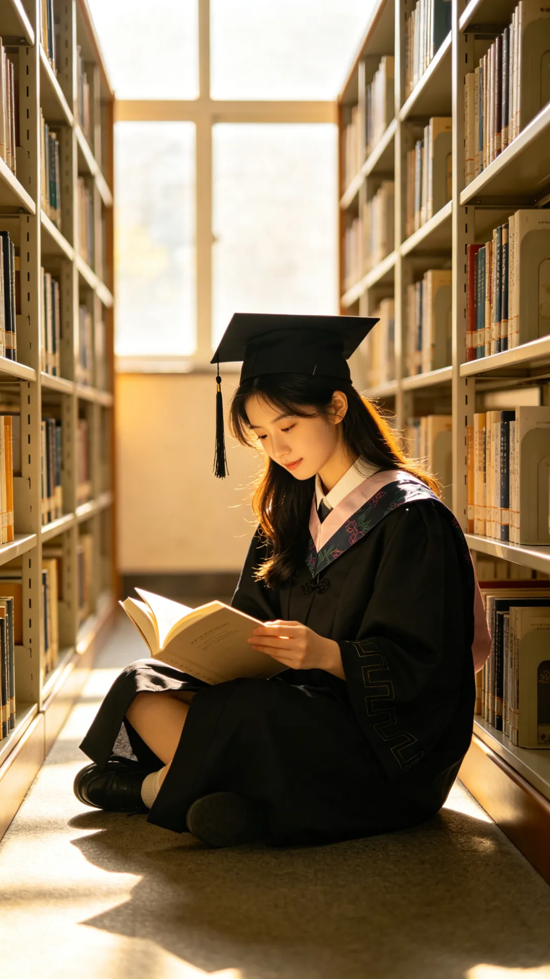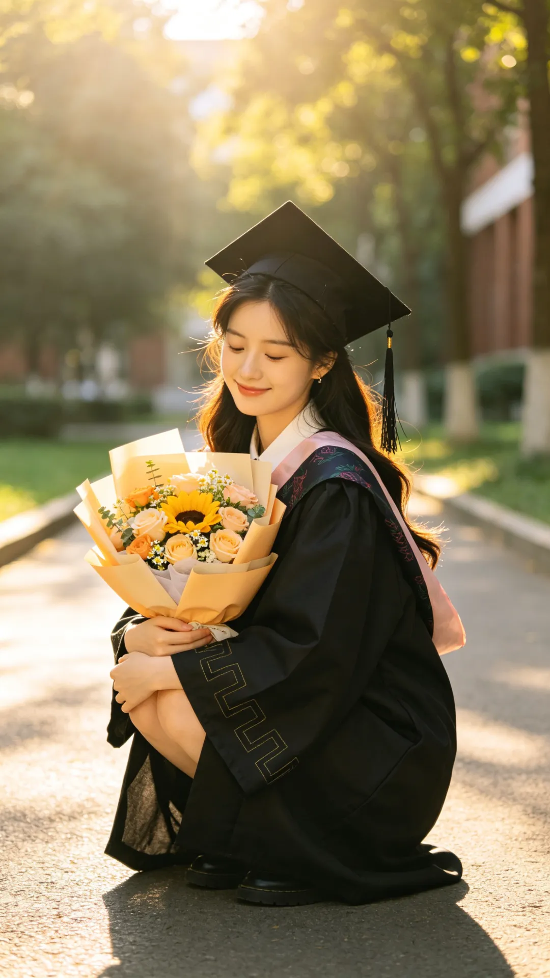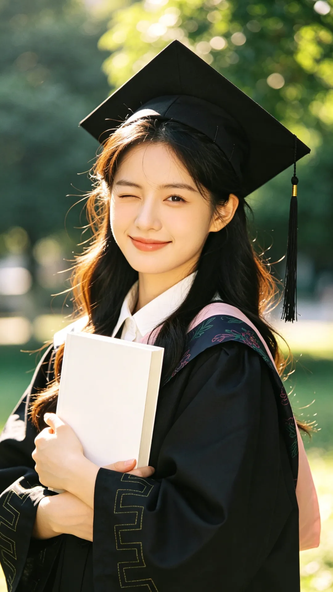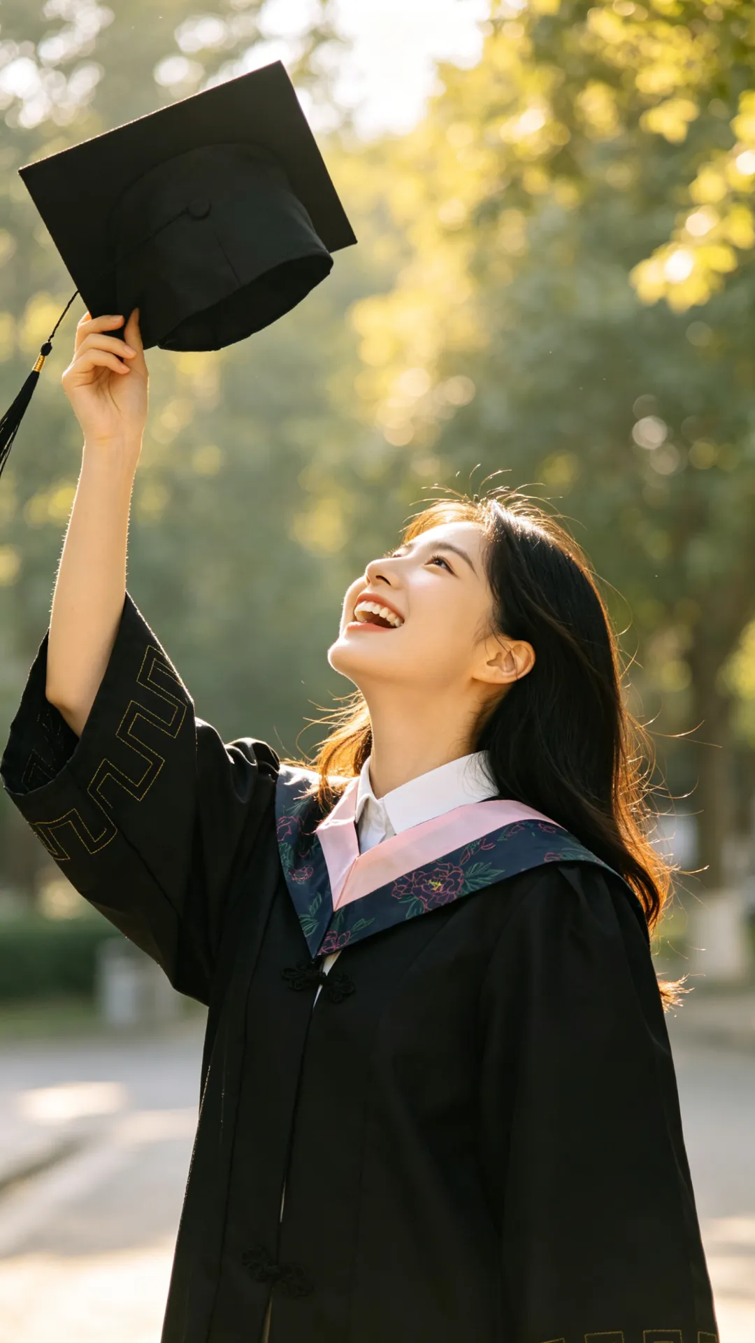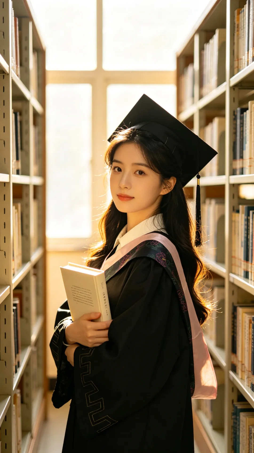 提示词:帮我生成12张图片:8K超高清,超写实人像,电影感,毕业季写真,年轻清新的东亚女大学生,黑色学士服+学士帽,12张不同构图的校园写真,场景包含林荫道、图书馆、教学楼走廊、室外台阶,动作包含捧花、捧书、抛学士帽、微笑、眨眼、比耶,阳光斑驳的林荫道上,穿学士服的女生手持粉白小花束,微笑看向镜头,清新治愈的毕业写真,柔和暖光,浅景深 女生双手捧着一本白书,对着镜头眨眼,背景是虚化的校园绿植,电影感侧逆光,胶片质感 女生蹲在校园步道上,抱着花束低头浅笑,暖金色阳光洒在身上,清新日系毕业照 图书馆书架间,女生侧身捧着书本,看向镜头,柔和自然光,安静文艺的氛围 教学楼走廊里,女生双手举着书本过头顶,开心大笑,明亮通透的光线 女生坐在图书馆地面上,低头翻书,周围是高大的书架,温暖安静的氛围 女生站在图书馆书架前,捧着书本侧头看镜头,阳光透过窗户洒在身上 女生走下教学楼台阶,双手捧着书本,脸上带着温柔的笑容 女生在校园绿道上单脚起跳,把学士帽抛向空中,充满活力的动态瞬间 女生抬手抛起学士帽,仰头大笑,背景是虚化的树木,青春感拉满 女生靠在教学楼走廊的白墙上,对着镜头比耶,清新俏皮的毕业照 女生站在阳光下,双手捧着花束,闭着眼睛微笑,暖金色逆光,氛围感拉满,柔和暖金色自然光,丁达尔光斑,清新治愈的青春氛围感,胶片质感,浅景深,背景虚化,画面明亮通透,皮肤质感自然,细节清晰,无AI瑕疵。