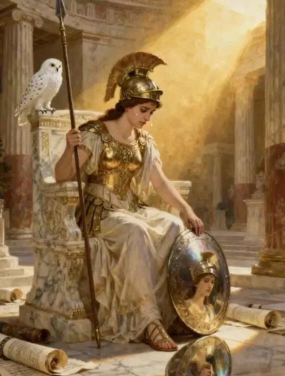 有一天,宙斯听到一则预警,如果他正在孕期的情人墨提斯为他诞下一个儿子,这个孩子将会推翻他的统治。谨慎的宙斯为了消除潜在威胁,直接把墨提斯变成了一只苍蝇,整个吞进了肚子里。斩草除根。可几个月之后,他突然觉得头痛欲裂,不得不向锻造之神赫菲斯托斯求助,让他用斧子把自己的头颅劈成两半,结果一劈开,小雅典娜就从里面跳了出来,她当时还全副武装,手持长枪,头戴金盔!