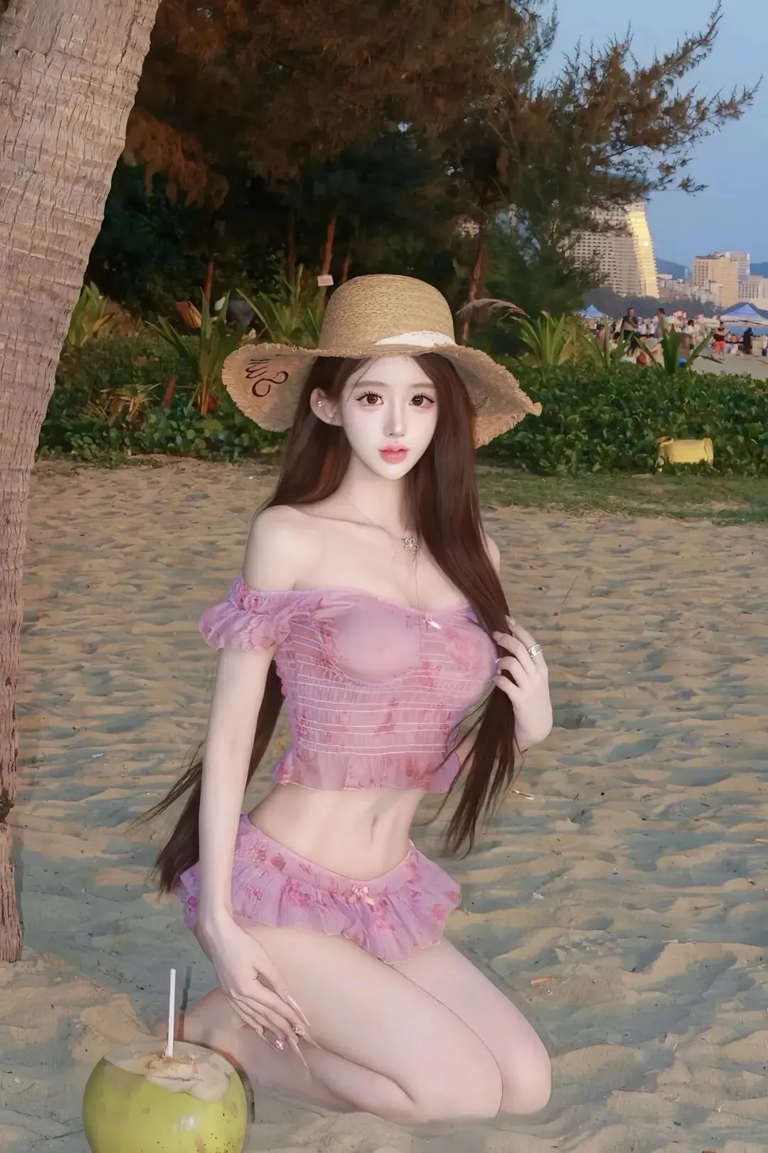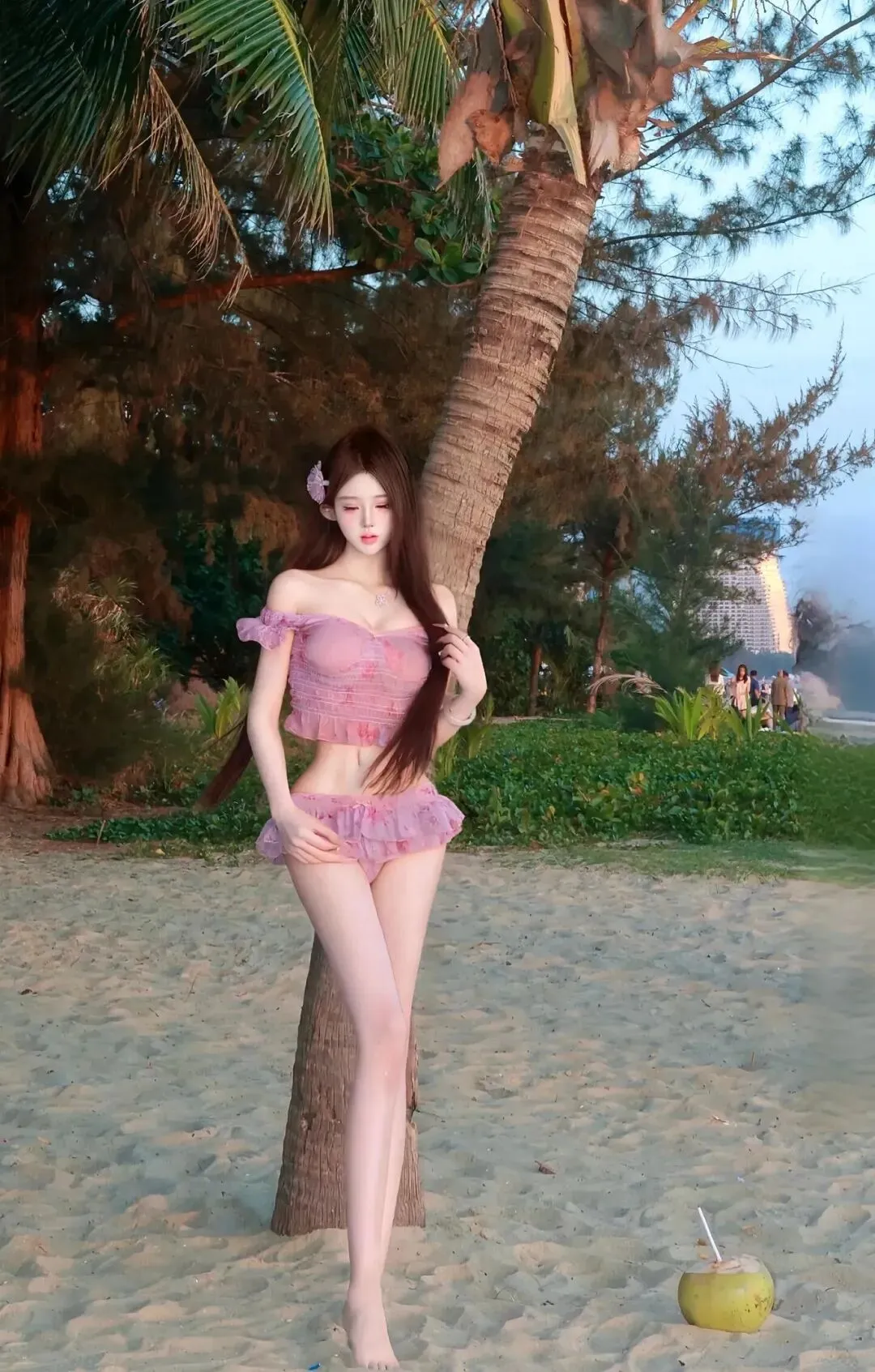 她的肩背浮在风的软,泳装的软裹着腰的弧,纱边的褶缠着腿的软,沙粒沾在纱的纹,连椰影的边都成了这帧里的柔衬。我把镜头推到她的髋:粉纱的软裹着髋的弧,纱边的褶亮成轻弯,椰光的暖落在布面,把软甜染成透的柔,连纱面沾着的沙痕都成了这特写里的真。