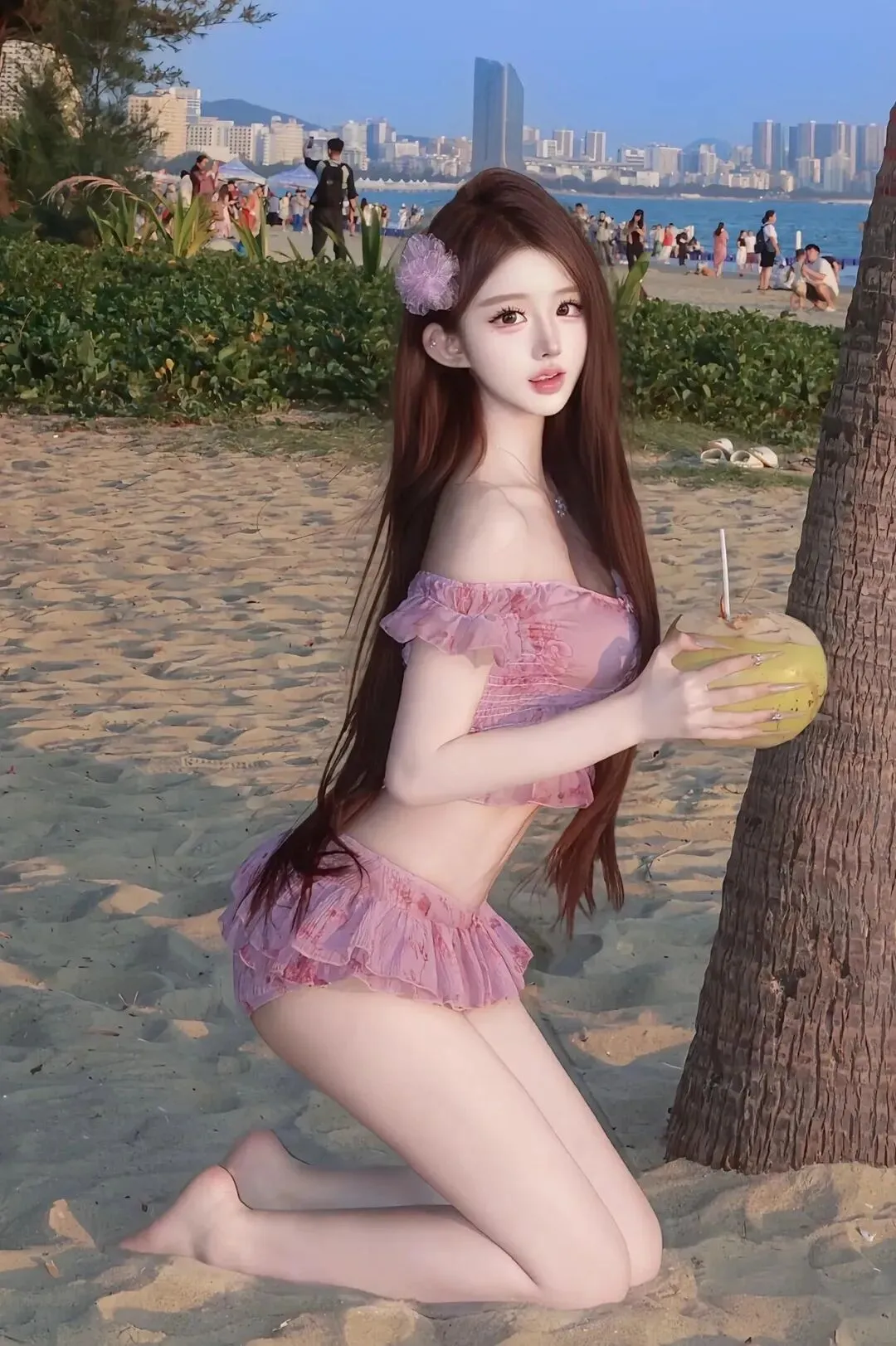 她的肩背抵在风的凉,泳装的软裹着背的弧,纱边的褶缠着腿的软,沙粒沾在纱的纹,连椰光的暖都成了这帧里的柔衬。我把镜头推到她的颈:发梢的碎发缠着颈的软,粉花的亮垂在颈窝,光裹着颈的弧,椰风裹着颈的凉,每道碎发的纹里都藏着夏的节奏。她偏头望椰时,颈的弧跟着动,泳装的纱边贴在背的软,连沙粒滚过纱面的痕都成了这帧里的真。