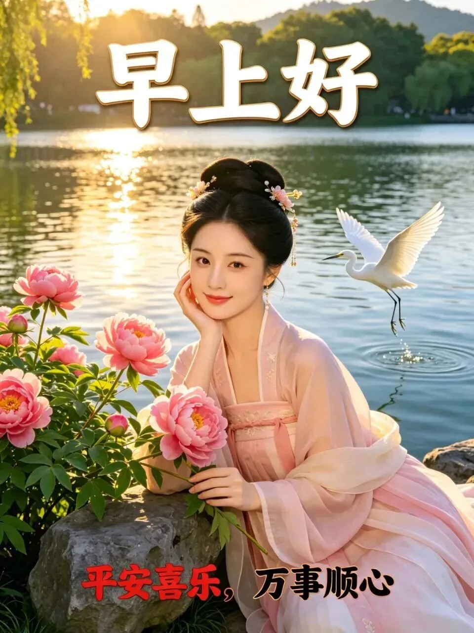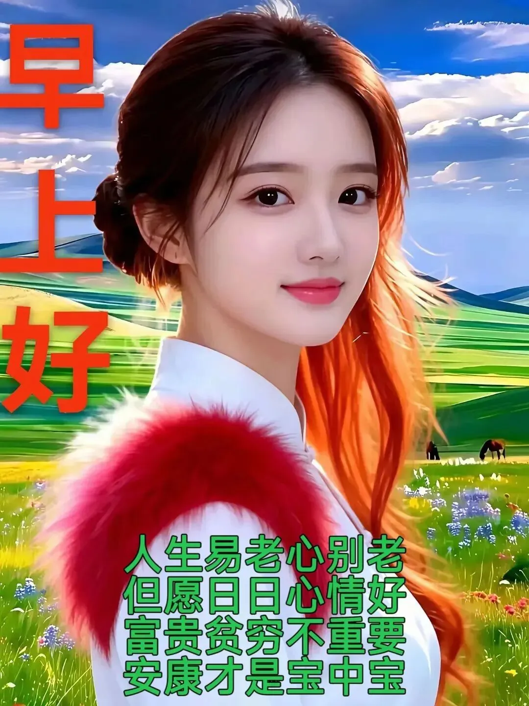 忘掉年龄糊涂过, 寻找顺心天天乐,每天都是新起点, 童心伴随百岁活,清晨送你三件宝:幸福、 快乐、身体好,早上好!