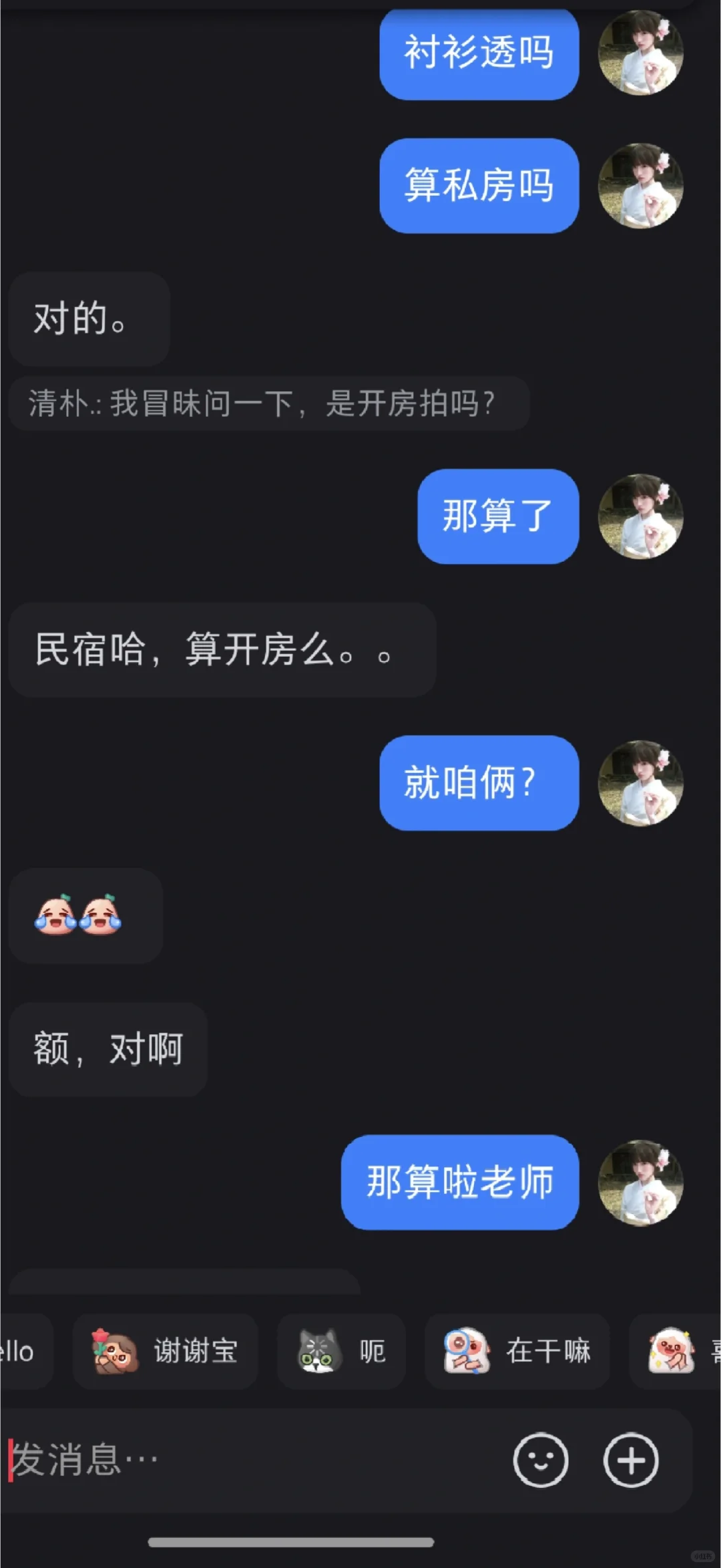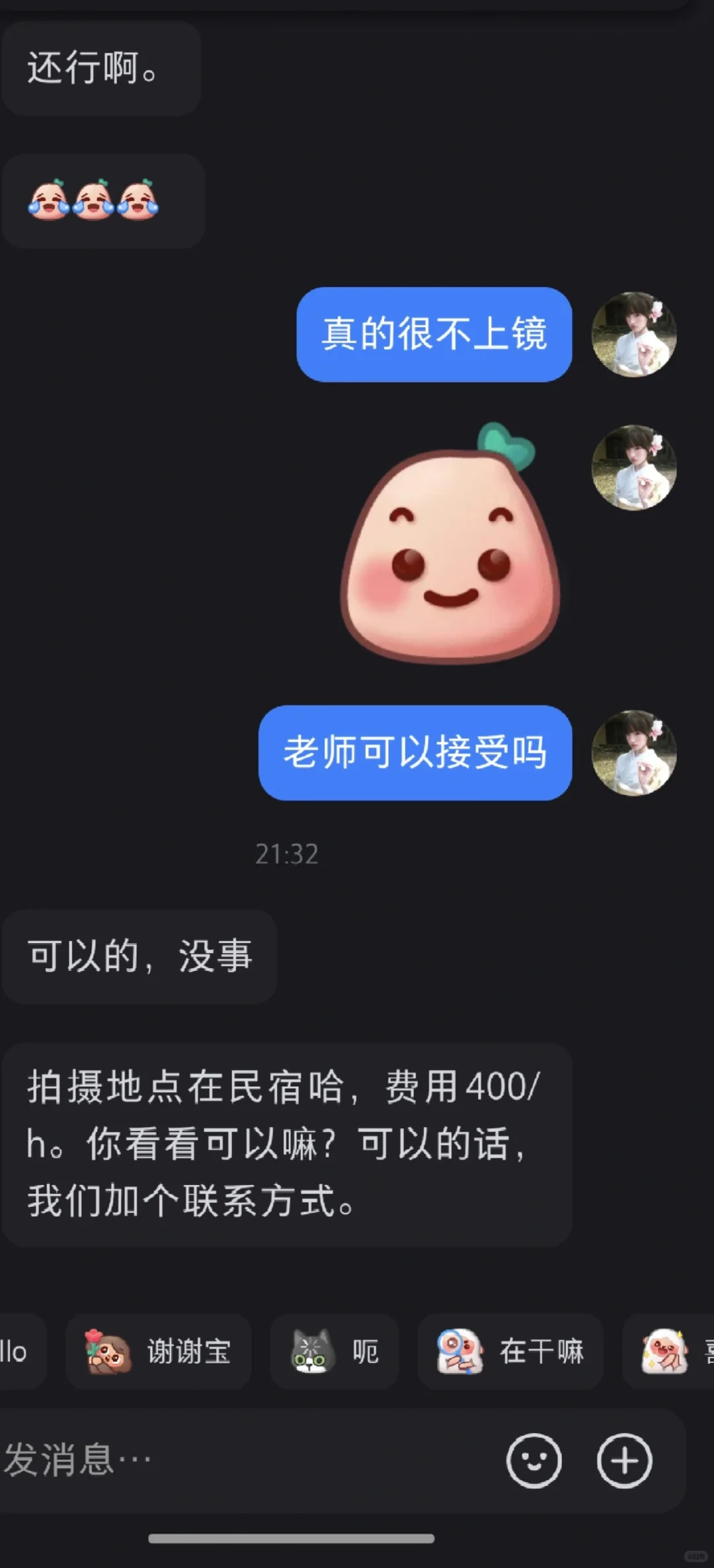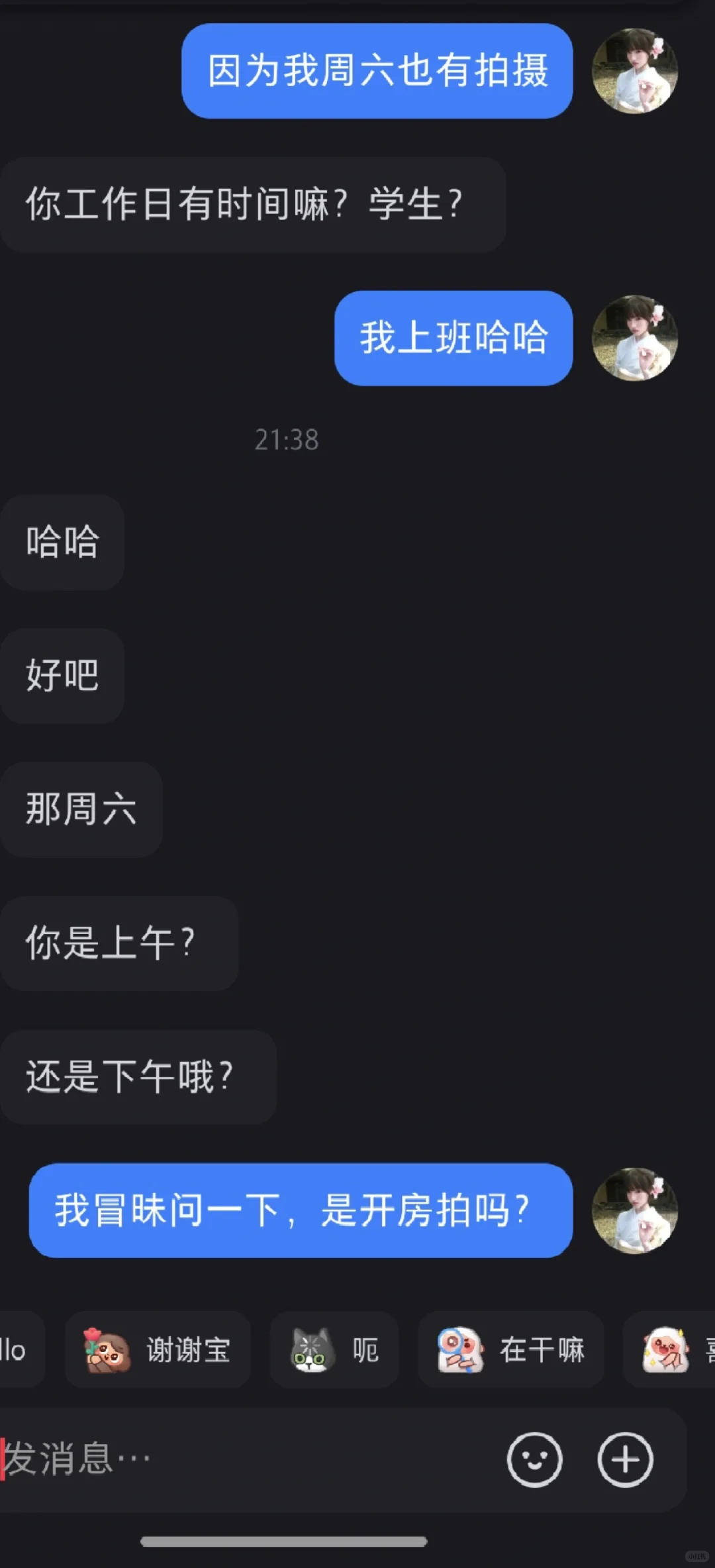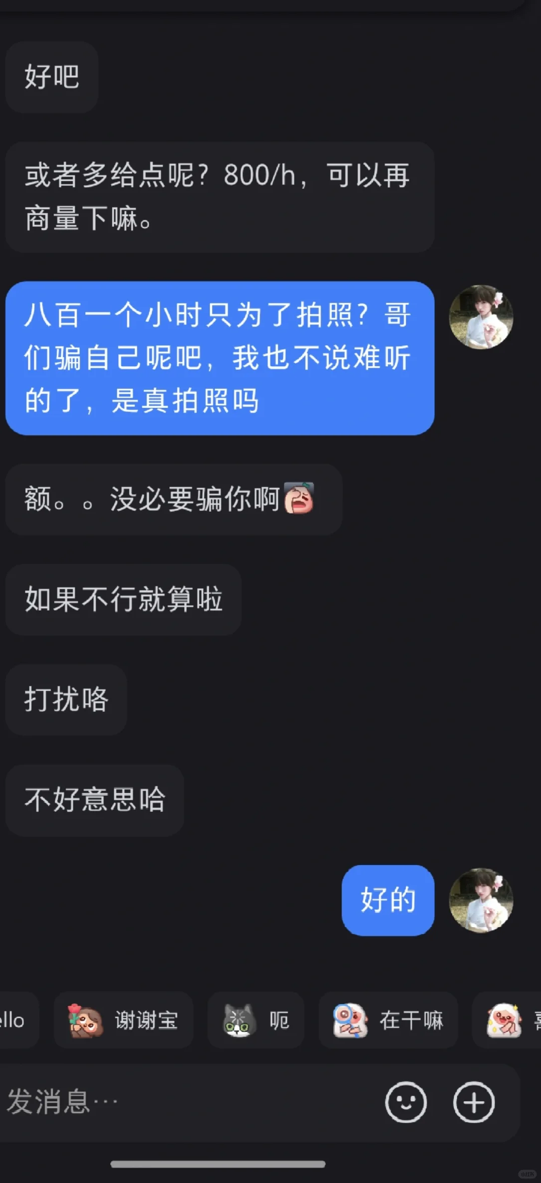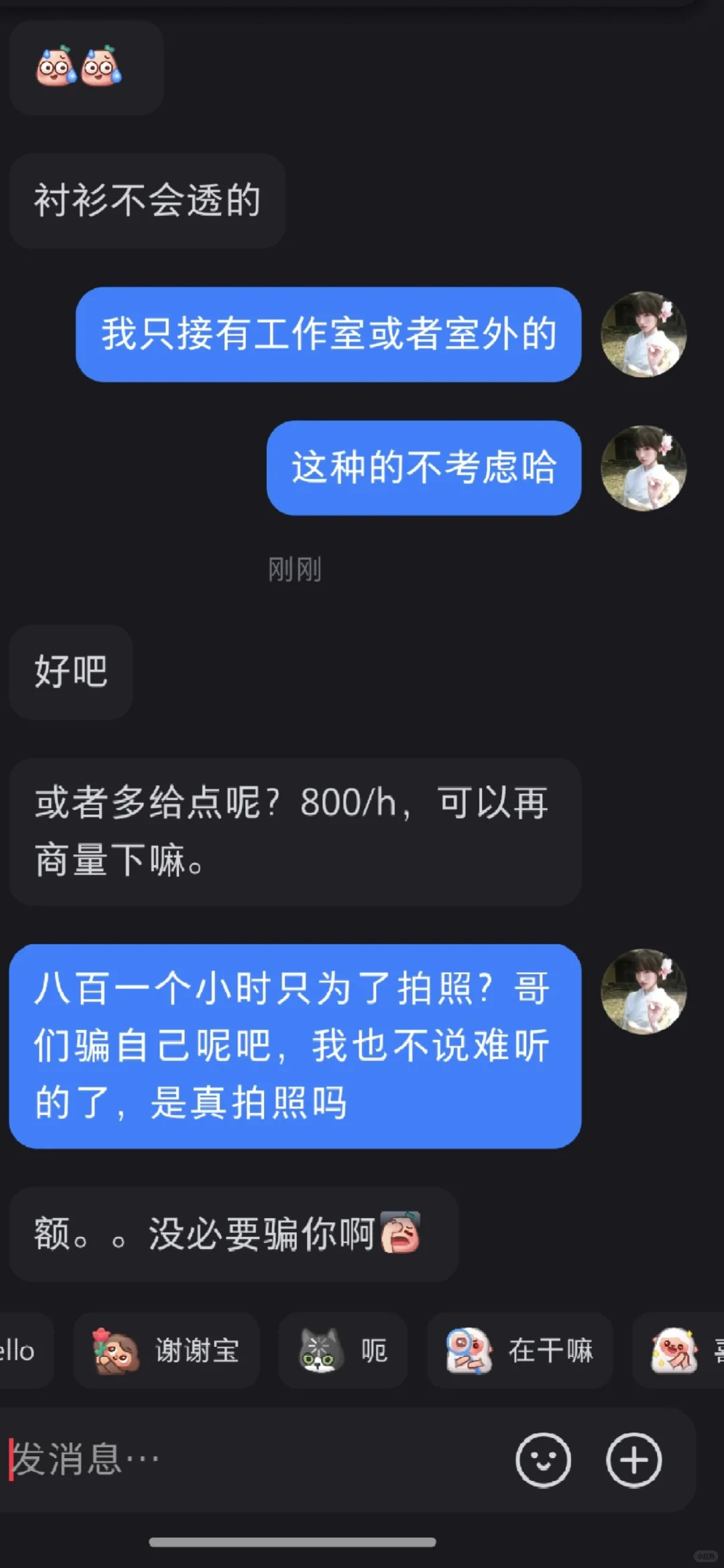 事情是这样的,一个女摄影师发帖子想找可爱类型模特,我就发了照片,然后下班看到有人联系我说小尝发了一个要拍的类型,衬衫类型我也没太怀疑,后面说价格我有点怀疑,跟我闺蜜说了(因为她是模特),她说这种肯定是私房然后可能是恋🦶癖,我本来还问他时间呢,我闺蜜一说我就赶紧问他是不是私房,是不是开fang拍,得到肯定答案,我就拒绝了,结果这哥们说加钱,姐妹们真的要擦亮眼睛,我后知后觉,钝感力极强,幸好我闺蜜比较警惕#什么人都有 #有点离谱但别太离谱 #真让我大开眼界了 #世界之大无奇不有 #我招谁惹谁了 #别太离谱了 #离离原上谱这就很离谱 #天下之大无奇不有 #莫名其妙的 #小红书可以发文件了
