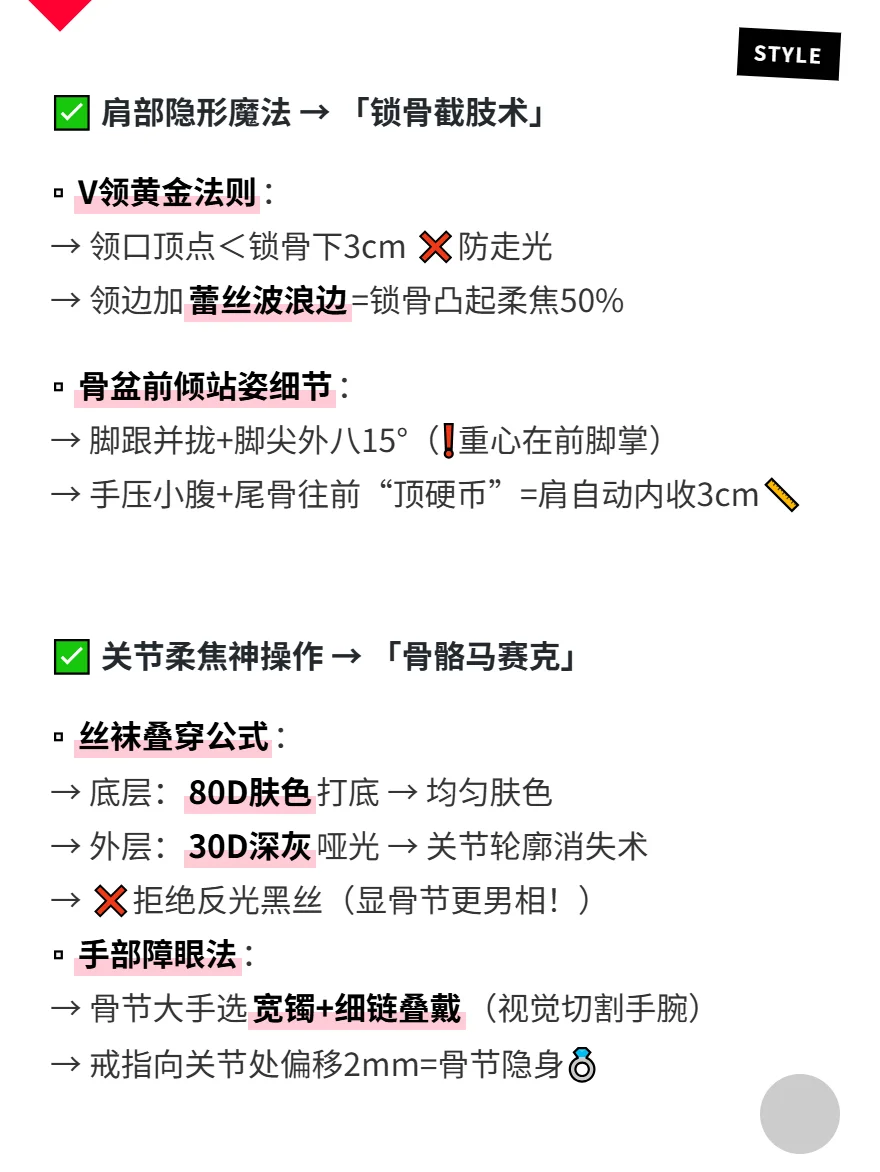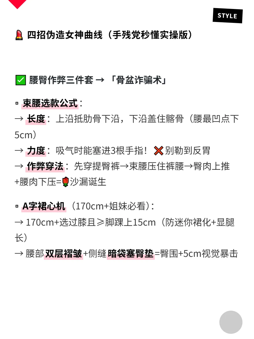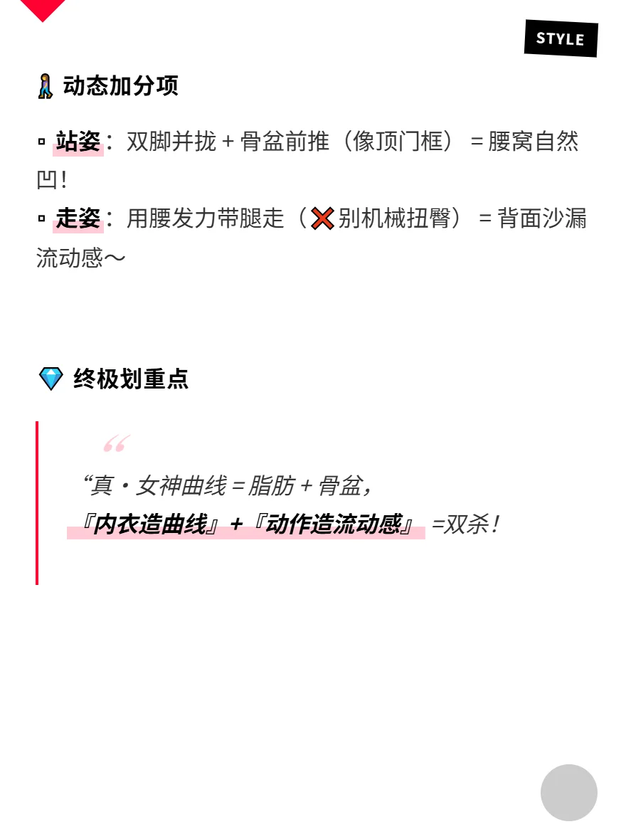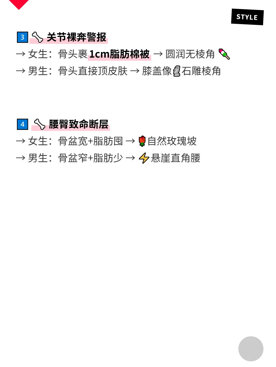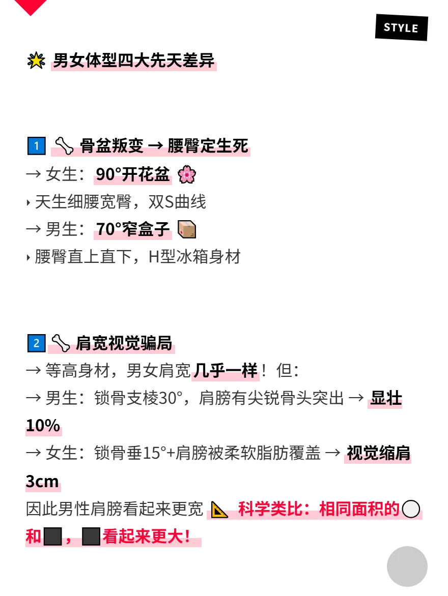 💯 重点只有一个:曲线!\n \n🌟 男女体型四大先天差异\n1⃣ 骨盆差异 → 腰臀定生死\n→ 女生:90°开花盆\n‣ 天生细腰宽臀,双S曲线\n→ 男生:70°窄盒子\n‣ 腰臀直上直下,H型身材\n \n2⃣ 肩宽视觉差异\n→ 等高身材,男女肩宽几乎相同,但:\n→ 男生:锁骨展开30°,骨骼突出 → 显壮10%\n→ 女生:锁骨下垂15°+脂肪覆盖 → 视觉缩肩3cm\n📐 科学类比:相同面积的圆形和方形,方形视觉更大\n \n3⃣ 关节脂肪差异\n→ 女生:骨骼裹1cm脂肪层 → 圆润柔和\n→ 男生:骨骼直接连接皮肤 → 棱角分明\n \n4⃣ 腰臀过渡差异\n→ 女生:骨盆宽+脂肪堆积 → 自然曲线\n→ 男生:骨盆窄+脂肪少 → 直角陡峭过渡\n \n💄 四招塑造女神曲线\n✅ 腰臀作弊三件套 → 「骨盆修饰术」\n✅ 肩部修饰 → 「锁骨柔化术」\n✅ 关节柔化 → 「骨骼模糊术」\n✅ 脂肪感营造 → 「肉感塑造术」\n \n🚶♀ 动态加分技巧\n▫ 站姿:双脚并拢 + 骨盆前推 → 凸显腰窝\n▫ 走姿:用腰发力带腿 → 背影流动感\n \n💎 核心要点\n\"真·女神曲线 = 脂肪分布 + 骨盆基础\n「服装塑形」+「动态姿态」= 双重加持\n \n#女装大佬 #骨架 #伪娘日常 #变装 #穿女装的男人 #反差 #人生困惑请回答 #a字裙 #娘娘腔 #你是男颜还是女颜