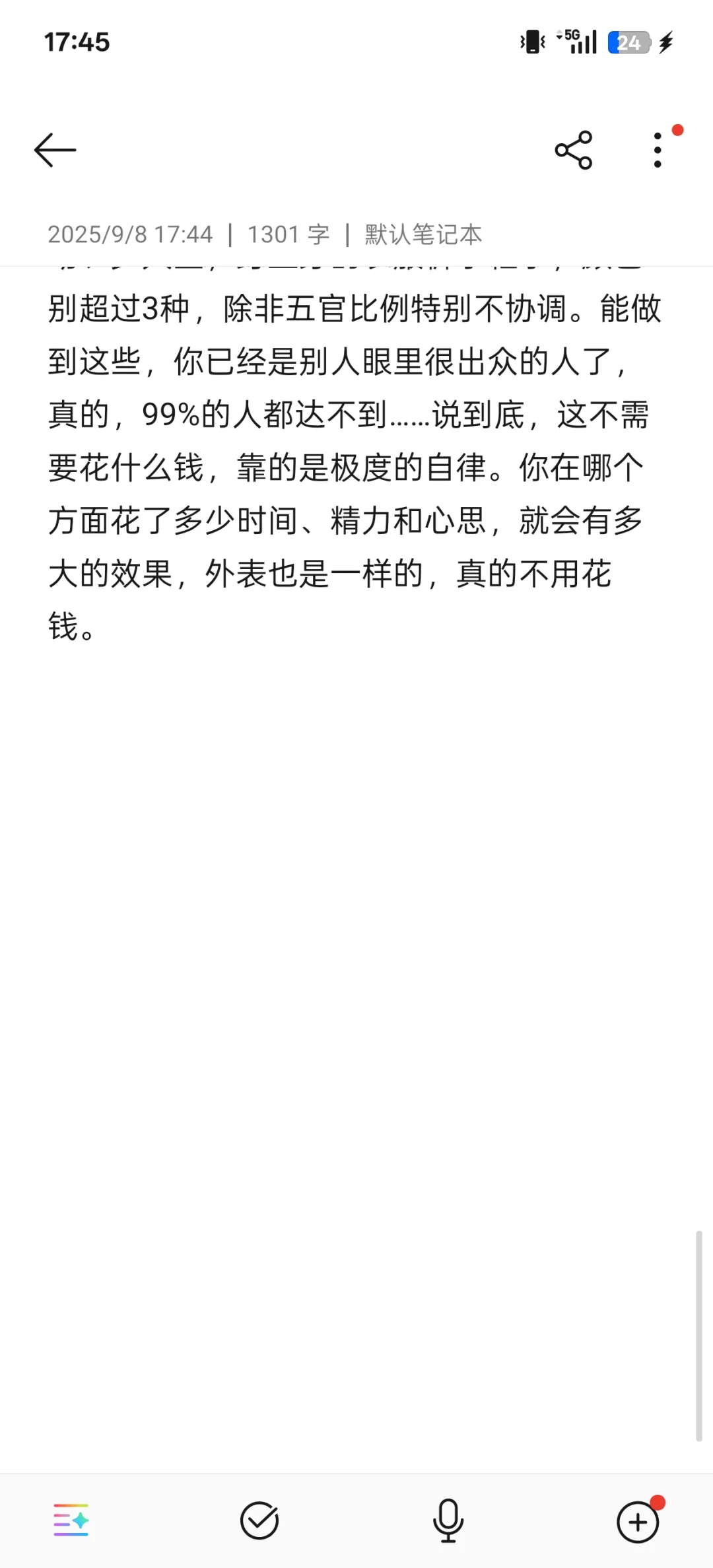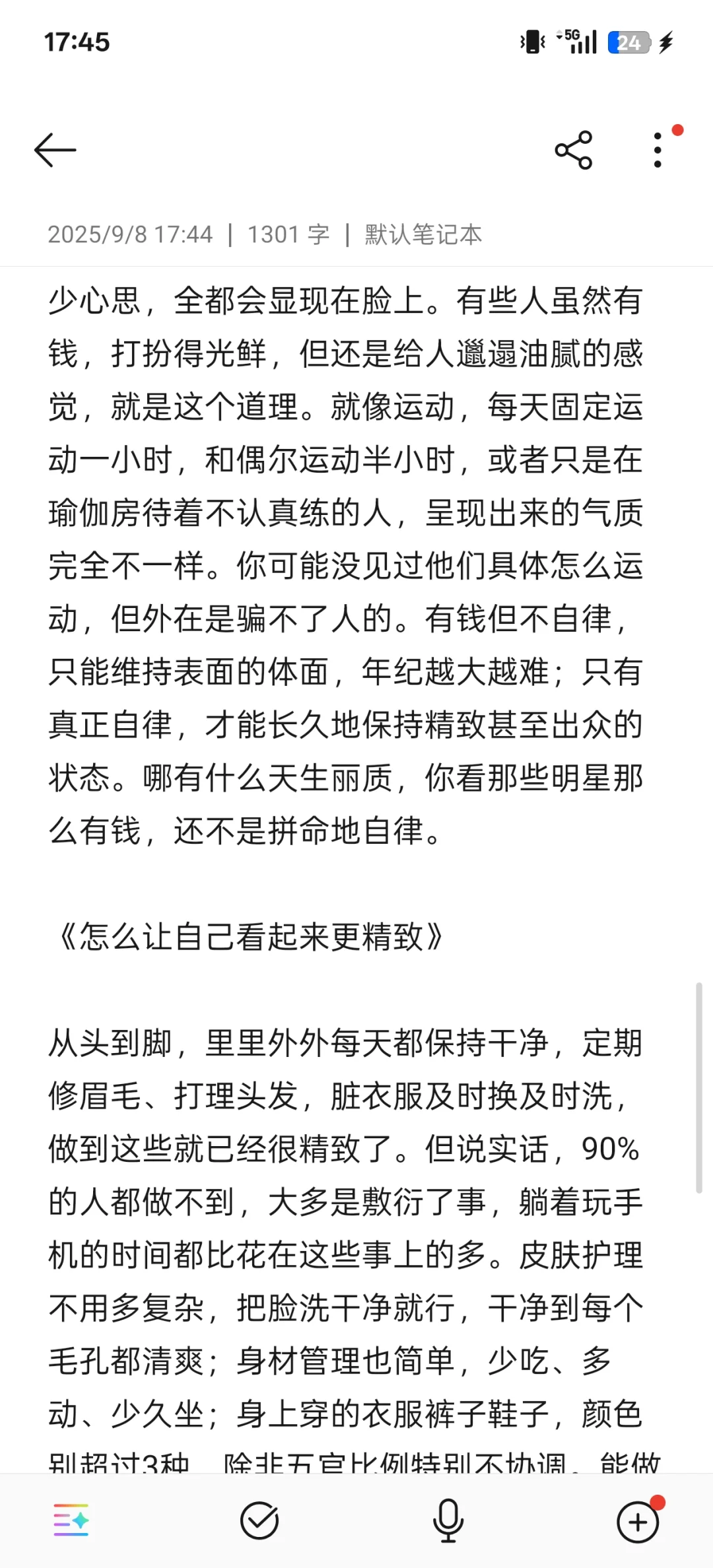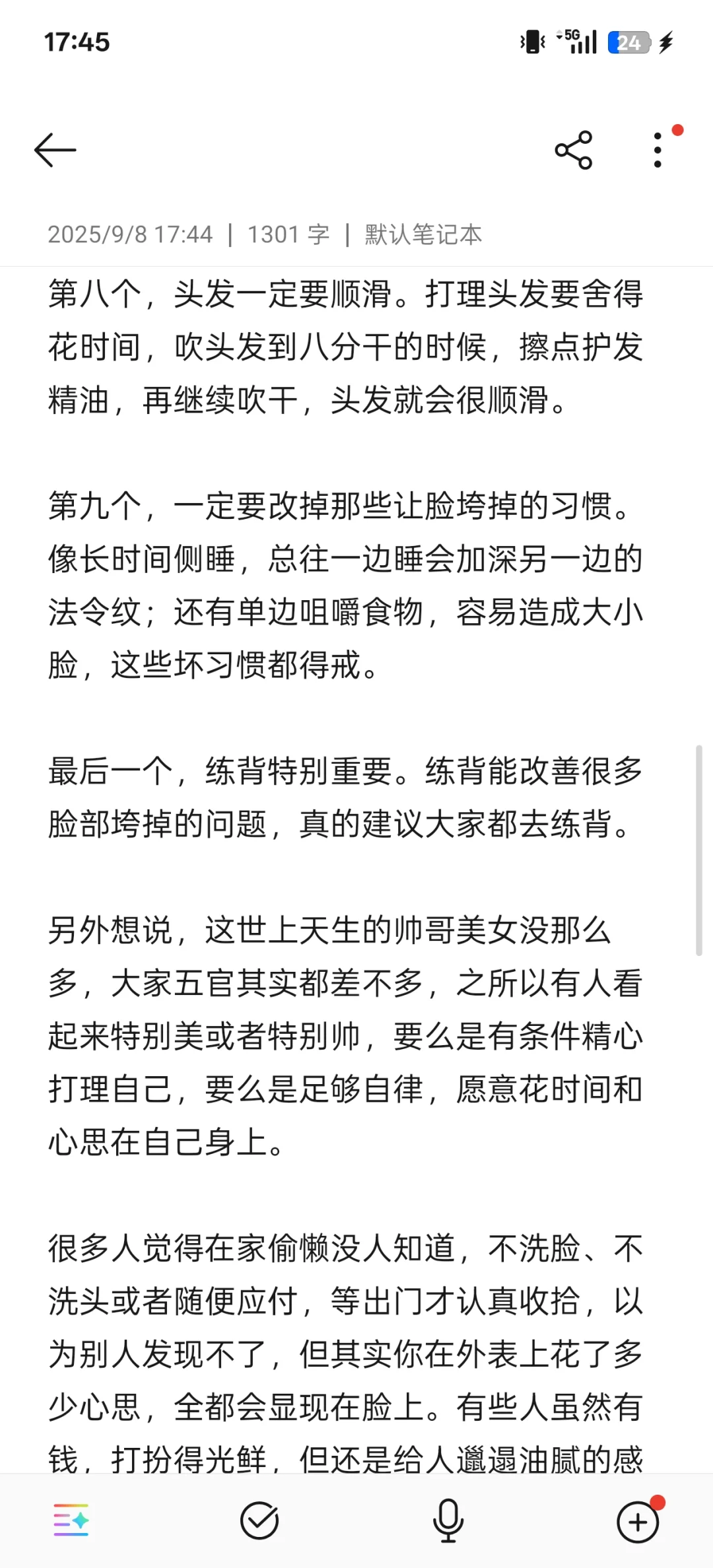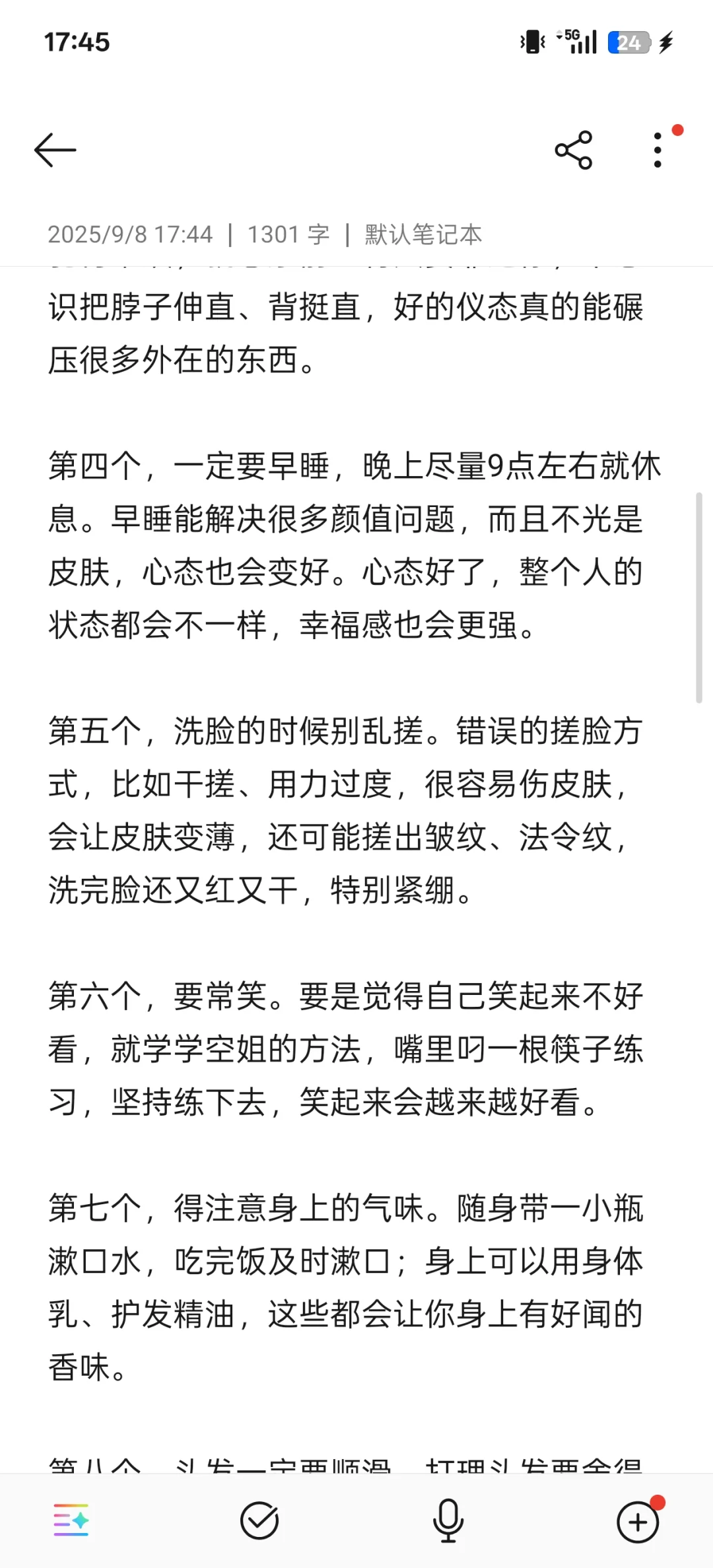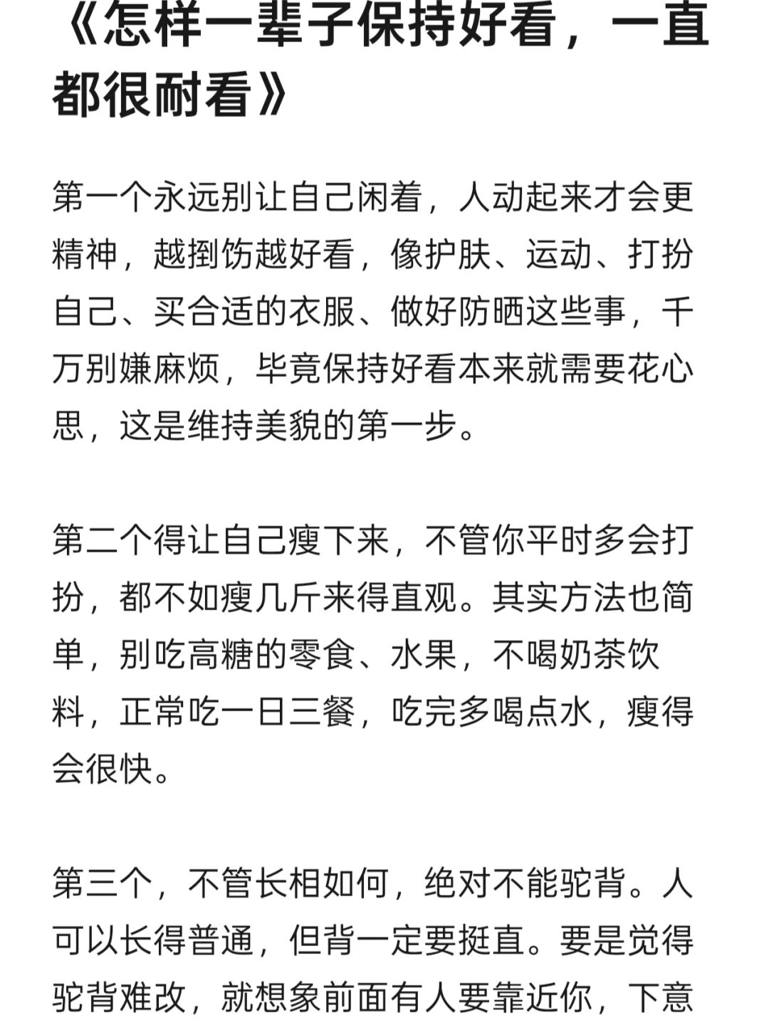 《怎样一辈子保持好看,一直都很耐看》\n第一个永远别让自己闲着,人动起来才会更精神,越捯饬越好看,像护肤、运动、打扮自己、买合适的衣服、做好防晒这些事,千万别嫌麻烦,毕竟保持好看本来就需要花心思,这是维持美貌的第一步。\n第二个得让自己瘦下来,不管你平时多会打扮,都不如瘦几斤来得直观。其实方法也简单,别吃高糖的零食、水果,不喝奶茶饮料,正常吃一日三餐,吃完多喝点水,瘦得会很快。\n第三个,不管长相如何,绝对不能驼背。人可以长得普通,但背一定要挺直。要是觉得驼背难改,就想象前面有人要靠近你,下意识把脖子伸直、背挺直,好的仪态真的能碾压很多外在的东西。\n第四个,一定要早睡,晚上尽量9点左右就休息。早睡能解决很多颜值问题,而且不光是皮肤,心态也会变好。心态好了,整个人的状态都会不一样,幸福感也会更强。\n第五个,洗脸的时候别乱搓。错误的搓脸方式,比如干搓、用力过度,很容易伤皮肤,会让皮肤变薄,还可能搓出皱纹、法令纹,洗完脸还又红又干,特别紧绷。\n第六个,要常笑。要是觉得自己笑起来不好看,就学学空姐的方法,嘴里叼一根筷子练习,坚持练下去,笑起来会越来越好看。\n第七个,得注意身上的气味。随身带一小瓶漱口水,吃完饭及时漱口;身上可以用身体乳、护发精油,这些都会让你身上有好闻的香味。\n第八个,头发一定要顺滑。打理头发要舍得花时间,吹头发到八分干的时候,擦点护发精油,再继续吹干,头发就会很顺滑。\n第九个,一定要改掉那些#养成良好的习惯 #保持年轻的方法 #神奇学习方法在这里 #让自己变好 #最好的年龄 #保持美丽的秘诀 #保持快乐的秘诀 #想要变好看