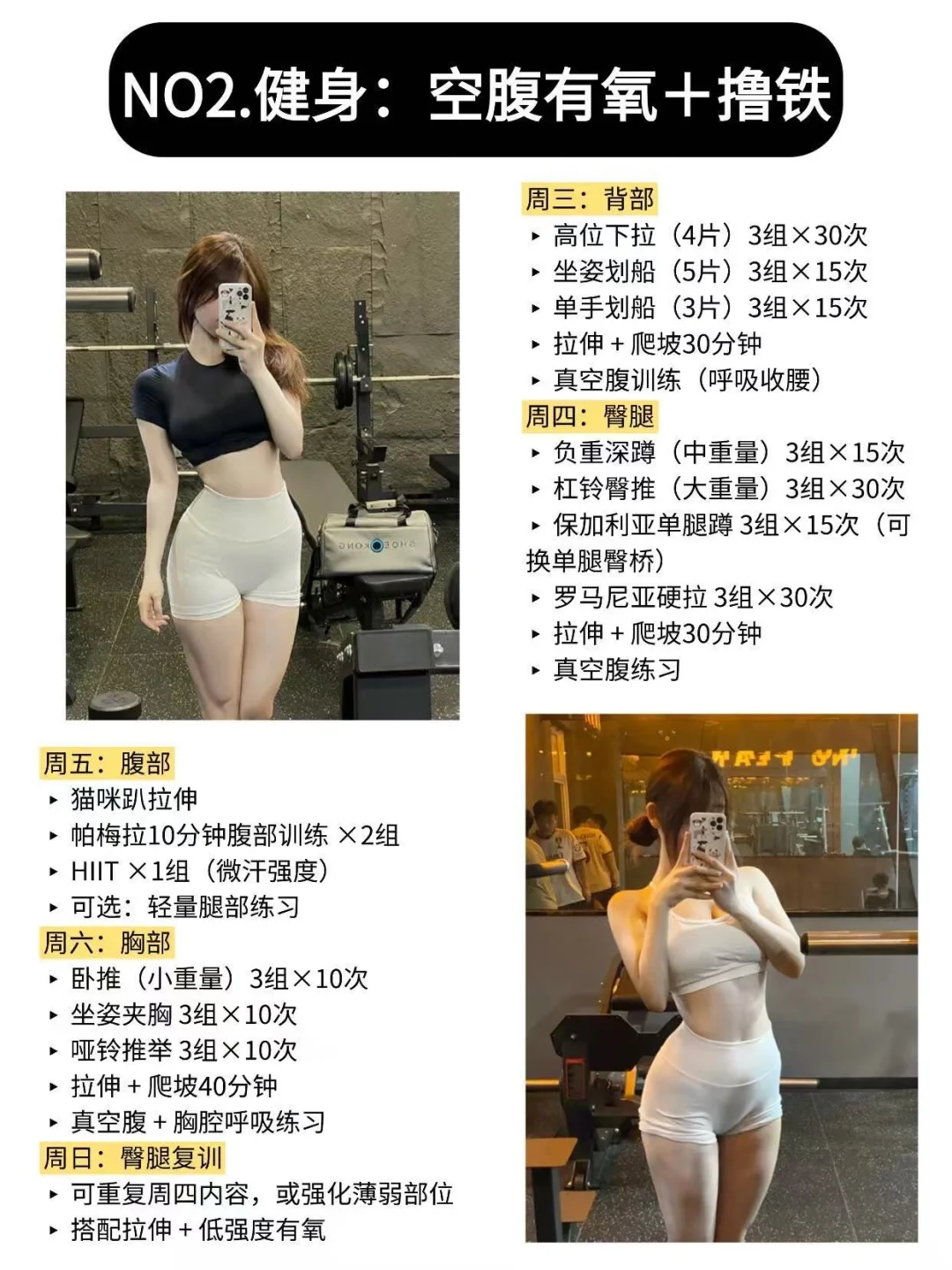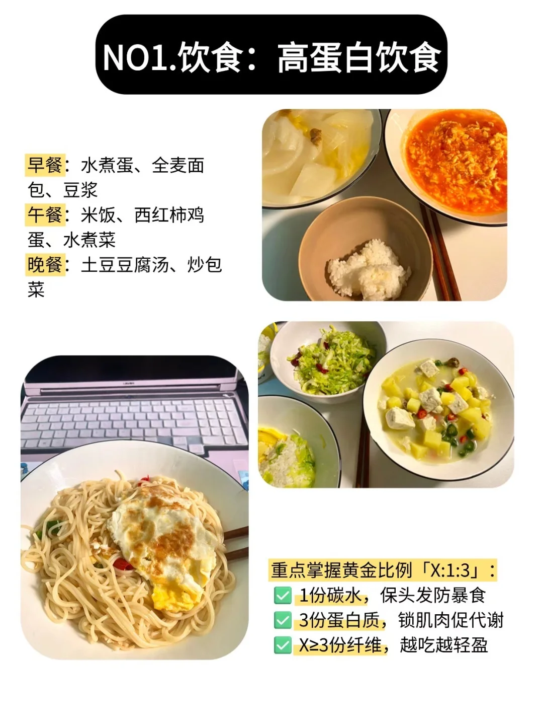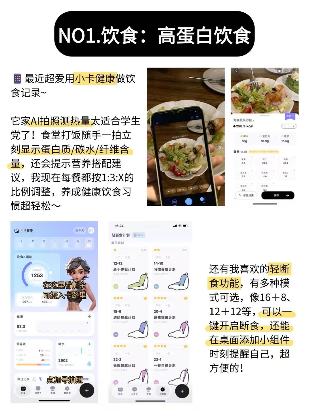 从H型身材到现在拥有明显腰臀比,穿紧身衣服时曲线真的绝了!同学都问我是不是偷偷去做了腰腹塑形\n其实真的没有~全靠这套在校也能轻松执行的「健身+高蛋白饮食」计划,之前有宝宝需要我分享健身项目今天也在这里总结好啦。\n-\nNO1.高蛋白饮食\n早餐:蛋白质\n午餐:蛋白质 碳水 膳食纤维\n晚餐:蛋白质 膳食纤维\n重点掌握黄金比例「X:1:3」:\n✅ 1份碳水,保头发防暴食\n✅ 3份蛋白质,锁肌肉促代谢\n✅ X≥3份纤维,越吃越轻盈\n📱最近超爱用小卡健康做饮食记录~\n它家AI拍照测热量太适合学生党了!随手一拍立刻显示蛋白质/碳水/纤维含量,还会提示营养搭配建议,我现在每餐都按1:3:X的比例调整,养成健康饮食习惯超轻松~\n还有我喜欢的轻断食功能,有多种模式可选,像16+8、12+12等,可以一键开启断食,还能在桌面添加小组件时刻提醒自己,超方便的!\n-\nNO2.健身:真空腹训练+有氧+撸铁\n周三:背部训练,搭配拉伸与舒缓有氧\n周四:臀腿训练,大重量雕琢搭配爬坡有氧\n周五:腹部核心,高强度间歇与深度拉伸结合\n周六:胸部训练,小重量塑形搭配持久有氧\n周日:臀腿复训,强化弱项与低强度有氧拉伸\n(具体训练计划放在图里啦~)\n健身后用小卡健康记录运动消耗,它的热量计算超精准,能让我清楚知道每日热量缺口,在校也能轻松实现科学控卡!\n现在穿短上衣配高腰裤,腰臀曲线简直不要太好看~同学们都问我是又不是瘦了。其实体重没变,但线条变得超级吸睛!姐妹们快get同款方法吧✨\n-\n#腰臀比 #零天赋新手怎么开启健身 #健身女孩 #见人不如健身 #100天运动打卡挑战#小卡健康#高蛋白饮食#健康饮食#健身食谱#健身计划分享