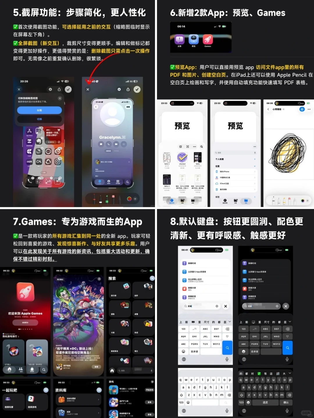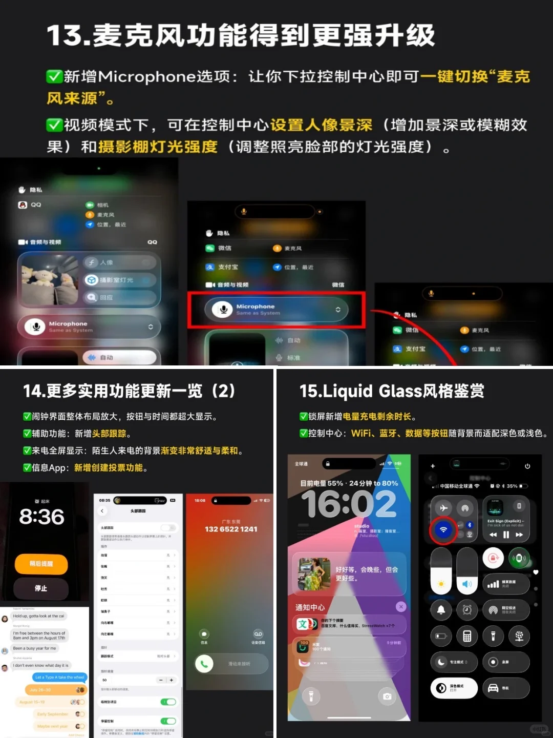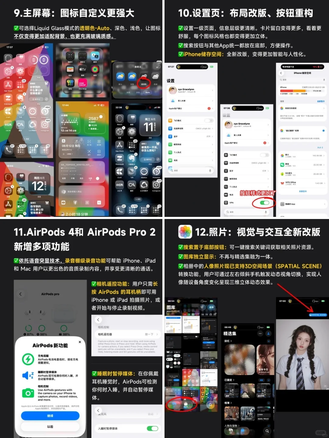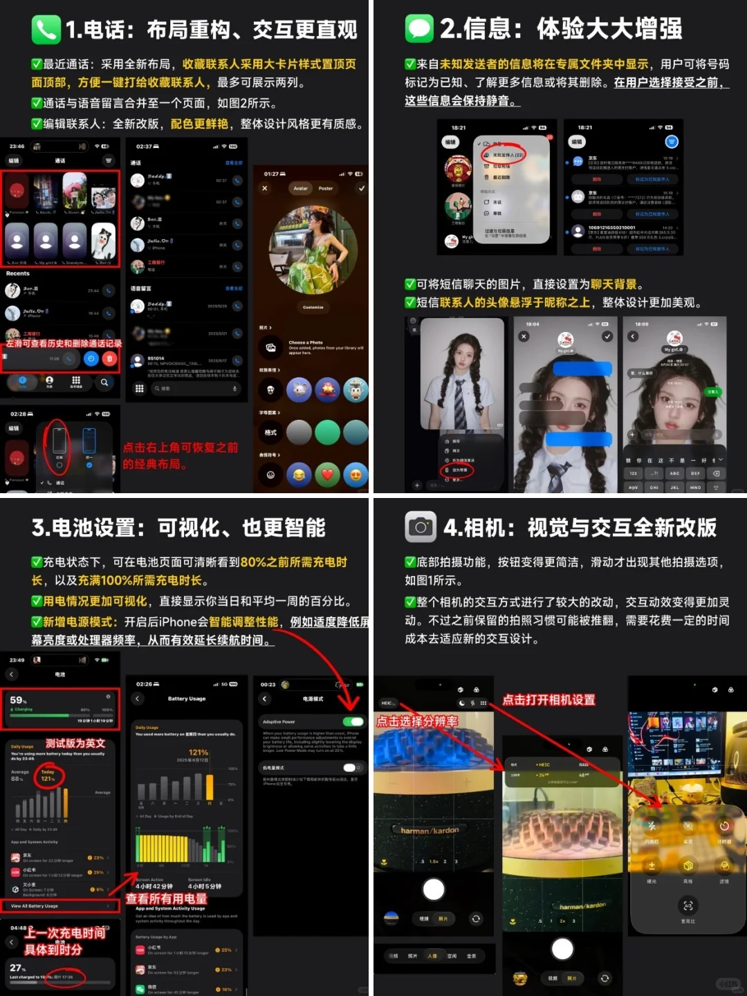 嗨,亲爱的iOS铁粉们!我知道你们早就按捺不住,尝鲜了iOS 26 Beta版吧?那个Liquid Glass设计美得让人心痒痒,今天咱们就来点硬核又实用的干货——深度挖掘40+新功能,保证让你玩转新系统如鱼得水,爱不释手!不管你是已经更新体验的老司机,还是观望中的小萌新,这篇分享都能让你大开眼界。😎\n \n先说说最抓眼球的视觉革新:主屏幕图标自定义更强大啦,风格多样到让你挑花眼;截屏功能也简化了,步骤人性化得飞起,一滑就搞定;相机App更是焕然一新,交互设计直接上档次,拍照都成享受了!📸\n \n接下来是App大升级:\n- 电话和信息App联手优化——通话界面布局重构,收藏联系人变成大卡片显示,一键拨号超直观;短信页面呢,未知联系人自动进文件夹静音处理,还能自定义聊天背景,甚至创建投票功能,沟通更智能。\n- 照片App视觉交互全改版,图库独立显示超友好,人像照片还支持3D空间场景转换,简直是魔法体验!\n \n设置方面,优化得贼贴心:\n- 电池设置可视化又智能,电量管理一目了然;\n- 设置页布局精简、按钮重构,比如iPhone储存空间细节满分;\n- 控制中心的麦克风功能爆强升级,支持模式切换、人像景深和摄影师灯光,录音玩出专业感!🎤\n \n新增亮点也不少:\n- AirPods 4和Pro 2新增多项功能,连接更丝滑;\n- 默认键盘按钮圆润、配色清新,触感提升,打字都带呼吸感;\n- 两个新App:预览和Games,简单实用,娱乐工作两不误。\n \n其他实用小彩蛋:\n- 地图体验大升级,导航更精准;\n- 相机设置加镜头清洁提示开关,贴心到家;\n- 屏幕捕捉支持HDR效果,截图录屏美翻天;\n- 闹钟界面超大显示,按钮和时间清晰夺目;\n- 辅助功能新增头部跟踪,来电全屏背景渐变柔和舒适,细节满满!\n \n怎么样,这些功能够炸裂吧?左滑看图解锁全部细节,保证让你系统体验飙升几个level!💡\n#系统更新 #ios26 #ios26体验 #iOS26 #iOS26更新 #ios26新功能 #iOS26新功能 #iOS更新 #ios26测试版 #iphone使用小技巧 #iphone电话 #iPhone新功能 #airpods4