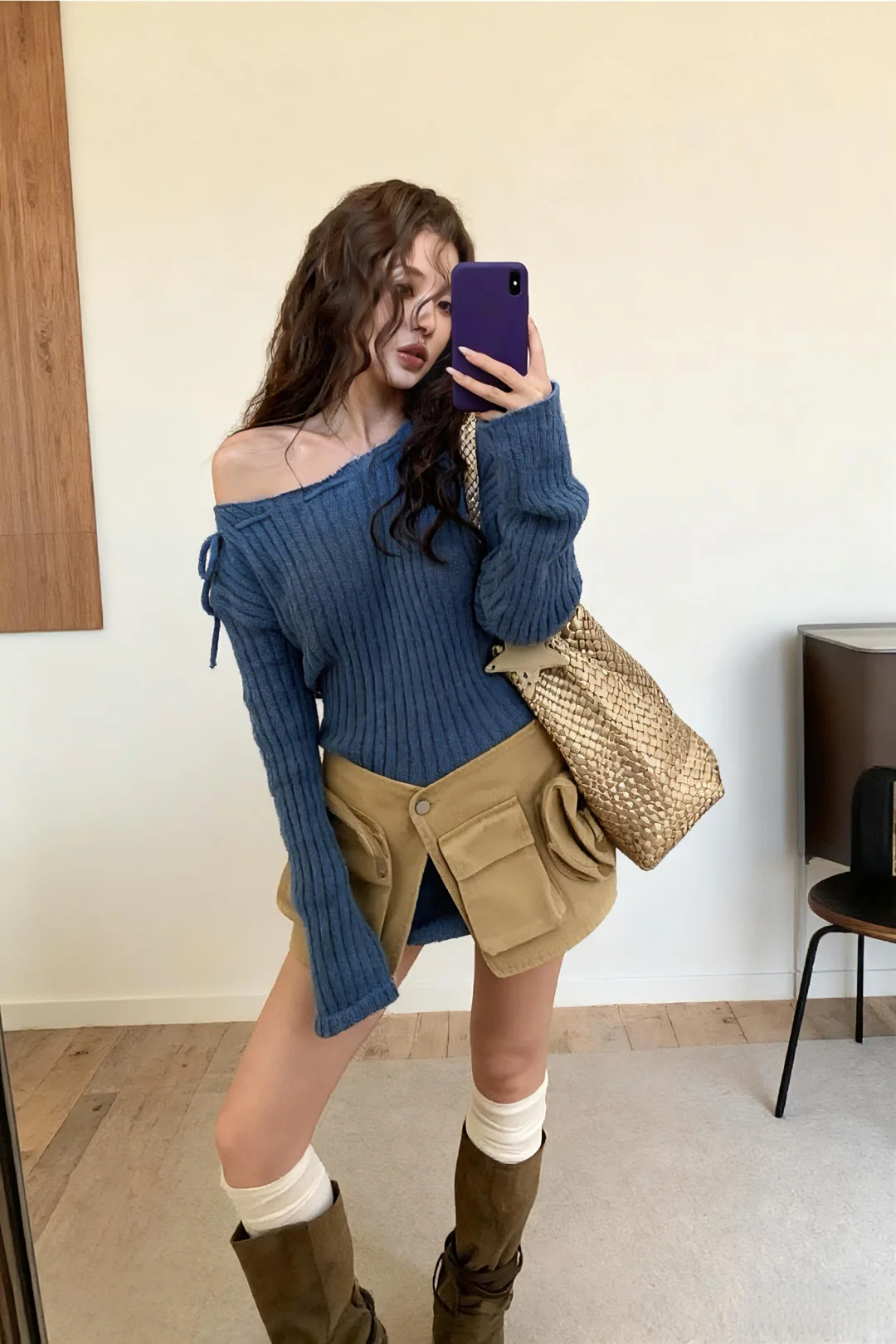 复古甜辣风穿搭|露肩毛衣+工装元素短裙
