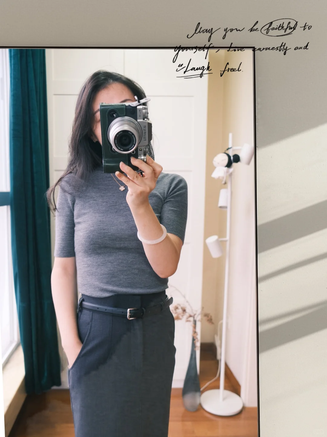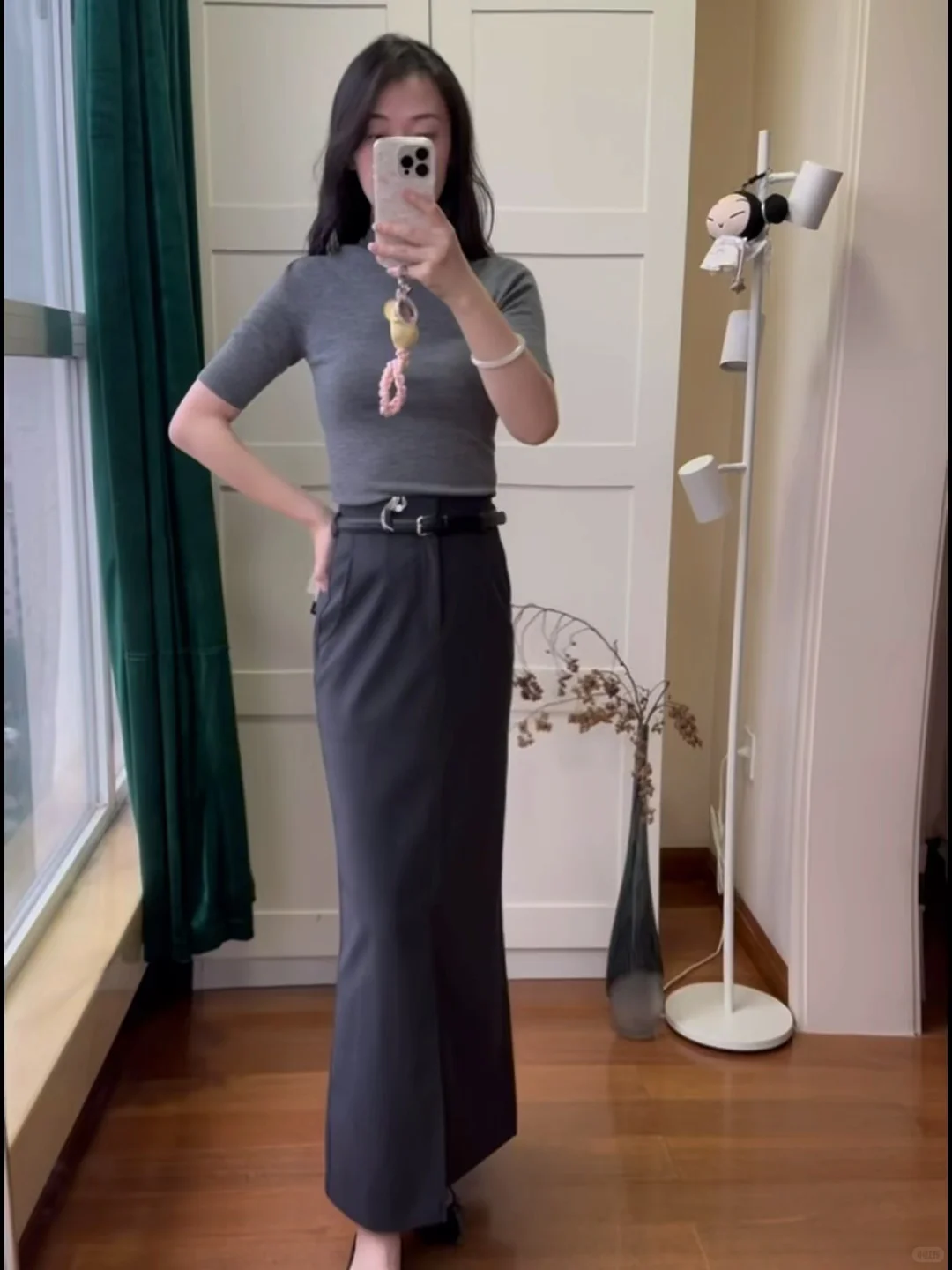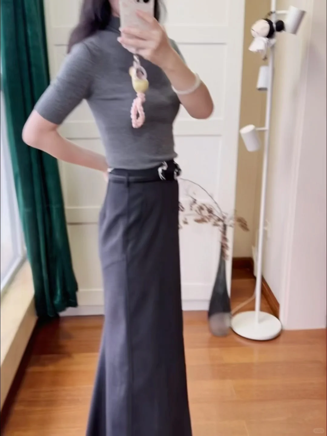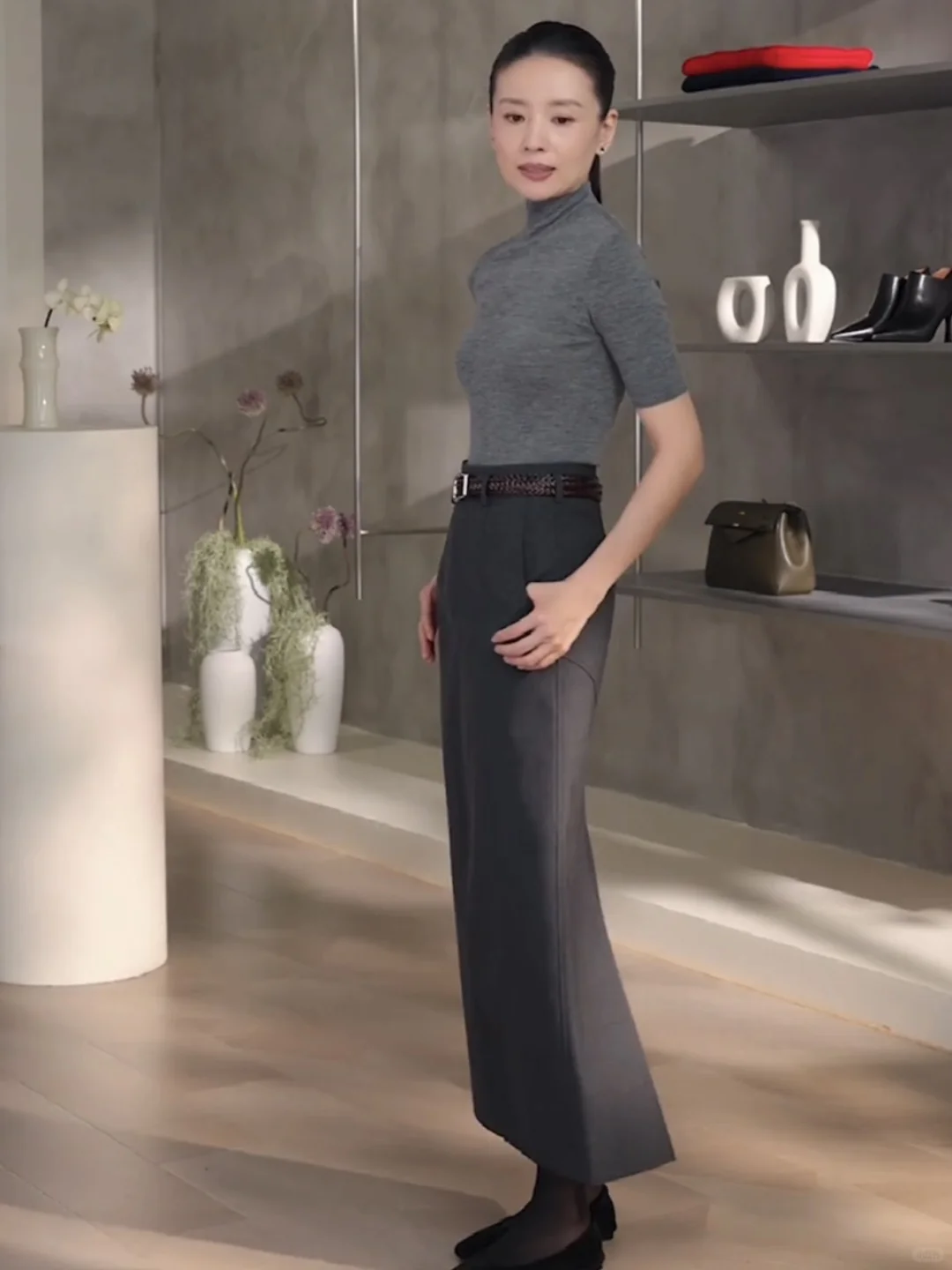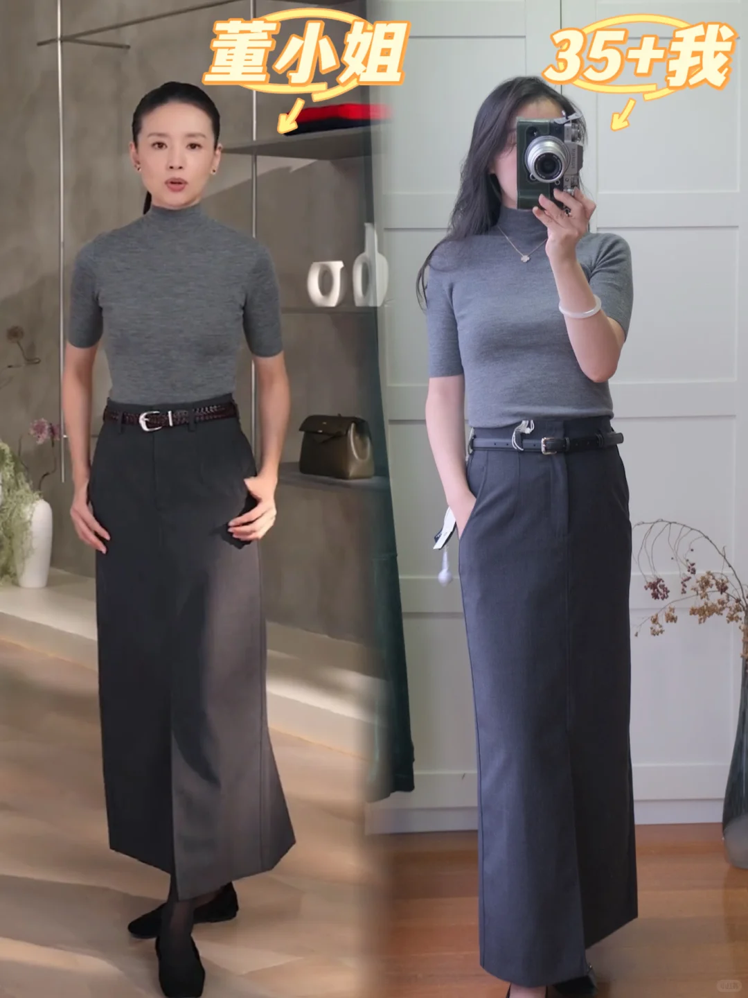 ZHIZHI品牌的气质一直是很有东方韵味,显得人很修长很女人,但同时小肚子的问题也就来了哦。\n无缝打底上衣\n💗【材质】100%羊毛,密度很高,能机洗,这点深得我心\n💗【版型】紧身半高领,很气质,经典简约风,很好搭配。\n💗【颜色】秋冬就是比较喜欢灰色这种冷调内敛的颜色,\n设计感十足的裙子\n💗【设计】裙子的设计真是很哇塞~~前开叉后面是鱼尾设计,PS般的修长。\n💗【材质】虽然裙子是45%羊毛,但我还是觉得面料有些硬挺,和我想象的不一样,可能为了追求版型挺阔吧。再配一双高跟鞋,冷一些搭配风衣和黑丝,应该更好看。\n如果你也喜欢高智感,那么这一套写着你的名字\n \n再次声明图六七是官网的模特图,不是盗取其他博主的,审核员不要判违规啊\n#董洁 #董生活直播间 #董生活 #实用穿搭 #质感穿搭 #跟着明星学穿搭 #气质穿搭 #开箱测评 #理性种草理性拔草 #董洁推荐