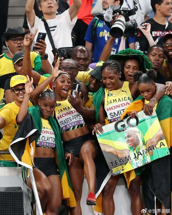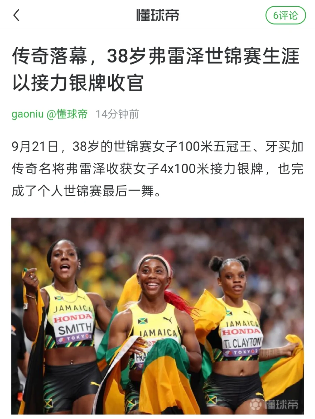 9月21日,38岁的世锦赛女子100米五冠王、牙买加传奇名将弗雷泽收获女子4x100米接力银牌,也完成了个人世锦赛最后一舞。\n \n在这场与美国短跑双料冠军杰斐逊-伍登的正面对决中,38岁的弗雷泽担任牙买加队首棒。她成功守住优势,在与蒂亚-克莱顿交接棒时仍保持领先地位。\n \n弗雷泽说道:“由我开启最后一战,并将接力棒交给这些年轻的后起之秀,堪称完美,我为她们创造了争金机会,这正是我最终的目标。”\n \n在九届世锦赛征程中,弗雷泽共获得10金6银1铜。虽然艾莉森-费利克斯(20枚)的奖牌总数更多,但“火箭妈妈”仍以6枚个人项目金牌保持着世锦赛个人金牌数最高纪录。\n#体育的魅力 #体育精神无国界 #体育赛事 #体育运动 #体育精神生命在运动中延续