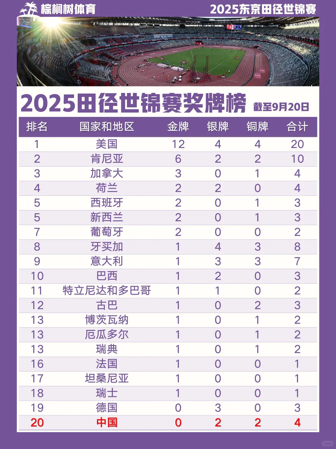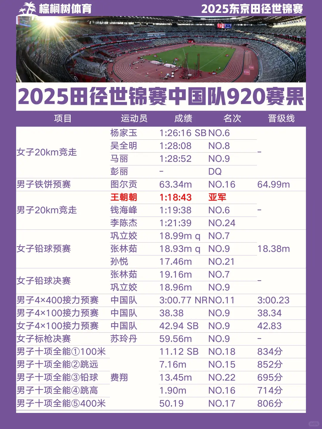 2025东京田径世锦赛第8比赛日结束,中国男子20km竞走王朝朝摘银,中国队2银2铜奖牌榜暂列第20位\n \n男子20公里竞走\n王朝朝 1:18:43 惊喜摘银!\n第6名 钱海峰 1:19:38\n第24名 李陈杰 1:21:39\n中国竞走,依然可靠\n \n女子20公里竞走\n第6名 杨家玉 1:26:16(SB)\n第8名 吴全明 1:28:08\n第9名 马丽 1:28:52\n彭丽 DQ\n虽未夺牌,但三人跻身前十\n \n女子铅球决赛\n第7名 张林茹 19.16m\n第9名 巩立姣 18.96m\n致敬姣姐坚持,中国力量继续加油\n \n女子标枪决赛\n第9名 苏玲丹 59.56m\n戴倩倩未进决赛\n值得一提的是,我国小将严子怡本赛季SB成绩达65.89m,若参赛有望冲金\n \n【其余项目赛果】\n男子铁饼预赛\n图尔贡 63.34m(第16名 | 晋级线64.99m)\n \n男子4×400米接力预赛\n中国队 3:00.77(刷新全国纪录!NR)第11名\n \n男子4×100米接力预赛\n中国队 38.38(第9名 | 差0.04秒晋级)\n \n女子4×100米接力预赛\n中国队 42.94(SB | 第9名 | 差0.11秒晋级)\n \n男子十项全能(5项完赛)\n明日继续后半程比拼!\n \n【奖牌榜速递】\n中国🇨🇳代表团:2银2铜 暂列奖牌榜第20位\n美国🇺🇸(20枚)\n肯尼亚🇰🇪(10枚)\n加拿大🇨🇦(4枚)领跑\n \n这一天,我们有银牌的喜悦,也有多个“第九”的遗憾。\n但体育竞技的魅力,正在于悬念与拼搏共存。\n王朝朝的银牌证明了中国竞走的底蕴,接力队刷新纪录值得喝彩!\n \n明日费翔将继续出战十项全能,期待完赛完美收官!\n \n#小红书赛事追击团 #田径世锦赛 #2025东京田径世锦赛中国队赛程 #世锦赛观赛指南 #中国田径