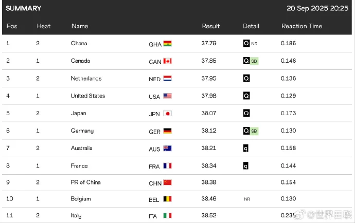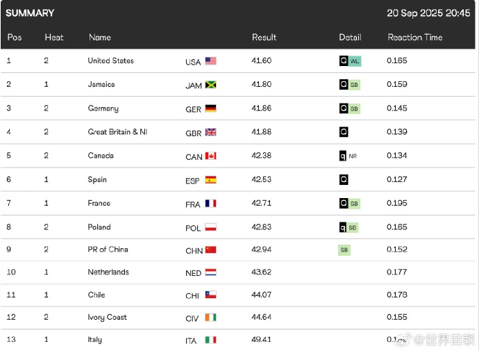 北京时间9月20日,东京田径世锦赛进入倒数第二个比赛日晚场的争夺。接力项目在今天晚间的东京国立竞技场径赛跑道上相继登场。\n在男子4x100米接力预赛中,由邓智舰、何锦櫶、施君豪、谢震业组成的中国男子接力队跑出38秒38,排名预赛第2组第五位,总排名第九,距离晋级线仅差0.04秒,遗憾无缘决赛。\n在稍后进行的女子4x100米接力预赛中,中国队派出梁小静、李玉婷、朱俊颖和陈妤颉出战。四位姑娘全力发挥,最终跑出42秒94的赛季最好成绩,但遗憾总排名同样第九,距离晋级线相差0.11秒,遗憾止步预赛。