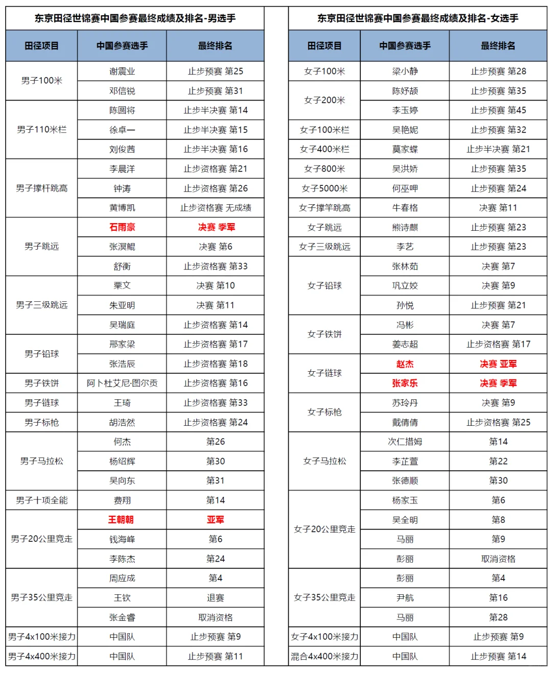 东京田径世锦赛中国选手最终成绩单及总结