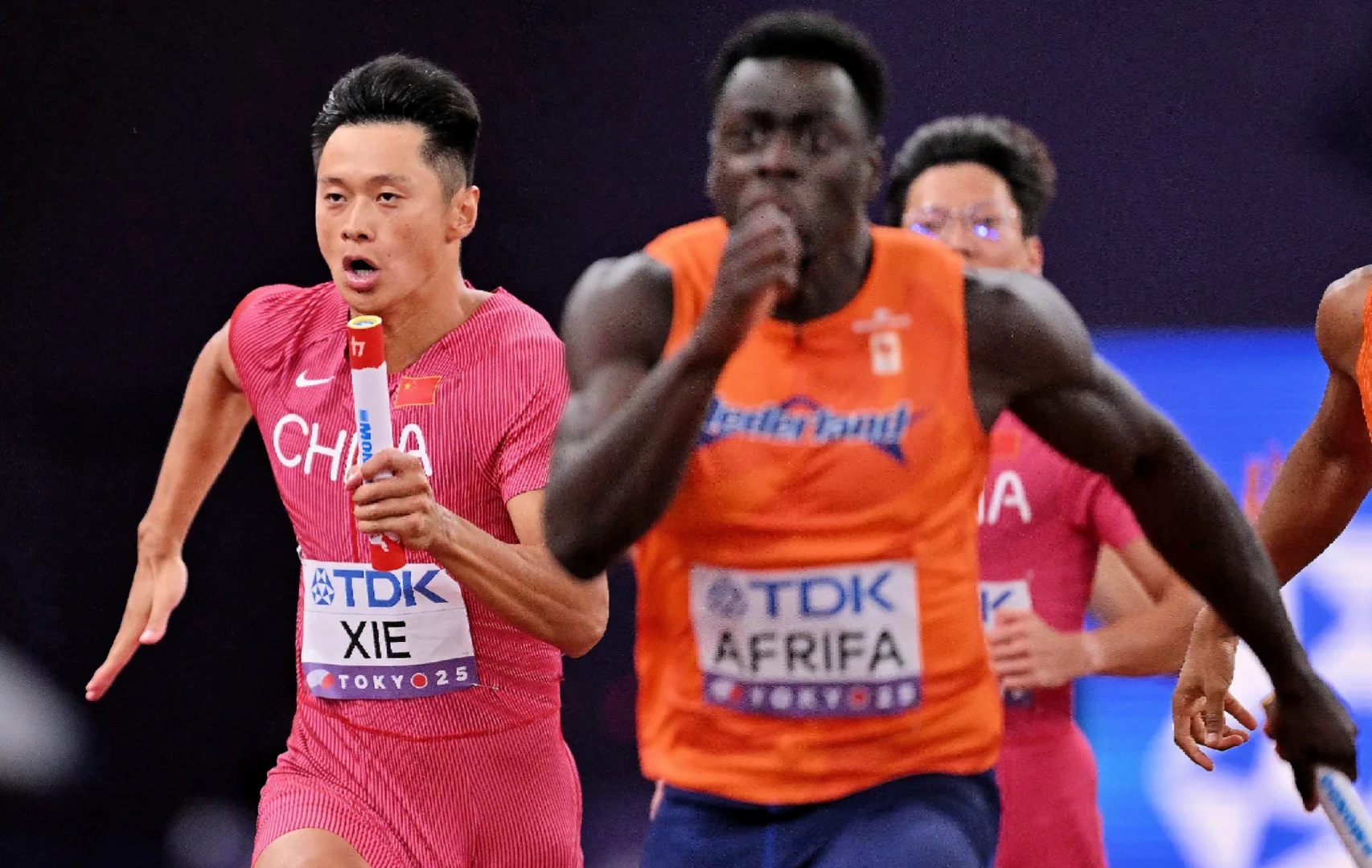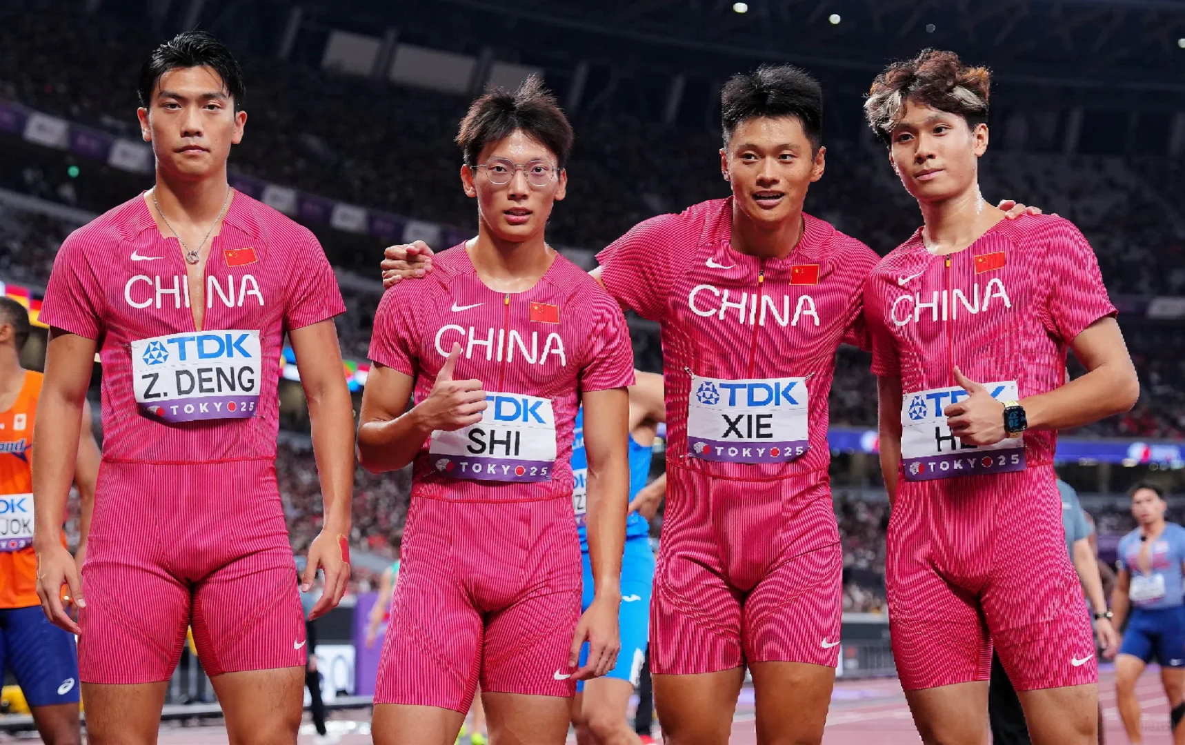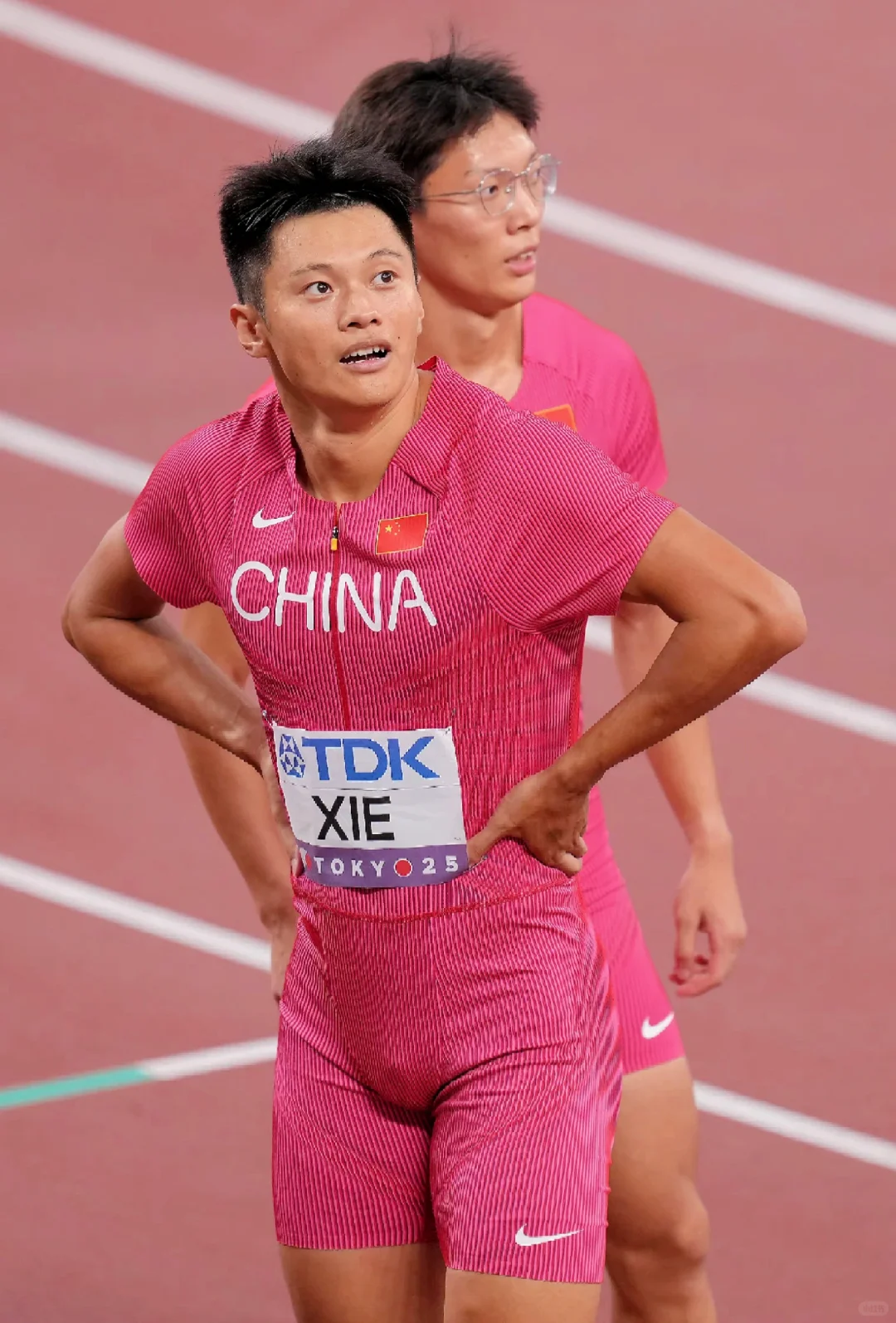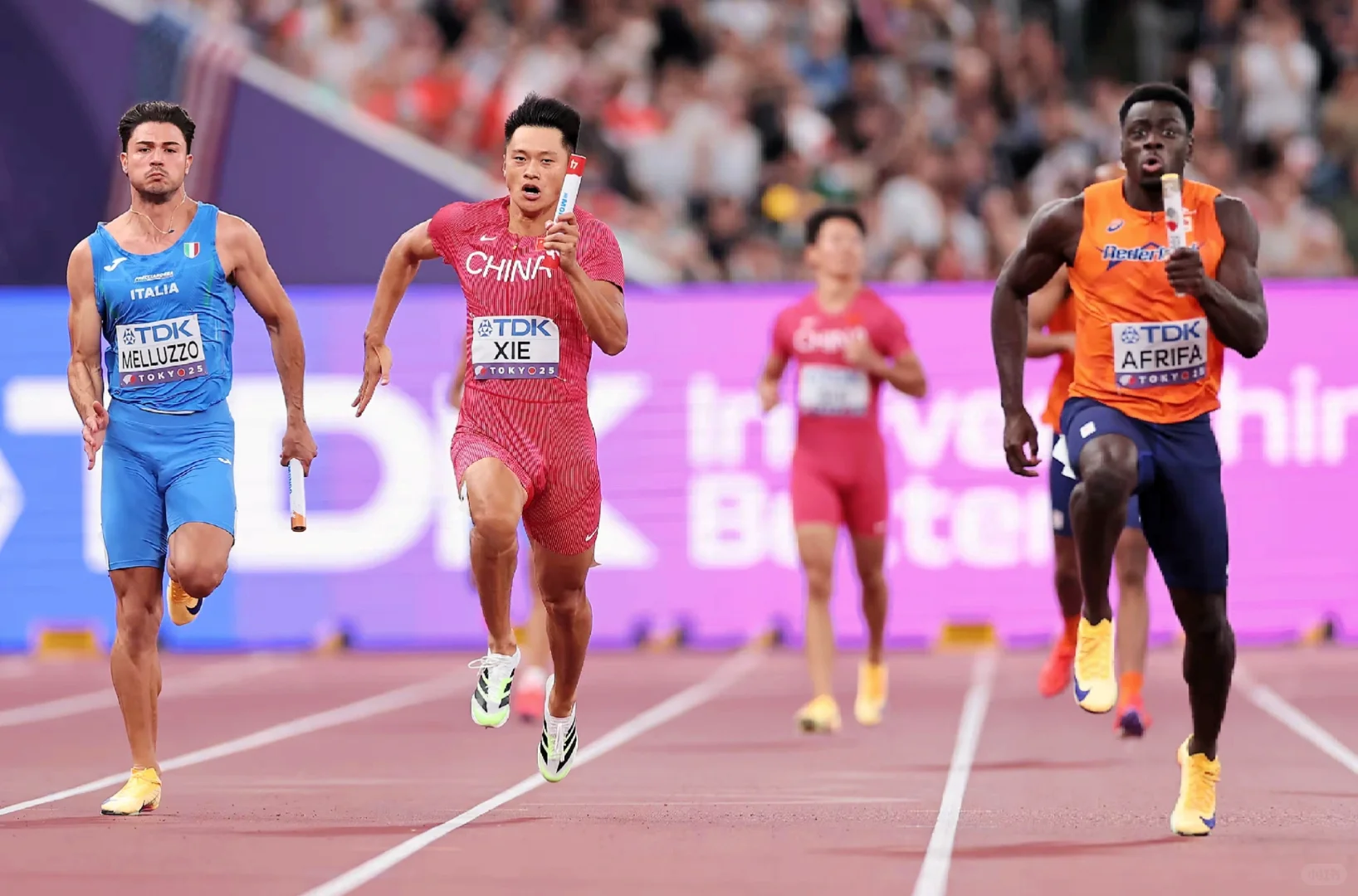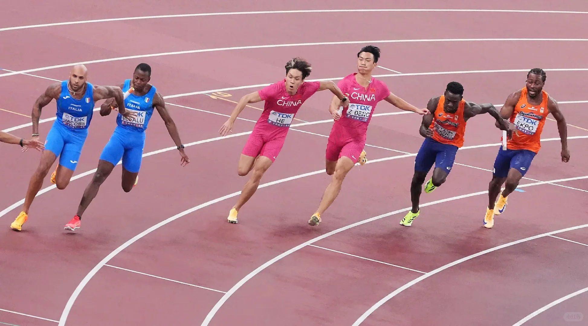 毫厘之间的遗憾,中国短跑在新老交替中砥砺前行。\n \n北京时间9月20日晚,2025年东京田径世锦赛男子4×100米接力预赛中,由中国选手邓智舰、何锦櫶、施君豪和谢震业组成的中国队跑出38秒38的成绩,位列小组第五,总成绩排名第九位。\n \n由于只有每组前三位和两个成绩最好的队伍可以晋级决赛,中国队以0.04秒的微弱差距遗憾无缘决赛。第八名的法国队成绩为38秒34,仅领先中国队0.04秒。\n \n01 比赛表现:稳定中的细微失误\n \n中国队被分在预赛第二组第4道出发。比赛过程中,前三位选手表现稳定:第一棒邓智舰迅速加速,一二棒交接顺利完成;第二棒何锦櫶全力冲刺,二三棒交接也非常顺利;第三棒施君豪同样表现稳定。\n \n但在最后一棒交接时出现轻微失误,谢震业起步后略有降速,尽管最终全力冲刺,但仍以小组第五名完赛。\n \n02 晋级队伍:惊喜与意外并存\n \n中国队所在的第二小组中,加纳队以37秒79获得小组第一,荷兰队37秒95位列第二,日本队38秒07排名第三,均直接晋级决赛。\n \n澳大利亚队以38秒21获得小组第四,也取得了晋级资格。另一小组的晋级队伍包括加拿大队、美国队、德国队和法国队。\n \n夺冠热门牙买加队以及英国队和南非队均因交接棒失误未能完成比赛,无缘决赛。\n \n03 女子接力同样遗憾\n \n在女子4×100米接力预赛中,由梁小静、李玉婷、朱俊颖和陈妤颉组成的中国队跑出42秒94的成绩,刷新赛季最佳,但同样排名总成绩第九位,以0.11秒之差无缘决赛。\n \n04 未来可期\n \n虽然中国队无缘决赛,但这次比赛展现了中国短跑新生代的力量。队员中的施君豪19岁,何锦櫶仅为18岁,他们在与国际强队的交锋中展现出超越年龄的成熟。\n \n此次世锦赛是2028洛杉矶奥运会周期的首届田径世锦赛,中国接力队的表现值得期待。\n \n中国田径队在此次世锦赛上完成了新老交替。男子4×100米接力全无国际大赛经验的年轻队伍跑出的成绩,甚至超越了前辈们在巴黎奥运会创下的最佳成绩。\n \n0.04秒的差距是短暂的遗憾,但更是未来的动力。中国短跑正在积蓄力量,期待在2028洛杉矶奥运会周期迎来新的突破。\n图源:新华社\n#小红书赛事追击团 #体育运动 #中国田径 #体育 #短跑 #体育精神 #中国田径队 #东京田径世锦赛 #4x100米接力