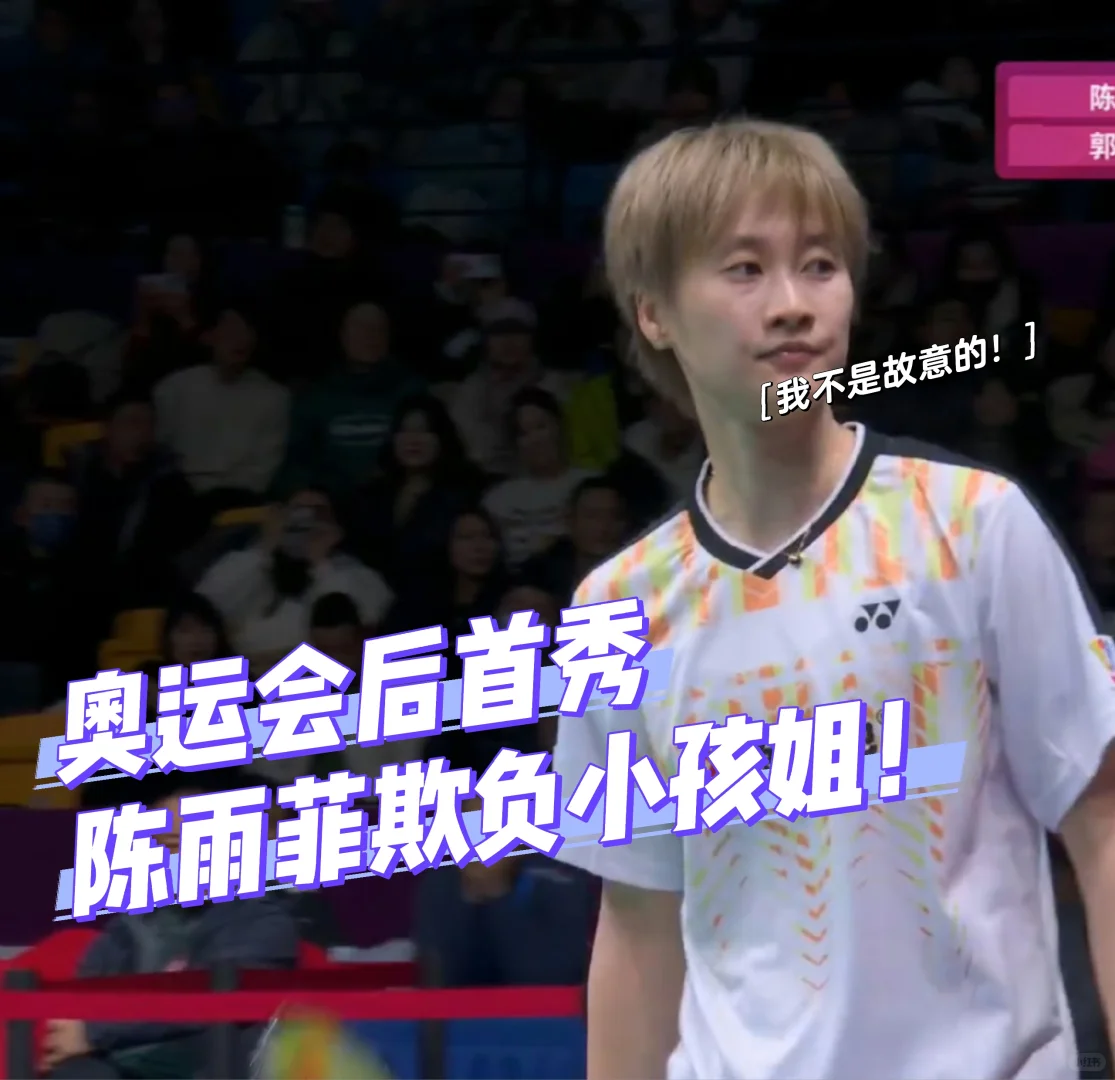 #陈雨菲回归赛场 👏🏻👏🏻👏🏻\n非常开心看到国羽一姐#陈雨菲 回归👏🏻👏🏻👏🏻\n奥运会后菲菲就想退役了(被劝了)…\n出去留了个短学…\n奥运会后4个多月,终于又可以在赛场上见到了!\n这首秀给小孩姐#郭业鸿 上了一课!\n菲姐残暴的送了个“1、2、3”…\n结束的时候都扁嘴了(你才14就跟奥运冠军交手了耶!加油!小孩姐!期待几年后能在国家队见到你)\n也期望菲菲能如己愿,享受赛场,延续更长的职业生涯!\n#陈雨菲奥运会后首秀