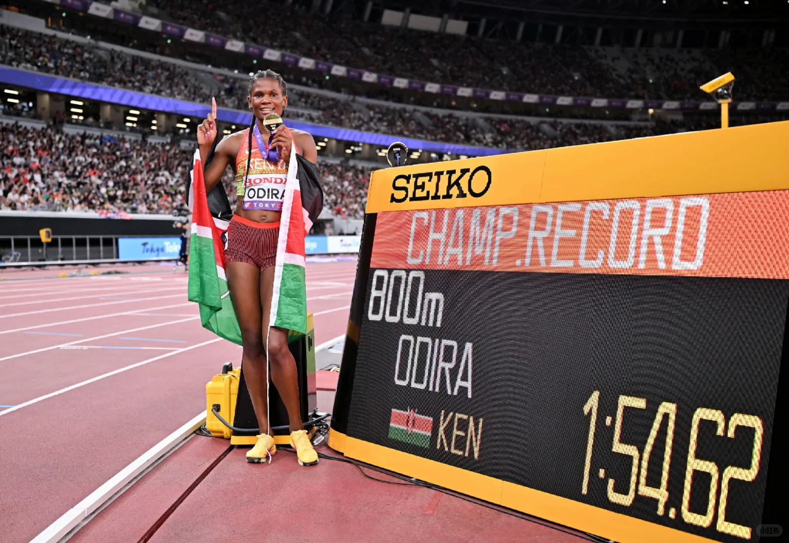 终点线前,肯尼亚选手莉莲·奥迪拉如离弦之箭般超越两位英国名将,东京国立竞技场为之沸腾。\n \n2025年世界田径锦标赛女子800米决赛9月21日在东京上演一场惊天逆转。肯尼亚选手莉莲·奥迪拉(Lilian Odira)在最后冲刺阶段超越两位英国选手,以1分54秒62的成绩夺得冠军,并创造了新的世锦赛纪录。\n \n这是奥迪拉个人的首个世界大赛冠军。\n \n01 比赛进程:最终冲刺的惊天逆转\n \n比赛开始后,卫冕冠军玛丽·莫拉(Mary Moraa)率先领跑,奥运会冠军基利·霍奇金森(Keely Hodgkinson)紧随其后。\n \n第一圈由莫拉控制节奏,霍奇金森紧紧跟随。在比赛还剩300米时,两位顶尖选手开始加速,但原本位于队伍稍后位置的奥迪拉也同时启动。\n \n进入最后直道,莫拉速度开始下降,霍奇金森奋力拼搏最后100米。就在此时,奥迪拉从外道大步超越,最终以1分54秒62的成绩冲过终点。\n \n02 奖牌分布:肯尼亚与英国的较量\n \n英国选手乔治亚·亨特-贝尔(Georgia Hunter-Bell)以1分54秒90的个人最好成绩获得银牌。\n \n她的队友霍奇金森以0·01秒之差屈居季军,成绩为1分54秒91。这是霍奇金森继巴黎奥运会夺冠后的一次卫冕战失利。\n \n肯尼亚队在这场比赛中展现了其中长跑领域的强大实力。奥迪拉的胜利标志着肯尼亚包揽了本届世锦赛全部6枚女子中长跑金牌。\n \n03 中国选手:止步预赛期待未来\n \n中国选手吴洪娇参加了女子800米预赛,被分在第5组的她跑出了2分01秒38的成绩,排名小组第六,无缘半决赛。\n \n赛后吴洪娇表示:“我的预期是在这样的世界大赛舞台上,能够突破2分大关。”她表示能够参加世锦赛非常幸运,并期待下届在北京举行的世锦赛能够有更好表现。\n \n女子800米预赛共分七个小组进行,每个小组前三名直接晋级,剩余的三个最好成绩替补晋级。\n \n奥迪拉在赛后表示:“800米比赛总是很有战术性,我没有任何期望,只是跟着比赛节奏跑。这是我第一次参加世锦赛,真的非常感激能够以世界冠军的身份离开这里。”\n \n三位奖牌获得者的成绩均突破了1分55秒大关,展示了女子800米比赛水平的整体提升。\n \n本届世锦赛上,肯尼亚展示了在中长跑领域的绝对统治力,包揽了从女子800米到马拉松全部六个中长跑项目的金牌。\n#小红书赛事追击团 #体育运动 #中国田径 #体育 #中长跑 #田径运动员 #体育精神 #金牌 #东京田径世锦赛 #生活美学