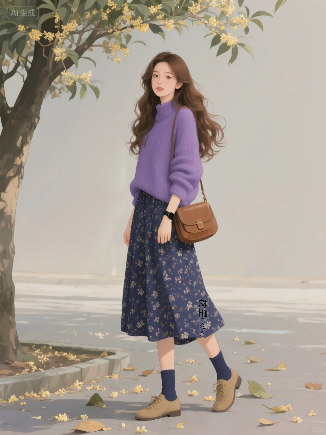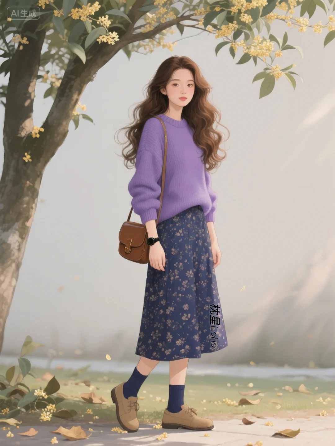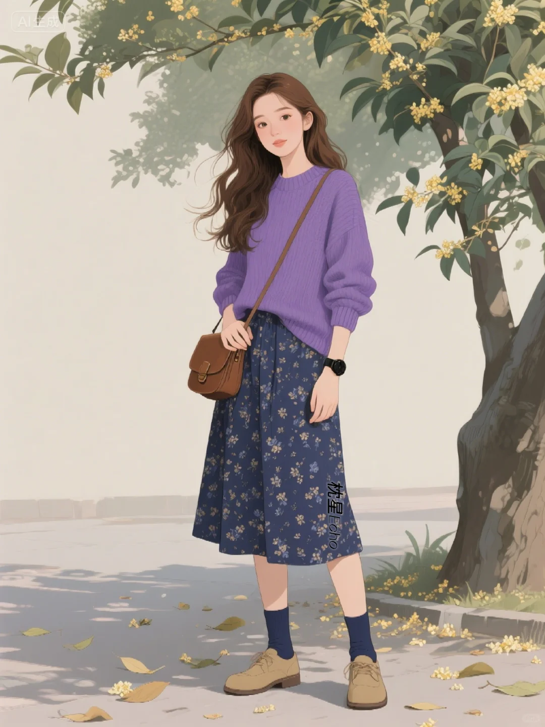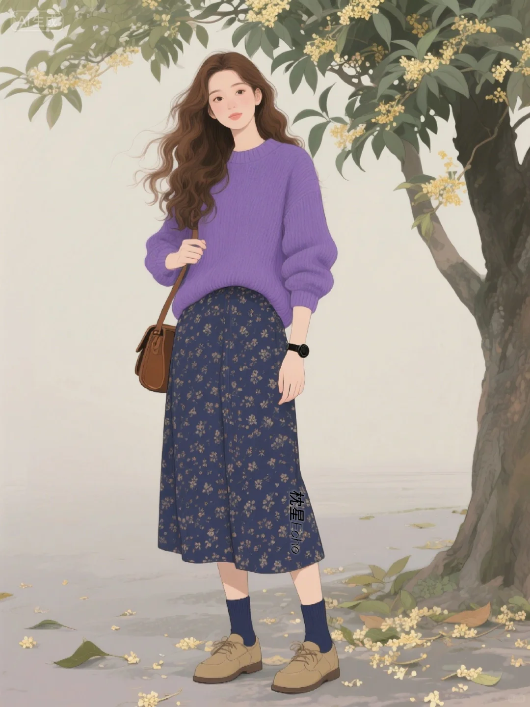 #秋季穿搭 #AI插画 #治愈系插画 #早秋穿搭 #穿搭 #日常穿搭 #穿搭插画 #碎花裙 #桂花满地便知秋已到 #高清壁纸