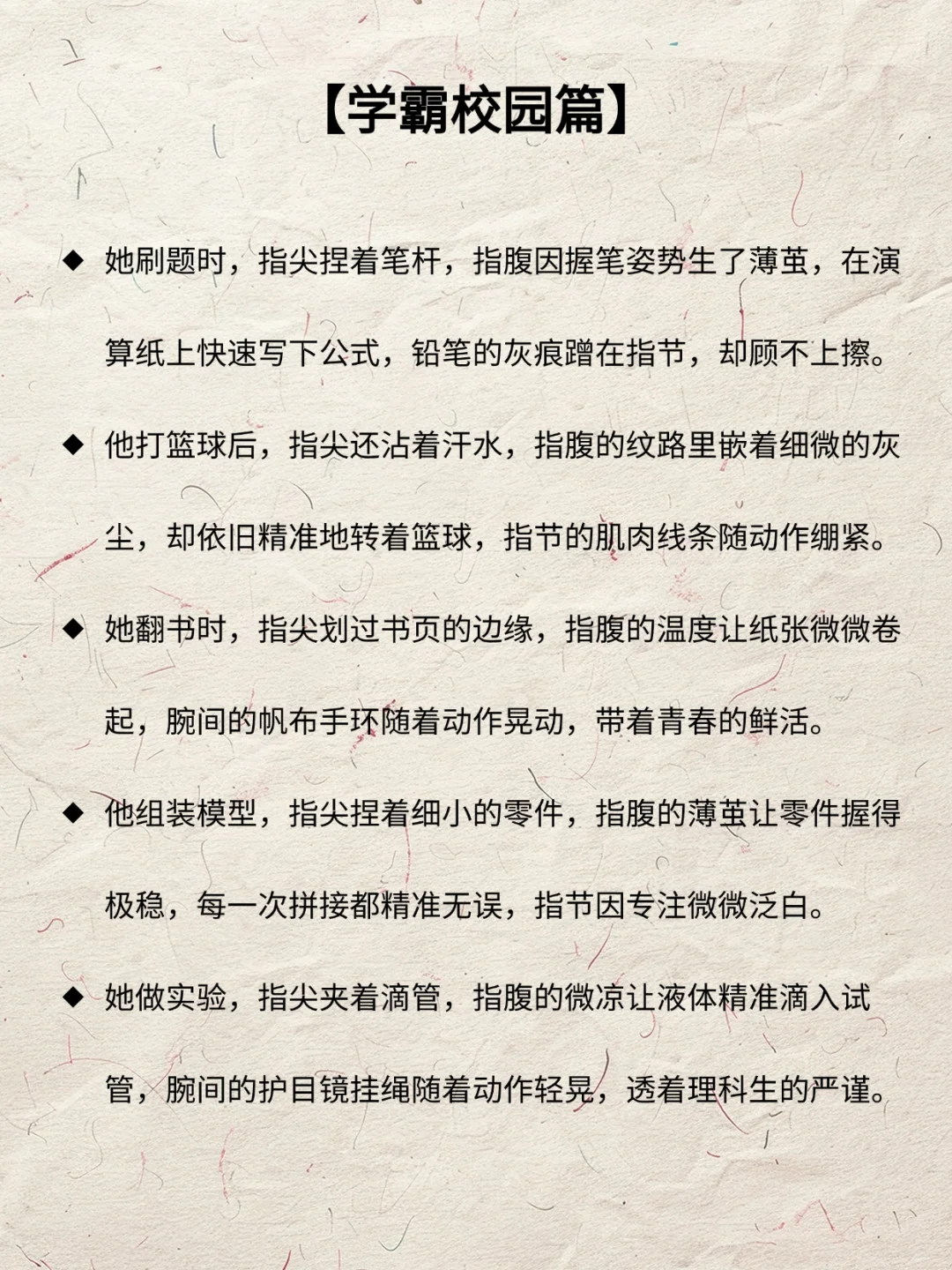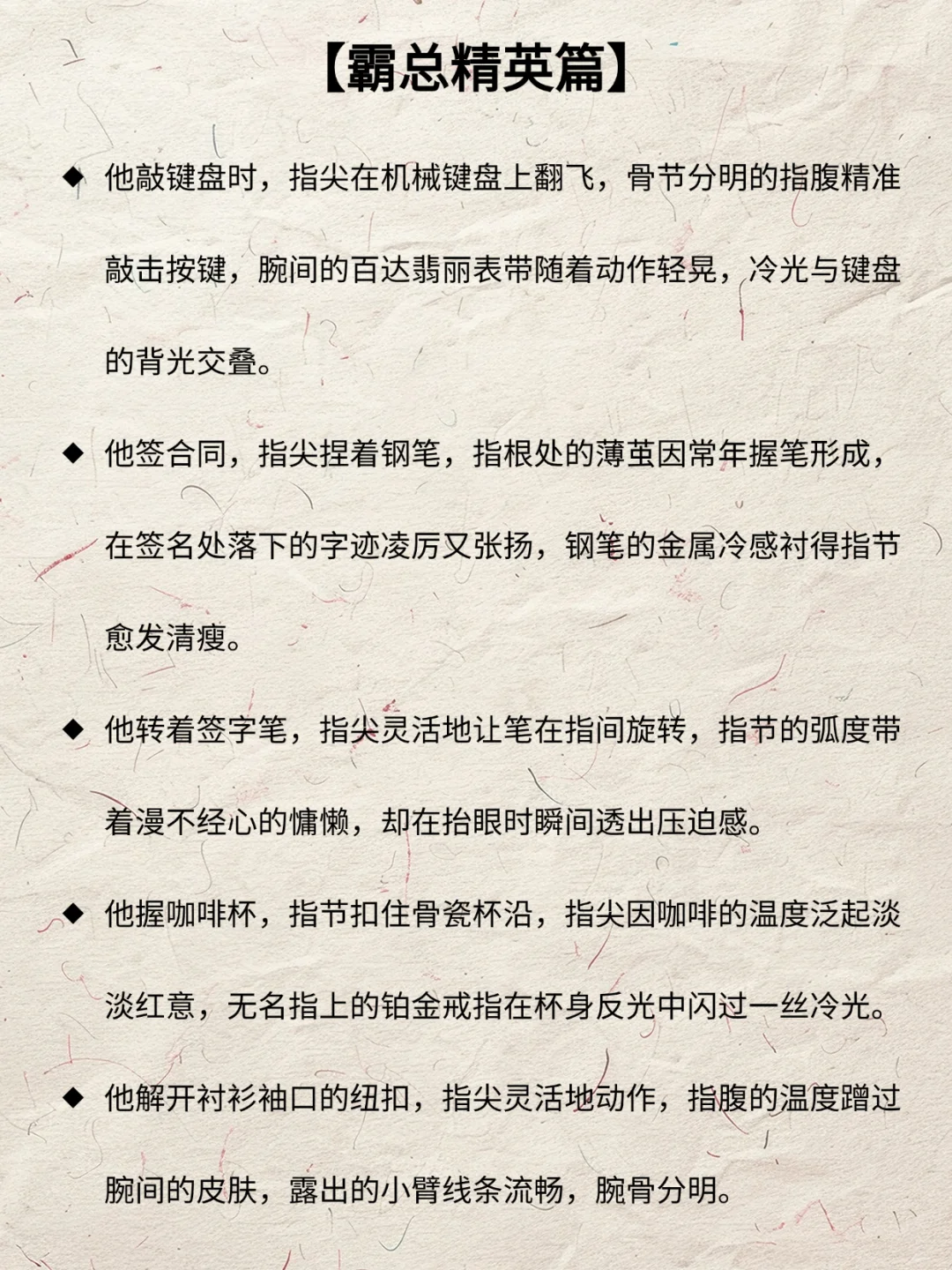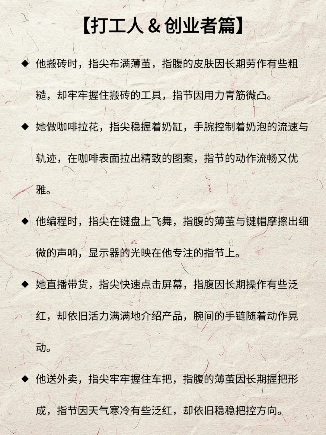 中篇:写小说别再“手指修长”!20条现代&都市手部描写,让角色瞬间立住🔥\n💥写现代、都市小说,手部描写只会“手指修长”?读者一眼就出戏!今天安排20条现代&都市专属手部描写,从霸总敲键盘到学霸握笔,从打工人搬砖手到艺术家创作手,细节精准到毛孔,让角色瞬间有血有肉!\n💼【霸总精英篇】\n🎓【学霸校园篇】\n👷【打工人&创业者篇】\n🎨【艺术家&创作者篇】\n宝子们!这些现代风的手部描写是不是瞬间让角色有了真实感?你们写现代文时最愁哪种人设的手部细节?评论区聊聊,下篇给你们安排职业&情绪向的手部描写!\n#小说写作 #现代小说 #手部描写 #小说素材 #写作干货 #新人写小说 #小说写作素材 #写作素材 #小说写作干货 #写作技巧