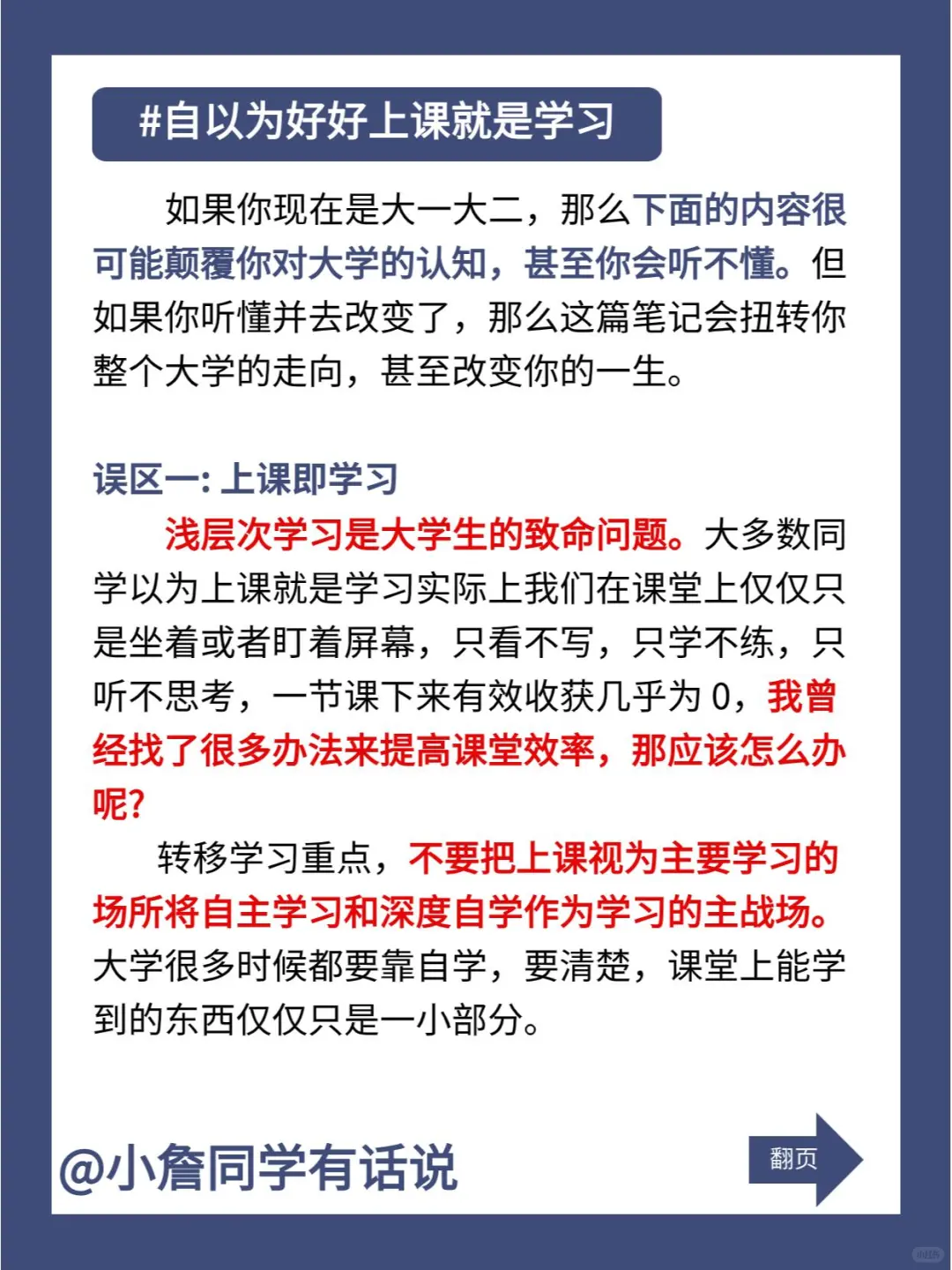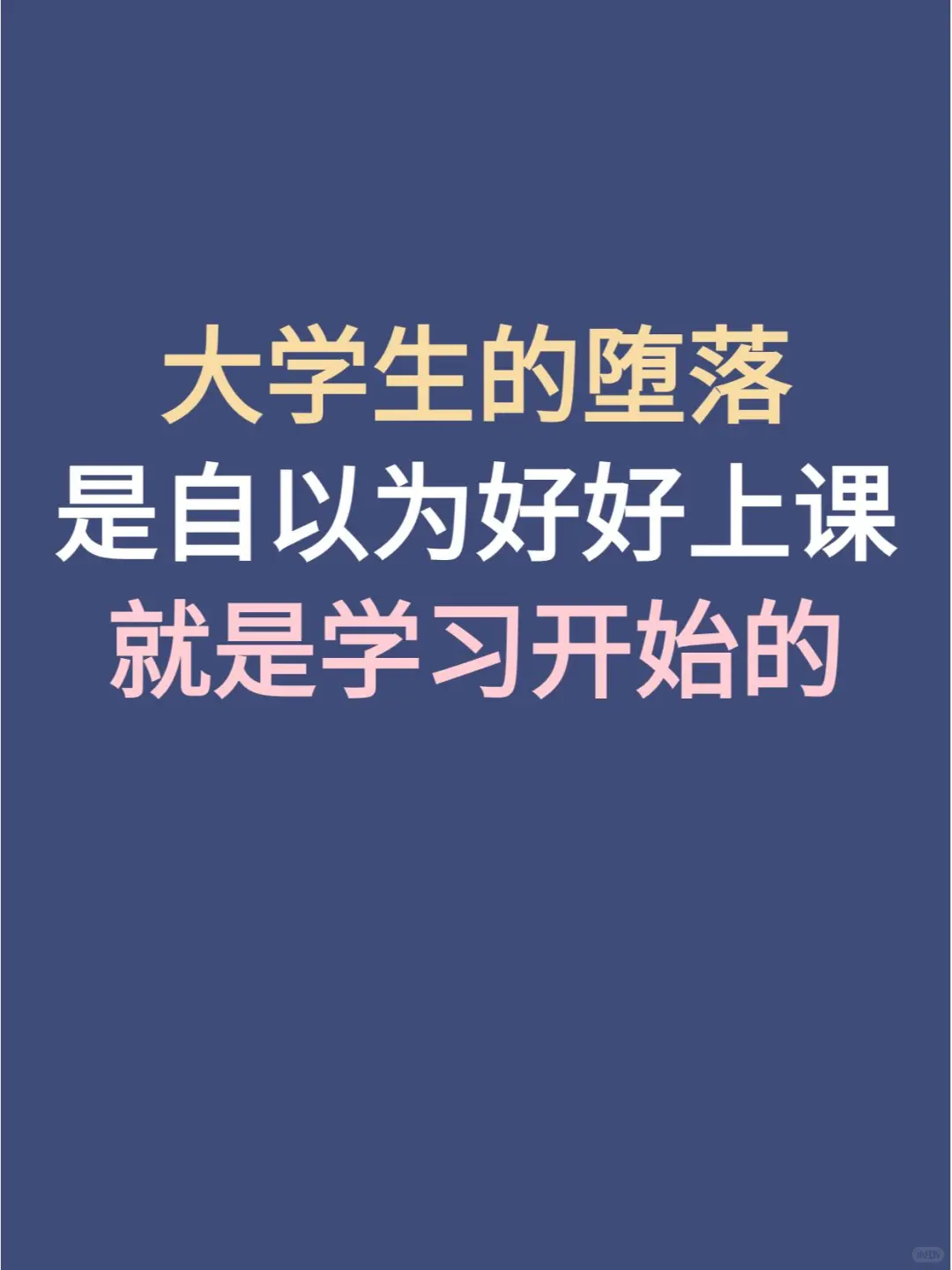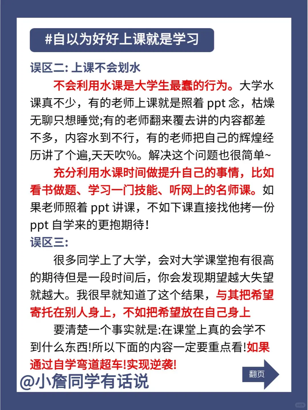 大学堕落的开始是从自以为好好上课就是学习开始的!如果大家没上过大学,或者在读大一,这句话你们可能听不懂。但如果你能听懂这句话,接下来讲的三大误区请认真看完,很有可能会逆转之后你的整个大学走向!\n-\n误区一:上课即学习\n浅层次的学习是大学生的致命问题。大多数同学以为上课就是学习,实际上我们在课堂上仅仅只是坐着或者盯着屏幕,只看不写,只学不练,只听不思考,一节课下来有效收获几乎为0,我曾经找了很多办法来提高课堂效率,那应该怎么办呢?\n转移学习重点,不要把上课视为主要学习的场所,将自主学习和深度自学作为学习的主战场。大学很多时候都要靠自学,要清楚,课堂上能学到的东西仅仅只是一小部分。\n-\n误区二:上课不会划水\n不会利用水课是大学生最蠢的行为。大学水课真不少,有的老师上课就是照着PPT念,枯燥无聊只想睡觉;有的老师翻来覆去讲的内容都差不多,内容水到不行,有的老师把自己的辉煌经历讲了个遍,天天吹%。解决这个问题也很简单~\n充分利用水课时间做提升自己的事情,比如看书做题、学习一门技能、听网上的名师课。如果老师照着PPT讲课,不如下课直接找他拷一份PPT自学来得更轻易。\n-\n误区三:\n很多同学上了大学,会对大学课堂抱有很高的期待但是一段时间后,你会发现期望越高失望越大。我很早就知道这个结果,与其把希望寄托在别人身上,不如把希望放在自己身上\n要清楚一个事实就是:在课堂上真的会学不到什么东西!所以下面的内容一定要重点看!通过自学弯道超车!实现逆袭!\n所以一定要提前规划大学,合理安排自己的时间,知道如何正确提升自己,才是更加重要的。\n大学 学习 自我提升与成长 大学生 大学如何学习 自我提升 学习生活 自学 大学四年 能力提升 大学课堂 大学规划 提升自我