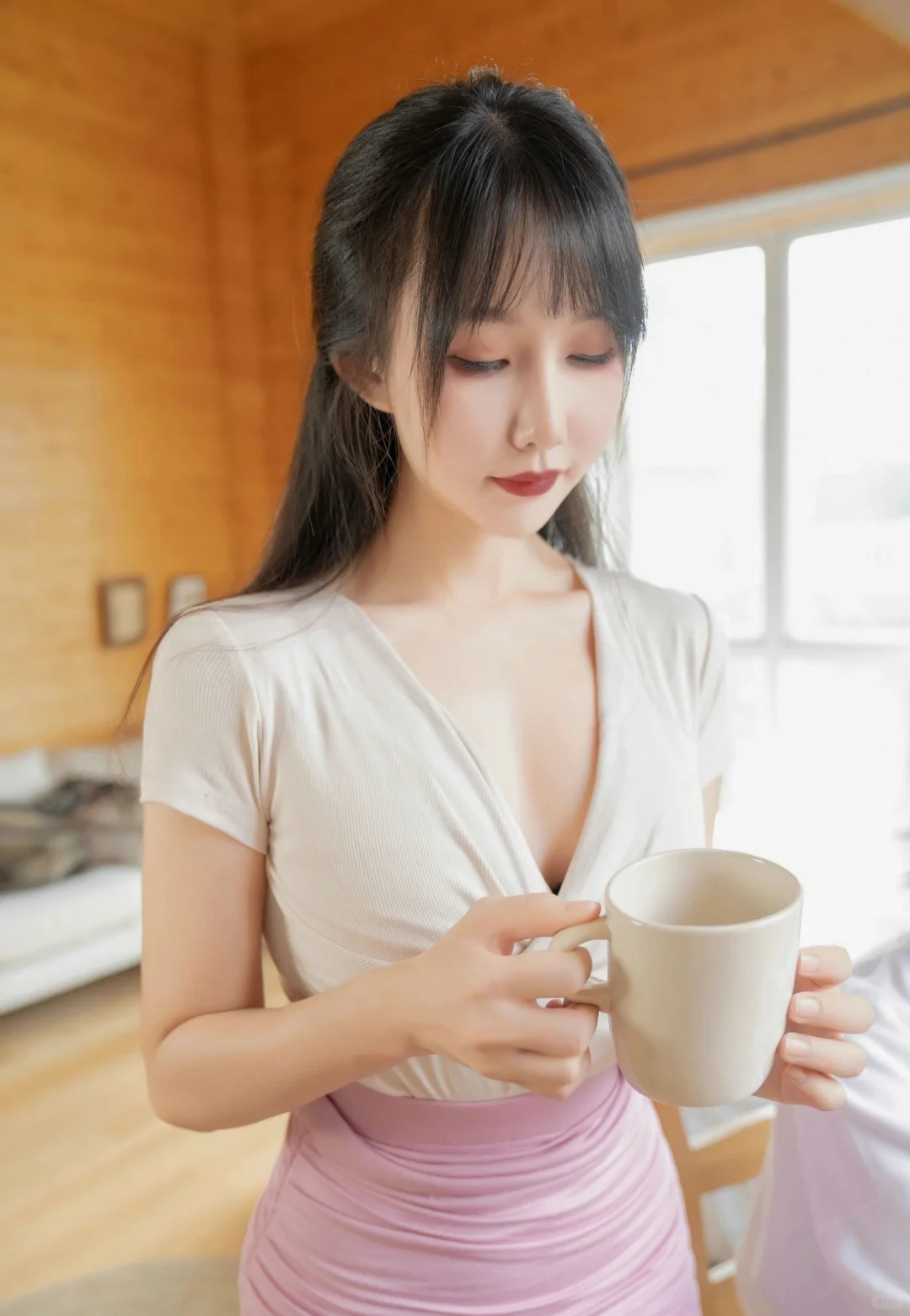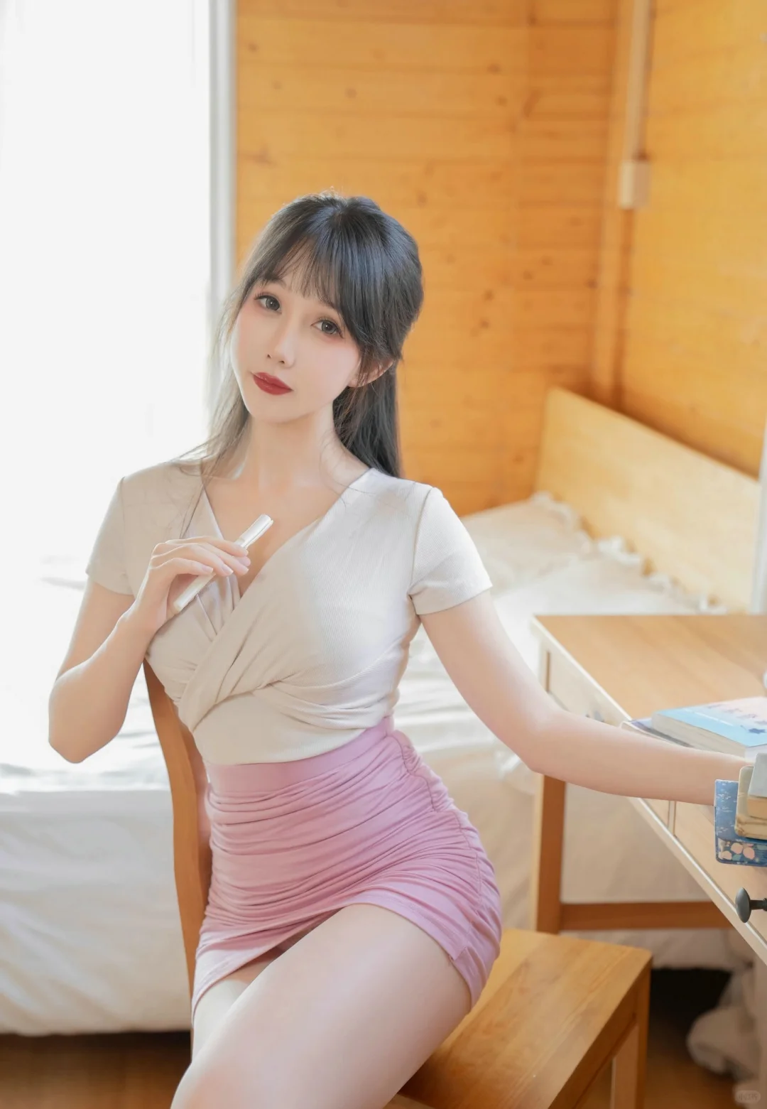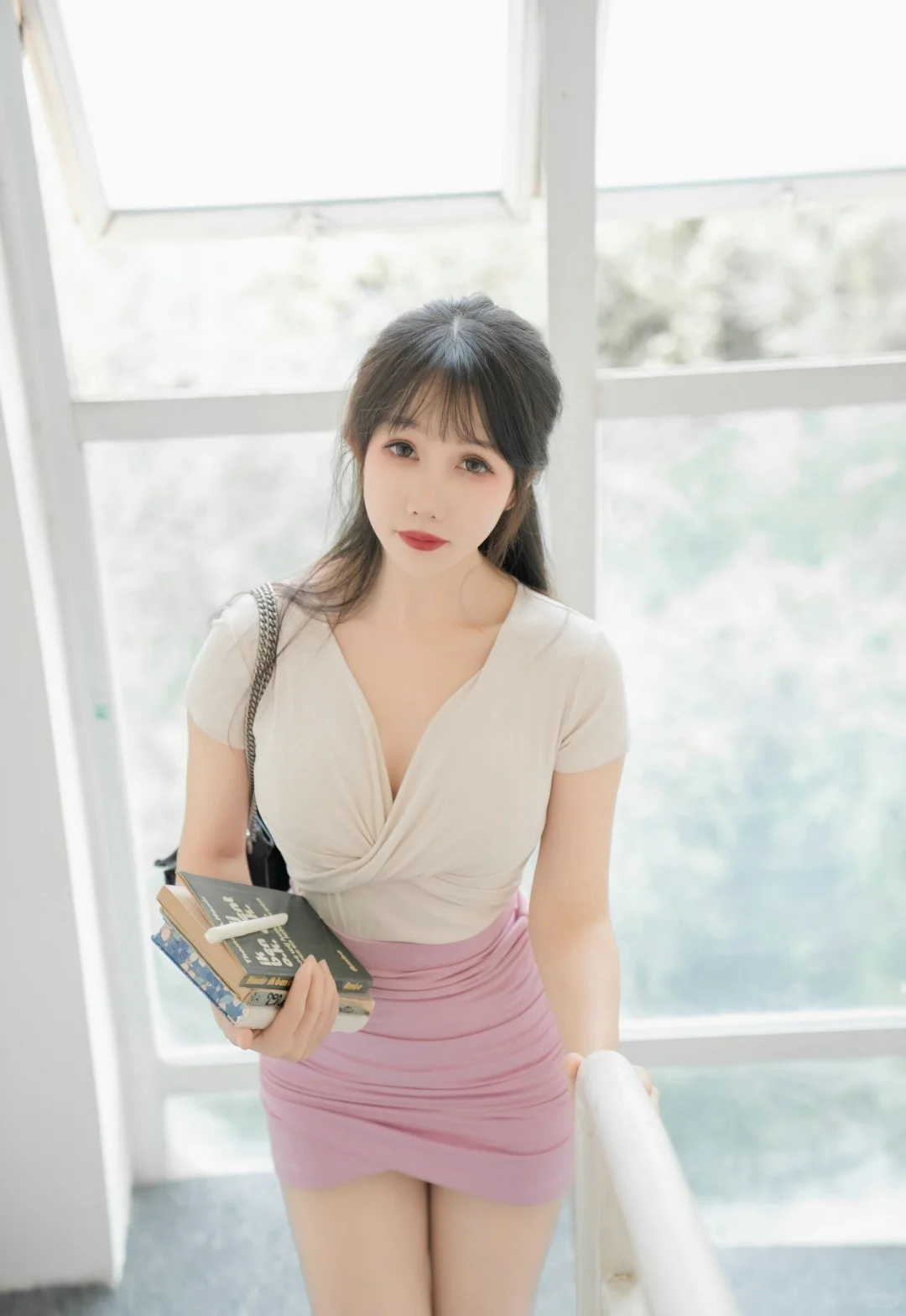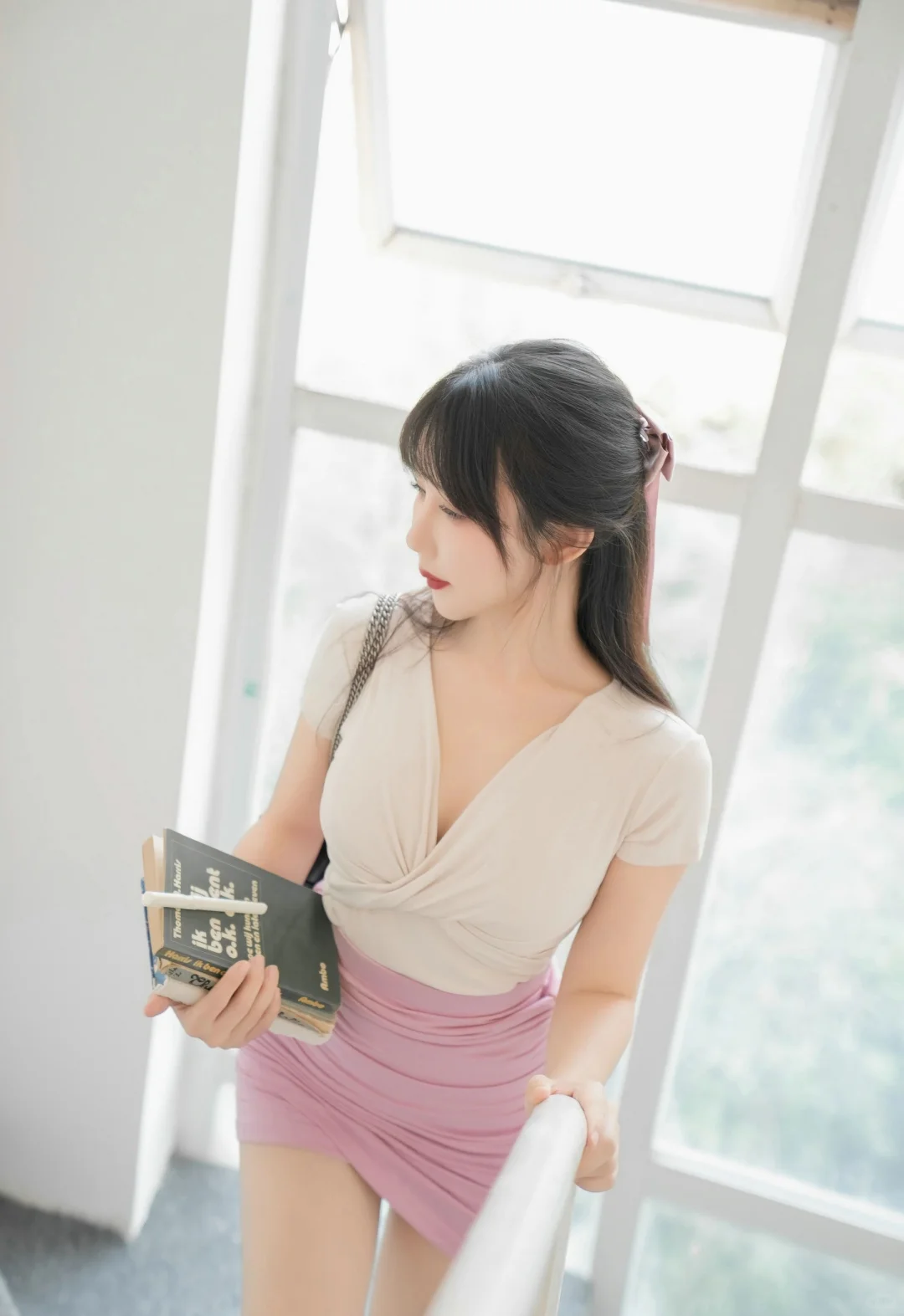 救命!成熟姐姐穿白衬粉裙秘书服在楼梯拍写真,甜酷又性感谁能扛住啊!💼\n打破秘书服的刻板印象!白衬 + 粉裙的组合也太戳心巴了~选的这件白色真丝衬衫质感绝了,轻薄透气还自带柔光滤镜,领口解开一颗纽扣,露出精致锁骨却不张扬,袖口挽到小臂处,露出腕间细链条手表,干练中藏着温柔;搭配的浅粉色高腰 A 字短裙太显活力,长度到大腿中部,裙摆微微蓬起,走动时灵动又俏皮,还悄悄优化了身材比例,白与粉的碰撞,把成熟女生的甜酷感拿捏得死死的!\n室内楼梯场景太出片了!选了木质扶手的旋转楼梯,暖光从顶部天窗洒下来,光影在台阶上形成自然渐变~拍照时坐在中间台阶,双腿随意交叠,一手撑着台阶,一手拿着皮质文件夹轻抵下巴,眼神带点慵懒的坚定,瞬间有了 “职场甜飒姐姐” 的既视感;站在楼梯转角处,侧身让衬衫腰线和短裙弧度更明显,一手搭在木质扶手上,一手轻轻提起裙摆,阳光落在发丝和裙摆上,每一张都像职场剧里的名场面!\n其实楼梯拍秘书服写真,重点在 “空间感与穿搭的融合”,成熟女生的从容气质,刚好能驾驭白衬粉裙的甜酷,加上楼梯的层次线条,画面高级又有故事感~想拍不一样职场风写真的姐妹,这套搭配闭眼冲!#美女写真 #正常拍摄无任何不良引导 #甜美与性感 #完美身材 #大长腿 #超清壁纸 #美少女 #送你一张壁纸 #人像写真 #制服写真