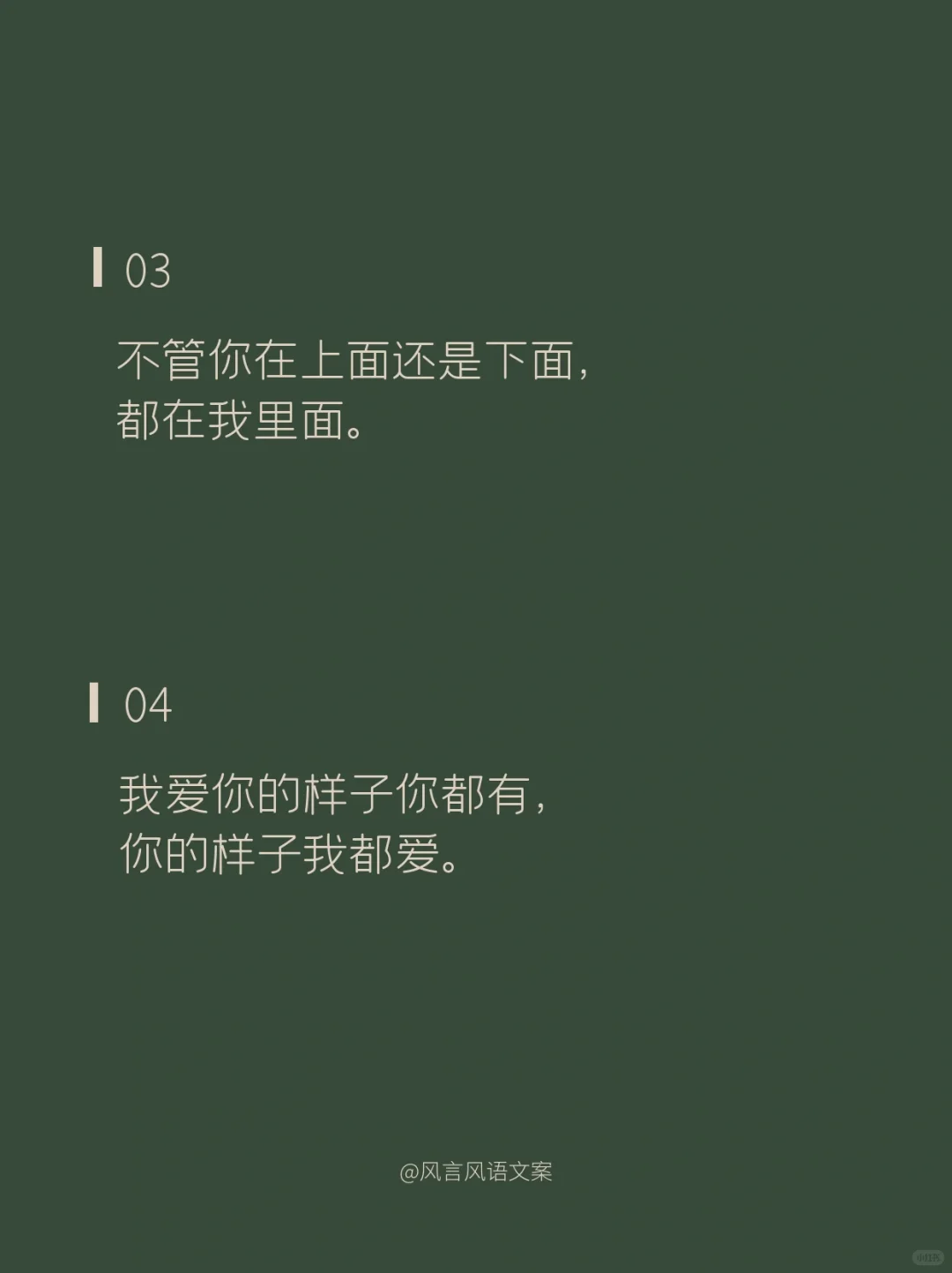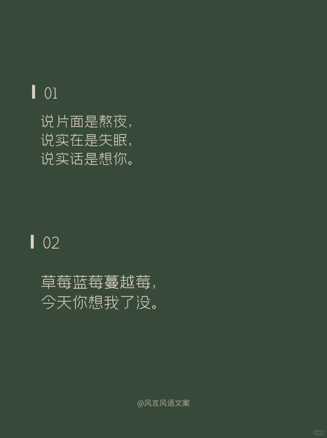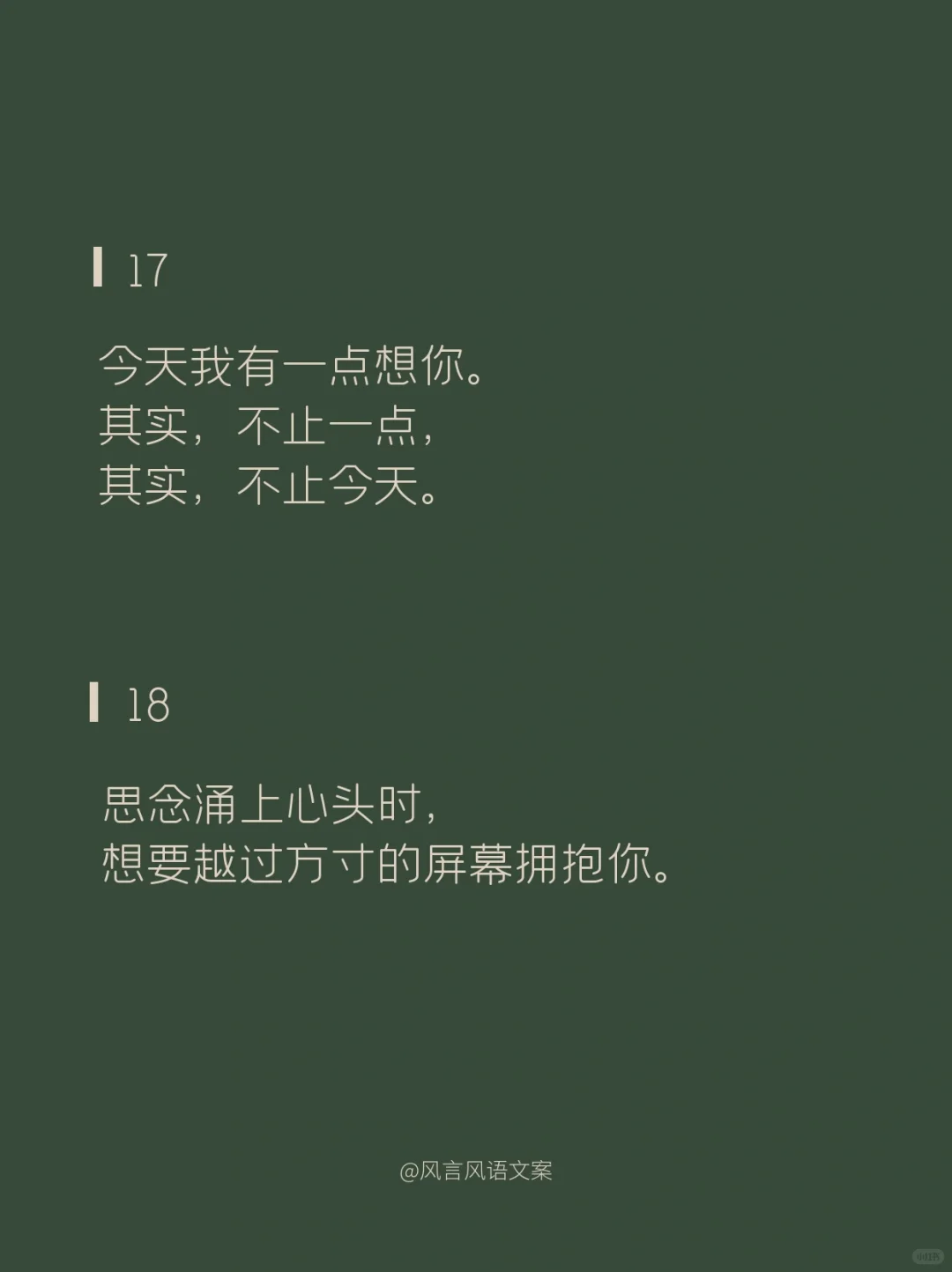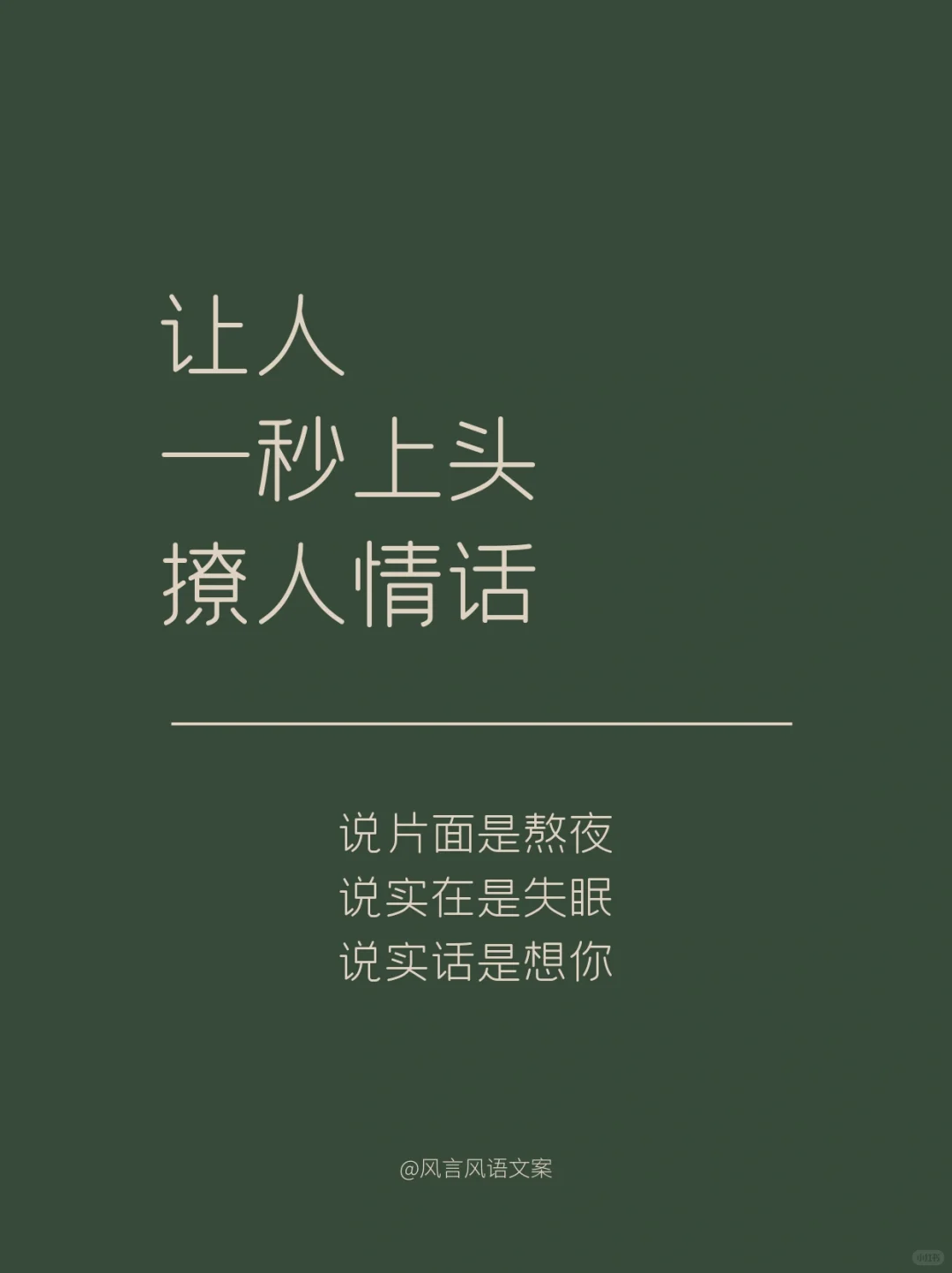 01\n说片面是熬夜,\n说实在是失眠,\n说实话是想你。\n02\n草莓蓝莓蔓越莓,\n今天你想我了没。\n03\n不管你在上面还是下面,\n都在我里面。\n04\n我爱你的样子你都有,\n你的样子我都爱。\n05\n出来看星星么\n不看星星也行\n你先出来\n06\n要脑子有什么用,\n它只会想你。\n07\n不在你左右,\n却被你左右。\n08\n多想跨过山和大海,\n去拥抱你,\n而不是拿着手机说想你。\n09\n傍晚的月亮照在花开的田野,\n我无端感觉你在等,所以我来了。\n10\n心明明是我的,\n却装的是满满的你。\n11\n别出现在我的梦里了,\n我承担不起醒来的落空。\n12\n昨晚喝多了特别想你,\n今天酒醒了发现,\n跟喝多了好像没关系。\n13\n生活真的好难,\n想被你哄着过完。\n14\n我想认真的谈场恋爱,\n自你而始,自你而终。\n15\n我想和你走过那座桥,\n桥上是绿树红花,\n桥下是流水人家。\n16\n世界没有你想象的那么坏,\n你过来,来我身边,我抱你。\n17\n今天我有一点想你。\n其实,不止一点,\n其实,不止今天。\n18\n思念涌上心头时,\n想要越过方寸的屏幕拥抱你。\n#撩人情话 #浪漫情话 #情话 #表白情话 #句子 #惊艳到你的句子 #令人惊艳的句子 #文案 #朋友圈文案 #撩人小套路 #撩人 #撩人文案