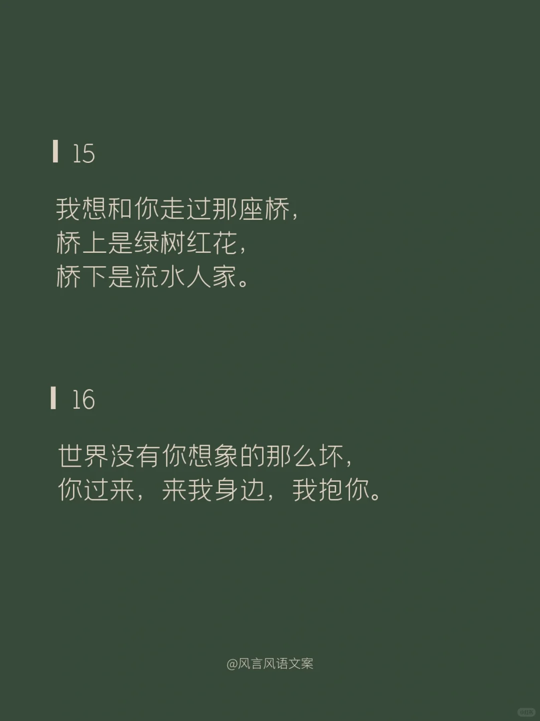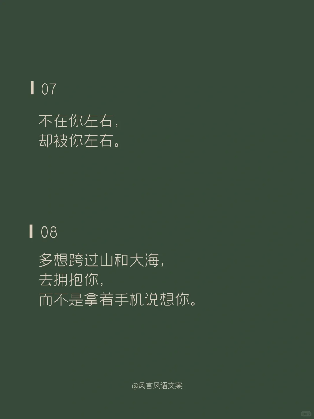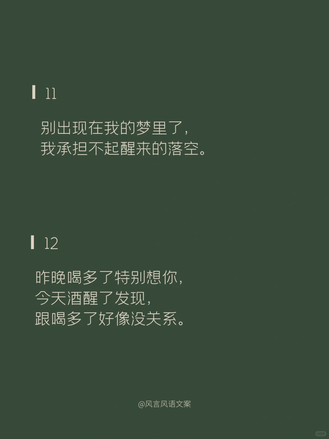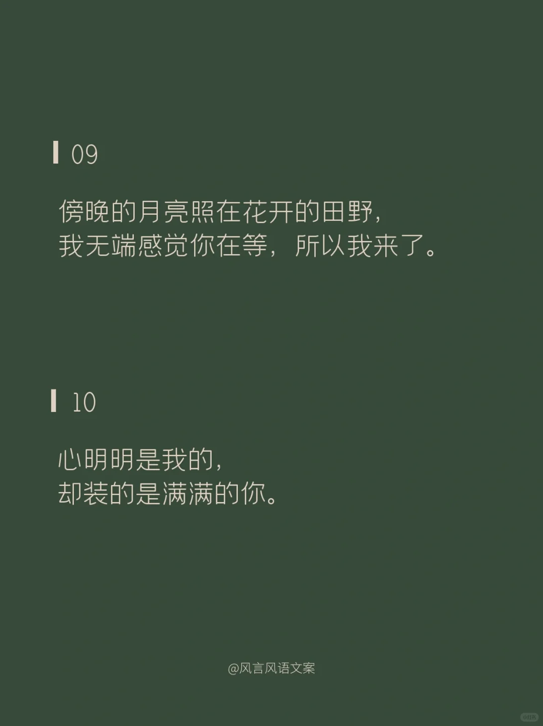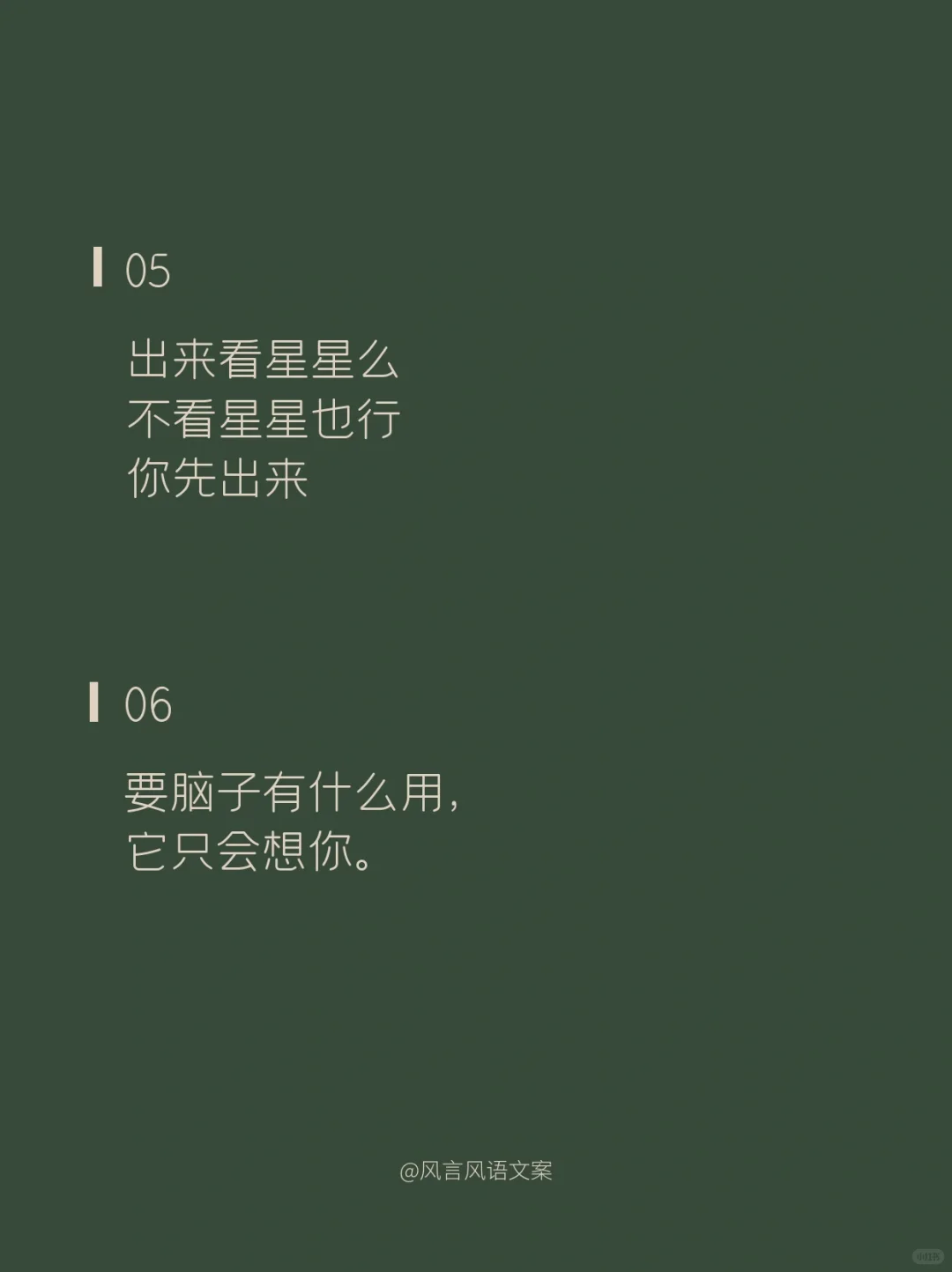 01\n说片面是熬夜,\n说实在是失眠,\n说实话是想你。\n02\n草莓蓝莓蔓越莓,\n今天你想我了没。\n03\n不管你在上面还是下面,\n都在我里面。\n04\n我爱你的样子你都有,\n你的样子我都爱。\n05\n出来看星星么\n不看星星也行\n你先出来\n06\n要脑子有什么用,\n它只会想你。\n07\n不在你左右,\n却被你左右。\n08\n多想跨过山和大海,\n去拥抱你,\n而不是拿着手机说想你。\n09\n傍晚的月亮照在花开的田野,\n我无端感觉你在等,所以我来了。\n10\n心明明是我的,\n却装的是满满的你。\n11\n别出现在我的梦里了,\n我承担不起醒来的落空。\n12\n昨晚喝多了特别想你,\n今天酒醒了发现,\n跟喝多了好像没关系。\n13\n生活真的好难,\n想被你哄着过完。\n14\n我想认真的谈场恋爱,\n自你而始,自你而终。\n15\n我想和你走过那座桥,\n桥上是绿树红花,\n桥下是流水人家。\n16\n世界没有你想象的那么坏,\n你过来,来我身边,我抱你。\n17\n今天我有一点想你。\n其实,不止一点,\n其实,不止今天。\n18\n思念涌上心头时,\n想要越过方寸的屏幕拥抱你。\n#撩人情话 #浪漫情话 #情话 #表白情话 #句子 #惊艳到你的句子 #令人惊艳的句子 #文案 #朋友圈文案 #撩人小套路 #撩人 #撩人文案