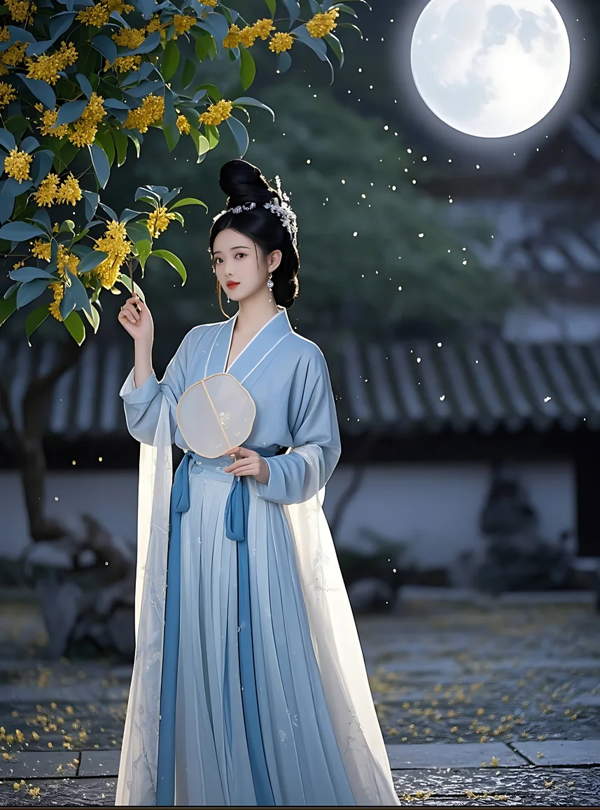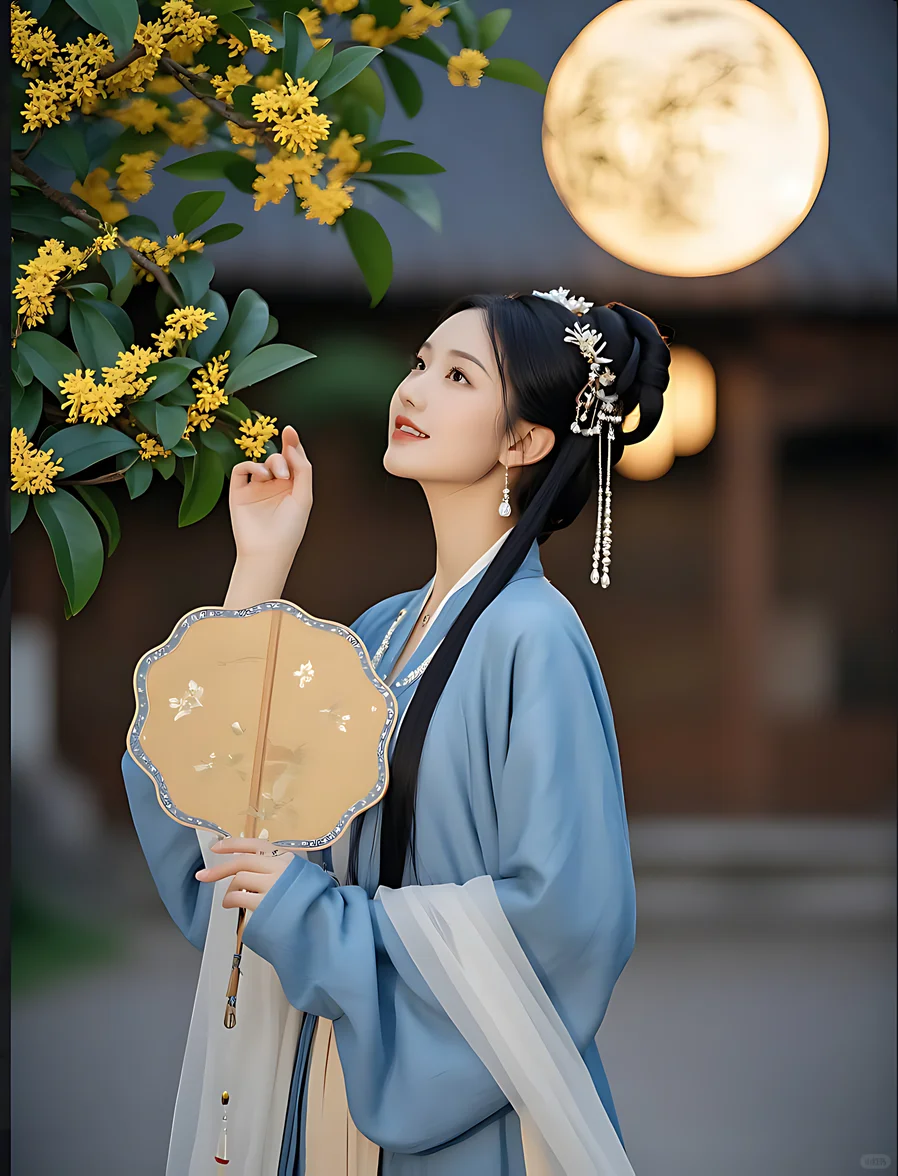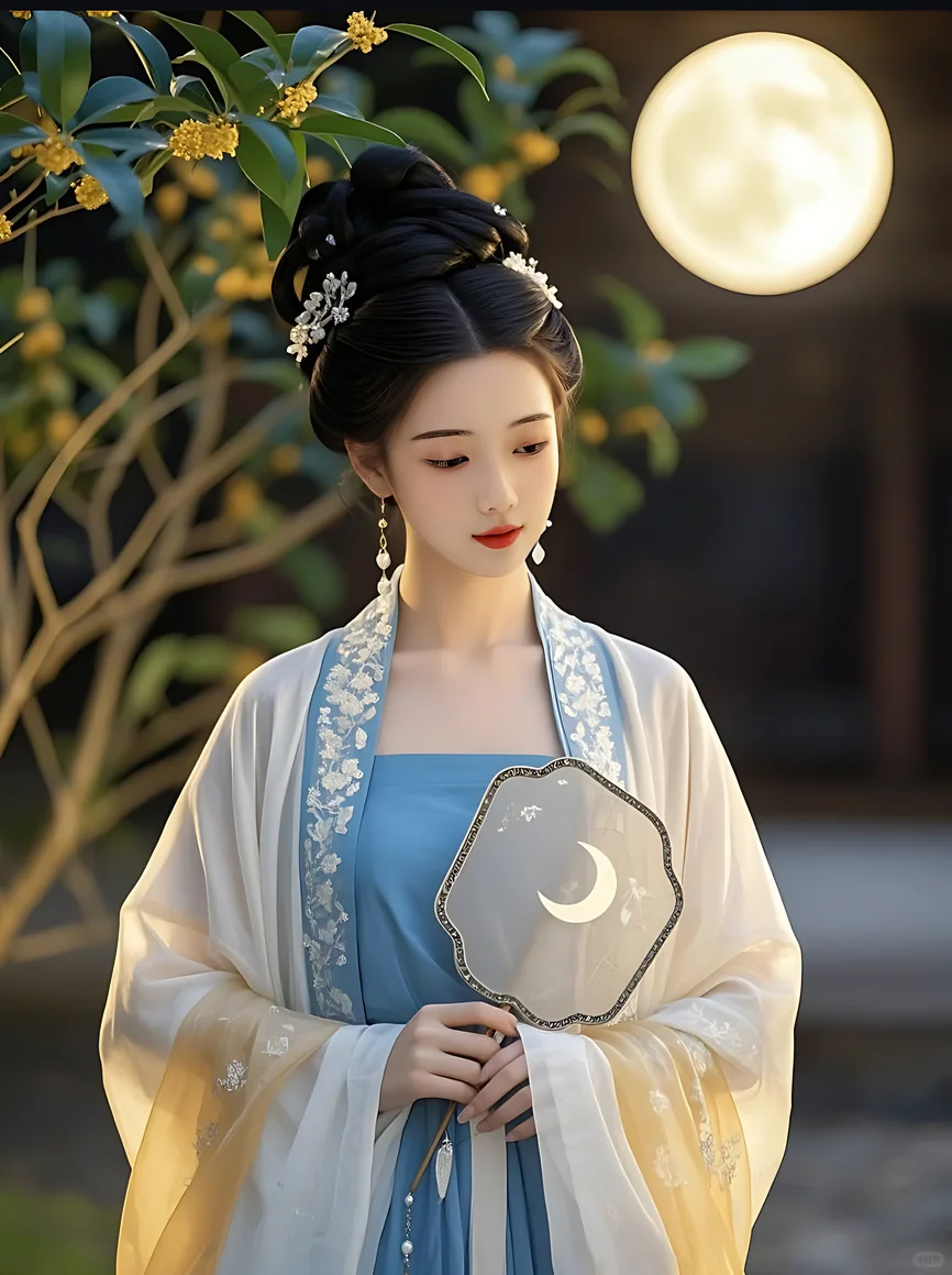 #记录吧就现在 🌕月上柳梢头,清辉洒满人间,秋风轻拂,花香四溢。\n中秋节,寓意着团圆与思念,皓月当空,映照着无尽的温柔与美好。在这样一个充满诗意的夜晚,身着一袭汉服,仿佛与月光融为一体,温婉中透着古典的雅致,和大自然的宁静共舞。中秋的汉服穿搭,不仅是对传统的传承,更是对美好生活的礼赞。\n穿搭推荐:\n主色调:月白+淡金+云水蓝\n上衣:选择一件月白色的对襟襦裙,月白色如同皎洁的明月,映照着秋夜的静谧。简洁大方的对襟设计,展现出优雅端庄的气质。肩袖处用淡金色刺绣描绘着月桂与莲花,寓意团圆与平静。刺绣纹样细腻而低调,如同月光洒在衣襟上,给人一种柔和而温暖的感觉。\n下裙:搭配一条云水蓝色的马面裙,裙摆轻盈飘逸,如秋夜的清风拂过湖面。云水蓝象征着秋水长天一色,裙摆处绣有月亮与流云的图案,既映衬了中秋的意境,又增添了层次感与流动美。裙摆随着步伐轻轻摆动,仿佛月下的波纹,展现出古典的灵动与优雅。\n披帛:肩上披一条淡金色的轻纱披帛,仿佛月光洒在身上,增添了一丝柔和与光彩。披帛随风轻舞,带来了一份飘逸与动感,让整个造型更显梦幻。\n发饰:发间点缀着一枚银质月桂发簪,月桂象征着中秋的圆满与吉祥,银色的光泽如同天上的皓月,闪烁着温润的光彩。搭配珍珠耳坠,珍珠的圆润与月亮的形象相呼应,寓意着团圆美满。\n饰品:搭配一只白玉手镯,玉质的温润与整体造型的素雅相得益彰,象征着中秋的圆满与祥和。手持一把描金团扇,扇面上绘有桂树与明月,既实用又充满中秋的意境。