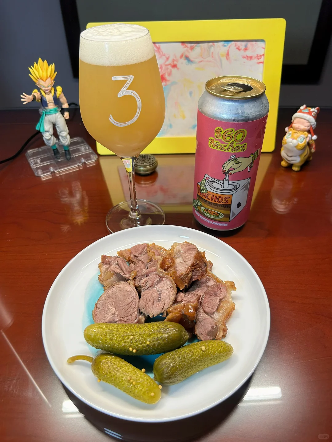生活就是这样,吃着牛腱子,搭配酸黄瓜,开一罐浑浊IPA,单调枯燥且乏味。\n在中端价格里,善良胡夫是我最喜欢的厂牌了,她稳定可靠,媚眼如丝,丰腴饱满,令人心动。\n谁会不喜欢这么一个大大的美人呢?\n善良胡夫——六十美元2号\n泡沫洁白绵密,消散比较慢,闻香上是甜瓜和橙子的气息,杀口感很强,这酒竟然是酸调的!酸感来的非常特别,包裹住了麦芽的甜和酒花的苦,酒体并不厚,但是糅合在一起,像喝了一大口酸酸甜甜的果汁,丝毫不腻。\n看起来我还是喜欢甜口带一点酸的IPA,纯苦的喝不来,单一西楚真真是遭罪。\n想了一下,这个区间,她比不上120美元的厚重,但是她优雅大方,软语温存之下,魅力加倍!\nCheers!寂寞的夜里我们喝酒吧,忘掉所有烦恼伤悲。\n以上。\n#来自全世界的精酿啤酒\n#有趣的精酿\n#善良胡夫\n#我的生活碎片\n#年轻人喝的酒\n#下酒菜\n#卤牛肉\n#酸黄瓜\n#午夜梦回