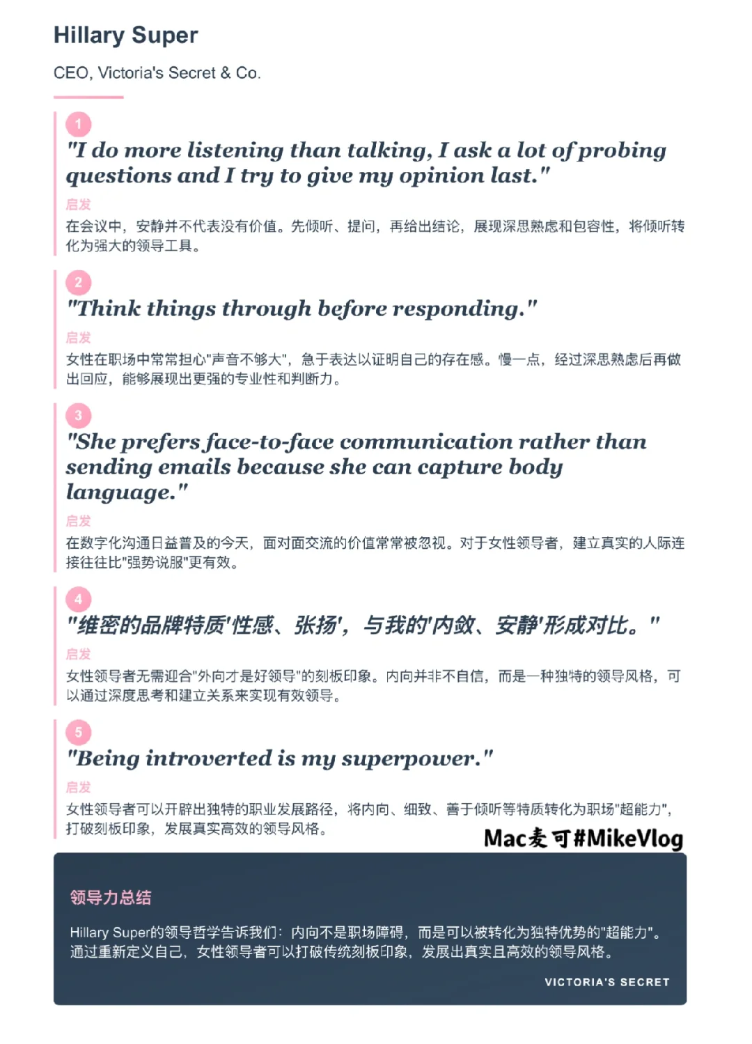 1️⃣ 人物背景与领导风格 ✨\n2024年9月,Hillary Super 接任维密 CEO。外界疑问:一个“内向”的人能否带领以“性感”为核心的品牌?\n她的经历塑造了她的视角:父亲从卖胸罩做到CEO,母亲注重细节;她在 Gap、American Eagle、Anthropologie、Savage X Fenty 的履历,让她兼具商品与品牌功底。\n她直言:\n💬 “I’m an introvert… I don’t want anyone to interpret that as me being aloof or unapproachable.”\n💬 “I do more listening than talking… I try to give my last.”\n⸻\n2️⃣ 公司困境与挑战 ⚠️\n在她上任前,维密已连续两年销售下滑,竞品多元化崛起。\n前任CEO的“去性感”战略短期拉动销量,但很快停滞\nSuper 接手时,公司不仅销量承压,还遭遇激进投资者和网络攻击。\n⸻\n3️⃣ 战略调整:性感回归 🔥\nSuper 认为品牌被稀释:\n💬 “The brand got a bit watered down.”\n她选择性感与舒适的新平衡:\n•推出 FlexFactor Bra,钢圈包裹,舒适又性感;\n•复兴 Very Sexy 系列:“It’s unapologetically sexy.”\n•门店引入 bra fit specialists;\n•重启大秀,展示多元\n⸻\n4️⃣ 成效与趋势 📈\n•财务:上任以来几乎每季增长,最新季度 +3%。\n•股价:上涨 8%,但仍比2021上市低 35%。\n•市场:年销售额 62 亿美元,1370+ 门店,每秒卖出两件胸罩。她强调:\n💬 “Comfort and value are table stakes… What makes someone say, ‘I need to try that,’ is an emotional connection.”\n——\n🎯 战略启示 📝\nHillary Super 正推动“性感回归+现代化演绎”:\n•产品:性感与舒适兼顾;\n•品牌:重建情感连接;\n•市场:在竞争中塑造差异化\n#职场女性 #维多利亚的秘密 #维密 #MikeVlog