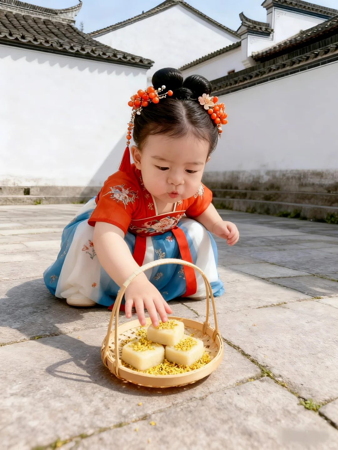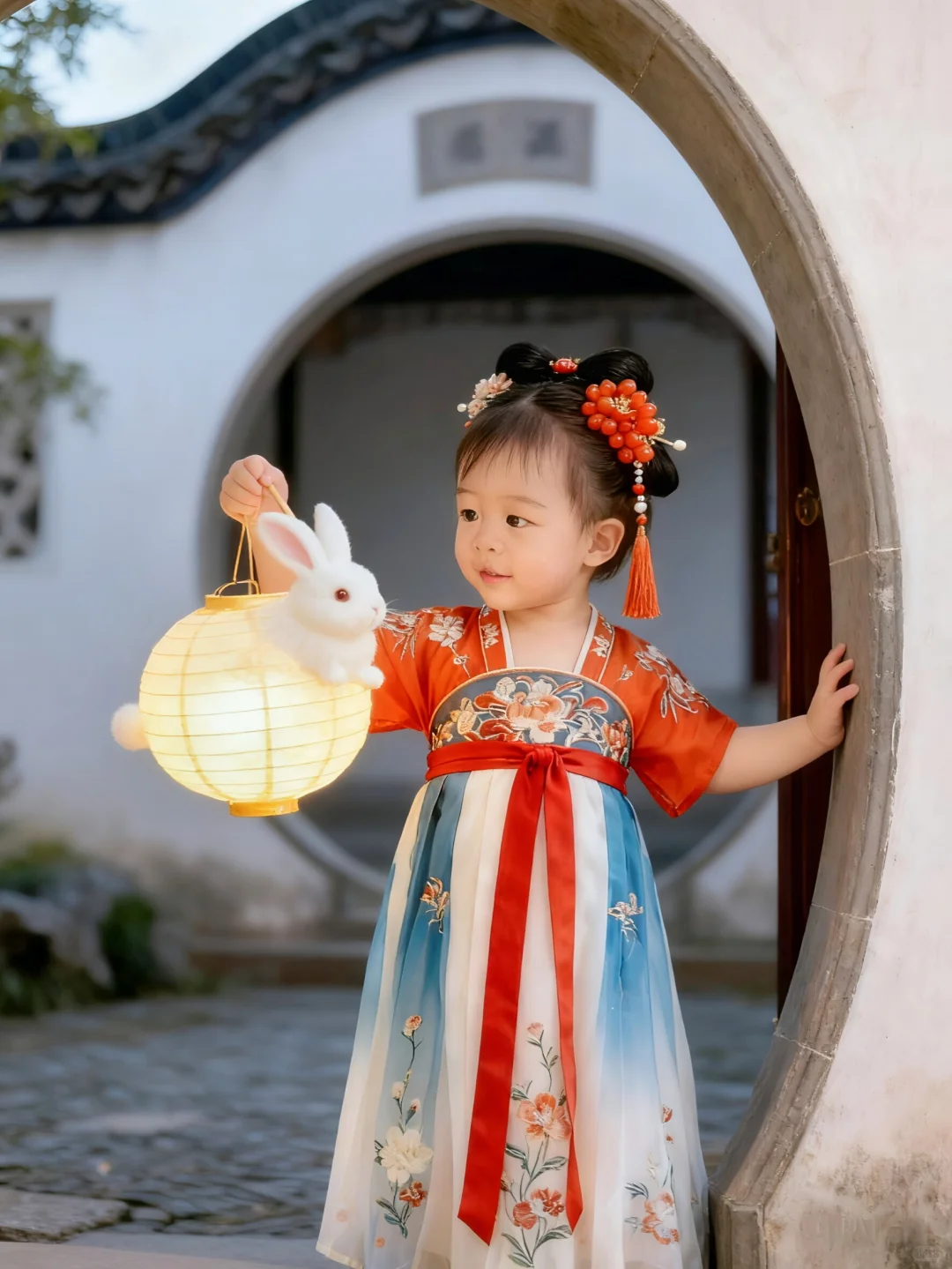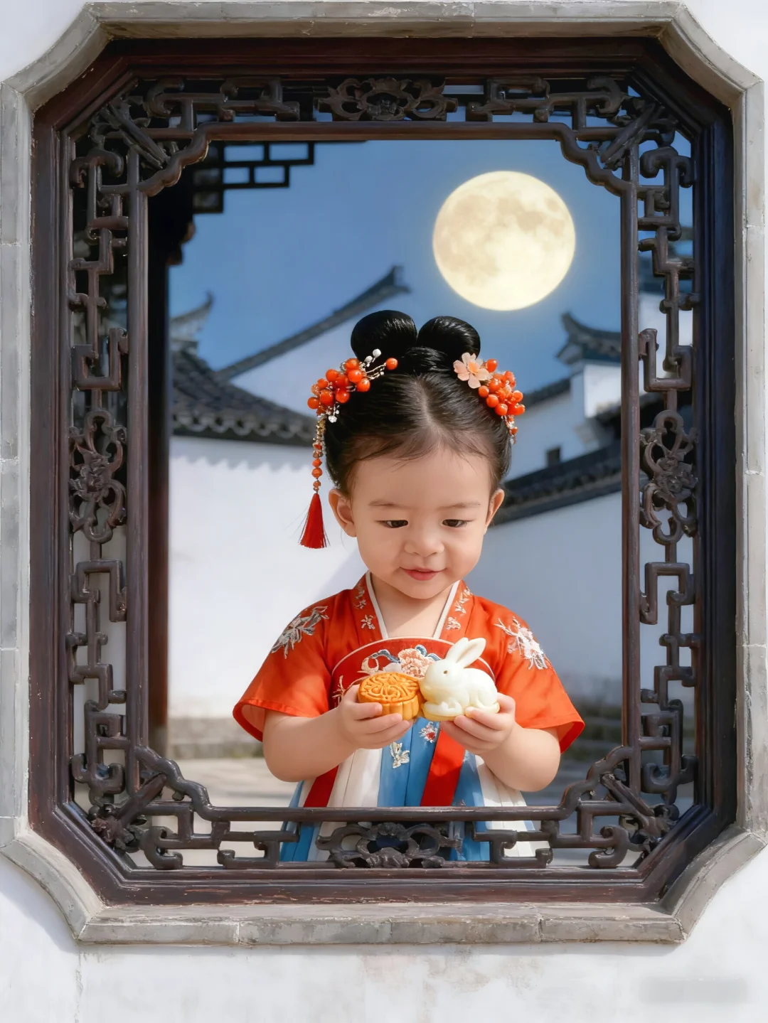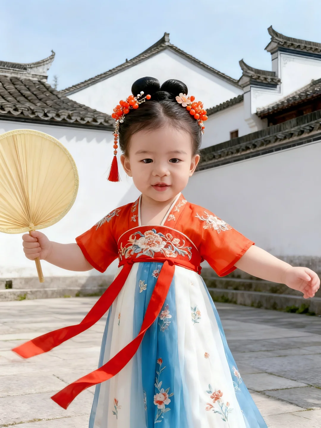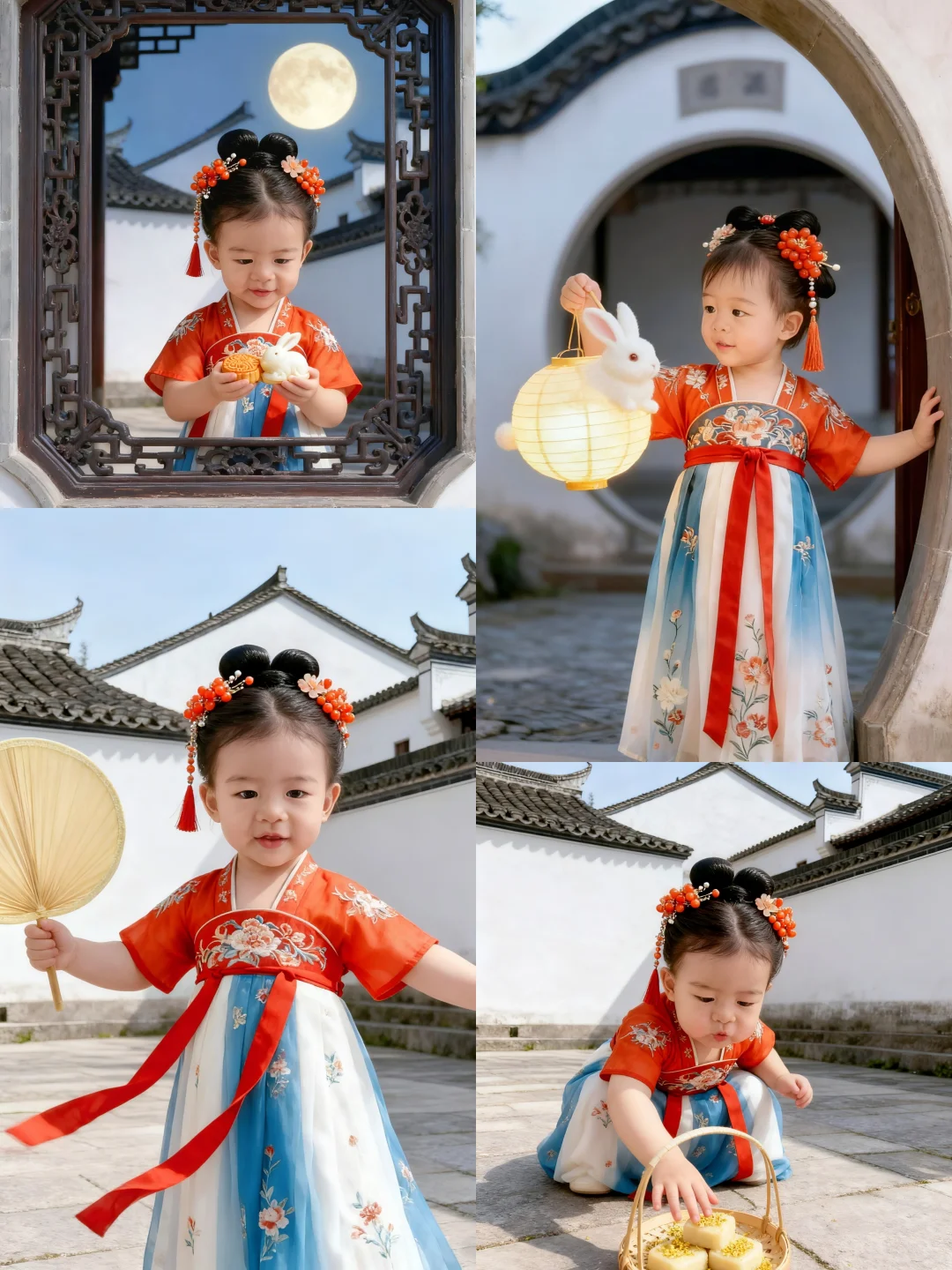 中秋节快到了,快给女儿拍一组古风写真吧!🏮\n咦~没有女鹅👧怎么办?\n那就拿鹅子👦来凑个数吧🫣\n🌟口令分享:\n去掉原背景,保持脸不动,帮我生成一张图片:\n【背景】\n背景是含徽派建筑元素的场景。\n【构图】\n三角形构图,剧中构图、井字型构图,也可以利用前景营造空间感构图。\n【光影】\n光影属于柔和的户外自然光,光线明亮且均匀,清晰地呈现出汉服的纹理、头饰的细节以及背景的层次,赋予画面温暖细腻的质感,既突出了主体的古典韵味,又让自然场景显得清新通透。\n【人物服饰】\n一周岁女宝宝身着唐制风格汉服,上衣为橙红色半袖,绣有精致的传统纹样,下裙是蓝白渐变的齐胸襦裙,点缀着淡雅的花卉图案,红色飘带随风轻扬,尽显灵动;头饰古意盎然,发髻上插着镶有花朵、珠饰的发簪,搭配橘红色珠花与流苏发饰,整体装扮充满古典雅致的国风韵味。\n【道具】\n手持一把米黄色的团扇,造型简约古朴,与汉服风格相契合,既增添了画面的古典气息,又仿佛是孩童夏日纳凉的可爱点缀,道具虽小却让整体造型更具完整性。\n【动作】\n一周岁女宝宝自然站立,一手持扇,姿态舒展,仿佛在夏日的自然景致中悠然漫步,动作从容且富有童真,将孩童的天真烂漫与汉服的古典优雅自然融合。\n【神态】\n一周岁女宝宝神态自然,眼神明亮,传递出纯真无邪的气质,与整体古风场景和服饰搭配,尽显孩童的天真烂漫与古典装扮的雅致韵味,画面极具感染力。\n \n🉑创作不易,搬运请@哈\n✅欢迎姐妹们在评论区交流分享\n \n#汉服小仙女 #古装写真 #宝宝汉服 #古代大家闺秀 #女童汉服 #古风爱好者 #原来穿上古装也能这么美 #AI照 #AI生成 #ai写真