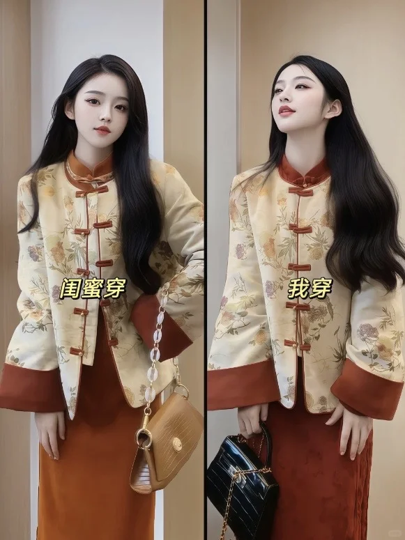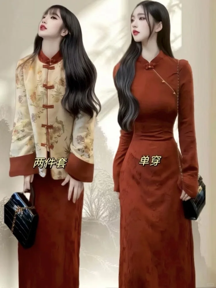 《璀璨华裳:新中式国风奢华密码》当凛冽的寒风开始在街头肆虐,一套能融合传统韵味与时尚保暖需求的服饰,成为了冬日里的璀璨明珠。新中式国风金色立领盘扣织金提花夹棉外套与红色加厚改良旗袍冬季套装,宛如从古老画卷中走来的仙子之裳,惊艳了时光。\n先看那金色立领盘扣织金提花夹棉外套,立领的设计,宛如古时文人雅士的高洁姿态,傲然挺立。它不仅仅是一种装饰,更像是守护颈部温暖的卫士。盘扣,这一经典的中式元素,精致无比,每一颗盘扣都像是一个故事的纽扣,串联起千年的文化传承。而织金提花的工艺,更是这件外套的灵魂所在。金线在织物中穿梭,编织出华丽而细腻的图案,在阳光的照耀下,金光闪闪,似有无数星辰镶嵌其中。夹棉的设计则是对寒冷的有力回击,温暖而厚实,让你在冬日的寒风中依然能够保持优雅。\n再把目光投向那红色加厚改良旗袍。红色,是喜庆、是热情,这抹红色在冬日的街头,就像是一团燃烧的火焰,点燃了整个季节的温暖。加厚的材质,触感柔软却不失挺括,给肌肤带来温暖的呵护。改良后的旗袍,既保留了传统旗袍的韵味,又融入了现代的时尚元素,让穿着更加舒适便捷。裙摆的摆动间,仿佛能看到婀娜多姿,又有自信与独立。\n当这两件服饰搭配在一起,便是一场视觉与文化的盛宴。金色与红色相互辉映,浓郁的新中式风格扑面而来。无论是参加传统节日庆典,还是漫步在古街小巷,亦或是出席时尚聚会,这套冬季套装都能让你成为众人瞩目的焦点,尽显国风之美,散发出独特的魅力。它承载着历史的记忆,也演绎着现代的时尚,是新中式国风服饰的杰出代表,为你的冬季衣橱增添一份华丽。#国风古韵 #高级感穿搭 #新中式女装国风 #女人味十足 #精致优雅#这个秋冬解锁高智感穿 #一套好的衣会让你不动声色的美 #显瘦穿搭 #谁穿谁好看 #论惊艳还得看新中式