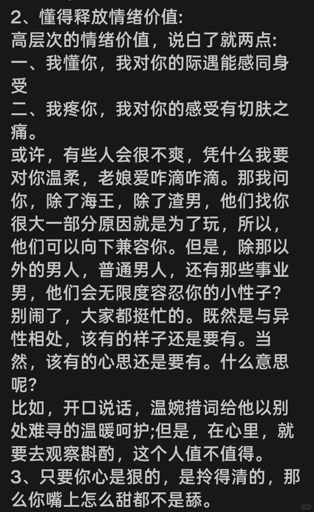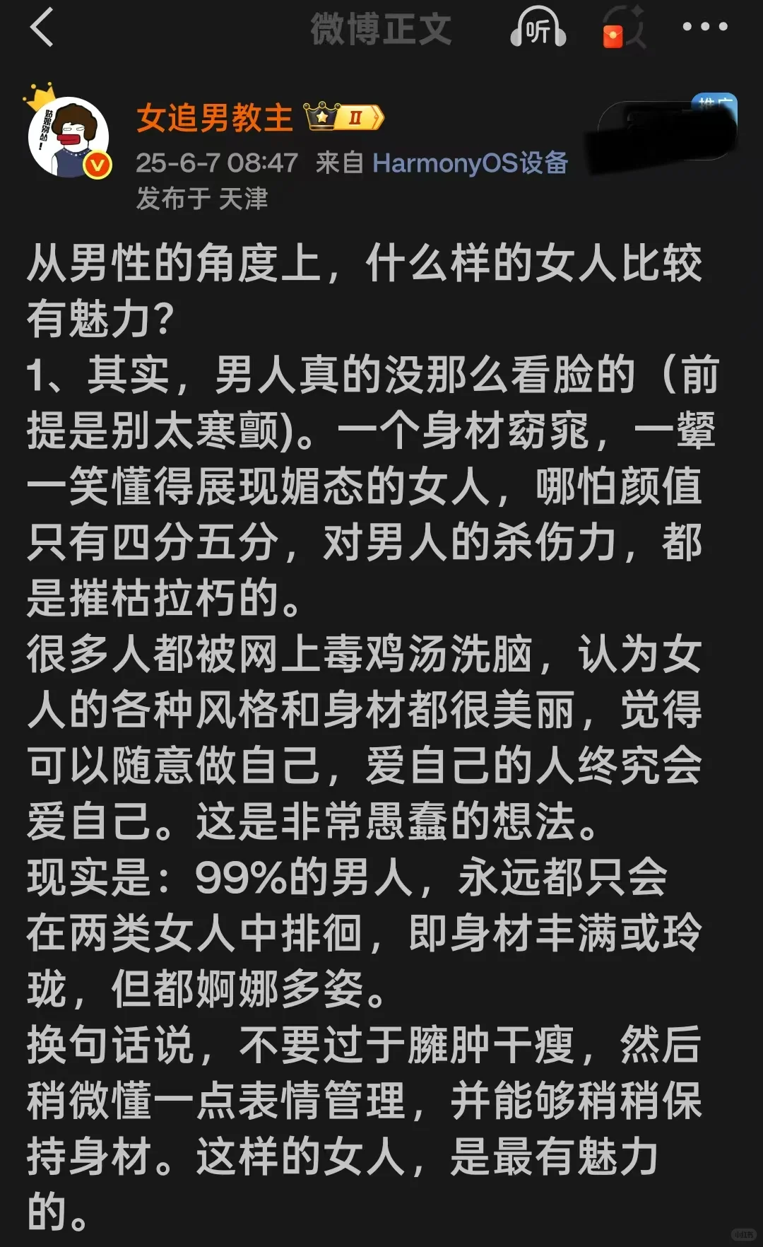从男性的角度上,什么样的女人比较有魅力?\n1、其实,男人真的没那么看脸的(前提是别太寒颤)。一个身材窈窕,一颦一笑懂得展现媚态的女人,哪怕颜值只有四分五分,对男人的杀伤力,都是摧枯拉朽的。\n很多人都被网上毒鸡汤洗脑,认为女人的各种风格和身材都很美丽,觉得可以随意做自己,爱自己的人终究会爱自己。这是非常愚蠢的想法。\n现实是:99%的男人,永远都只会在两类女人中排徊,即身材丰满或玲珑,但都婀娜多姿。\n换句话说,不要过于臃肿干瘦,然后稍微懂一点表情管理,并能够稍稍保持身材。这样的女人,是最有魅力的。\n2、懂得释放情绪价值:\n高层次的情绪价值,说白了就两点:\n一、我懂你,我对你的际遇能感同身受\n二、我疼你,我对你的感受有切肤之痛。\n或许,有些人会很不爽,凭什么我要对你温柔,老娘爱咋滴咋滴。那我问你,除了海王,除了渣男,他们找你很大一部分原因就是为了玩,所以,他们可以向下兼容你。但是,除那以外的男人,普通男人,还有那些事业男,他们会无限度容忍你的小性子?别闹了,大家都挺忙的。既然是与异性相处,该有的样子还是要有。当然,该有的心思还是要有。什么意思呢?\n比如,开口说话,温婉措词给他以别处难寻的温暖呵护;但是,在心里,就要去观察斟酌,这个人值不值得。\n3、只要你心是狠的,是拎得清的,那么你嘴上怎么甜都不是舔。\n4、他是放羊的,你是砍柴的,你们聊了一整天,他的羊吃饱了,你的柴呢?他是忙着生活,抽空爱你,你呢?是忙着爱他,抽空生活。11、边界意识,是人和人交往的不二法门,如果不让别人知道你的底线,那他们就会变本加厉。\n5、不缺爱的人更容易得到爱,不缺钱的人更容易得到钱,只要你不说自己穷,没有人知道你有多少家底。\n6、收回注意力,放在自己身上,看看今天哪里值得开心、哪里能够学习,自爱,才能有爱,才能有自由。\n7、我说我有事,你不要问我什么事;我说我在跟人吃饭你不要问我跟谁;我说我在陪……个朋友,你不要问我是男的女的。\n8、人一生的焦虑只源于两个方面,要么脑子没货,要么口袋没货。时间和心思都放在学习和赚钱上的人是不会焦虑的,他们很忙,没空焦虑。\n9、少在烂事上纠缠,少为不值得的人生气自己活得高贵一点,会放下烂人烂事。\n10、人和人之间只存在一种关系,那就是利益关系。要么你能满足别人的情绪价值,如情感、关怀、快乐等价值;要么你能给别人带来利益价值,如资源或者金钱。#花是一个人的精神外延