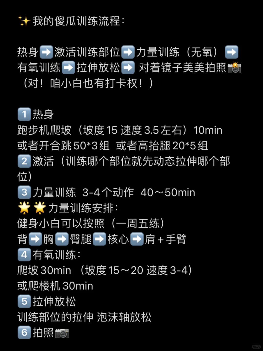 社恐女孩从手足无措到自信撸铁❗️\n \n姐妹们!本社恐终于从\"躲在跑步机角落的菜鸟\"进阶成\"敢在力量区抢器械的女人\"了\n \n分享我的健身房生存指南\n看完保你少走80%弯路👇\n \n💪🏻【进门前准备】\n1⃣️穿搭就穿\"让你想发自拍\"的!自信最重要!\n2⃣️必带三件套:大水壶、蓝牙耳机、速干毛巾\n \n🏋🏻【第一次别慌!】\n现在健身房的器械上都有二维码,使用之前扫二维码看使用方法。\n前两周先用固定器械(插调重量那种),动作做错了也不容易受伤!\n \n✨我的傻瓜训练流程:\n热身➡️激活训练部位➡️力量训练(无氧)➡️有氧训练➡️拉伸放松➡️ 对着镜子美美拍照📸(对!练完必须拍照奖励自己)\n1⃣️热身跑步机爬坡10min\n2⃣️动态激活\n3⃣️力量训练 3-4个动作 40~50min\n🌟力量训练安排:\n健身小白可以按照一周五练:背➡️胸➡️臀腿➡️核心➡️肩+手臂(图6:可以进主页看具体动作安排)\n4⃣️有氧训练:爬坡30min或爬楼机30min\n5⃣️拉伸放松\n6⃣️拍照📷\n \n⚠️防尴尬指南\n▫️私教推销话术统一回:\"我在跟帕梅拉/周六野网课呢~\"\n▫️找不到器械?直接抓个小姐姐问!健身女孩都超热心❤️\n \n🥊【血泪教训】\n⭕️练完要立刻补充快碳+蛋白质\n❌拒绝身材焦虑!\n \n最后送大家我的座右铭:\"只要踏进健身房的门,你就已经赢了80%的人!\"\n \n#健身小白 #见人不如健身 #健身 #训练 #健身干货 #健身动作 #健身女孩 #健身前后大对比 #零基础健身房入门 #撸铁女孩 #471型录 #遛遛大小孩 #遛遛生活 #以东方会世界 #春日逃跑计划 #时来孕转守护更超凡 #向上的她 #小甜脆大安心 #阔型风尚 #带我一起夜出发 #更懂女生的代步车 #元气打call拨通春天 #我的手机s码 #精致浪漫风裙装 #渝可渝爱和你种树 #容于声活方糖加甜 #美美生活改造家 #人人都是世界买家 #加杯背心撑你出型 #春日出游企划 #中国小朋友 #遛进佘山探春去