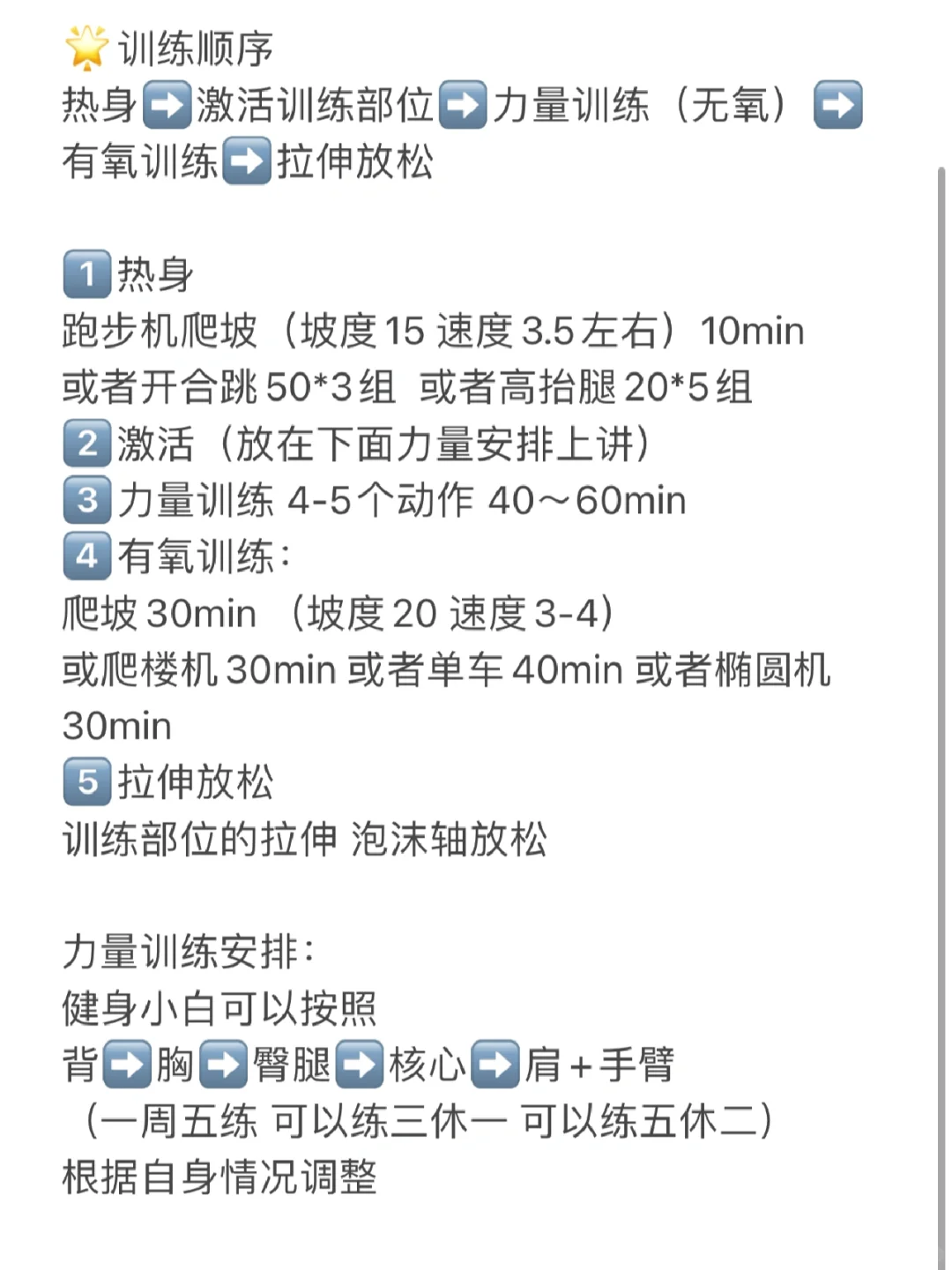 首先走进健身房的目的不论是减脂还是塑形\n我都建议加入力量训练\n不会变壮 没那么容易变壮\n且肌肉含量高更有利于减脂(代谢会提升)\n且快速减脂肉肉也不会松弛\n \n⏰每次训练前后大概1.5h~2h左右\n \n🌟训练顺序\n热身➡️激活训练部位➡️力量训练(无氧)➡️有氧训练➡️拉伸放松\n \n1⃣️热身\n跑步机爬坡(坡度15 速度3.5左右)10min\n或者开合跳50*3组 或者高抬腿20*5组\n \n2⃣️激活(训练哪个部位就先动态拉伸哪个部位)\n \n3⃣️力量训练 4-5个动作 40~60min\n \n4⃣️有氧训练:\n爬坡30min (坡度20 速度3-4)\n或爬楼机30min 或者单车40min 或者椭圆机30min\n \n5⃣️拉伸放松\n训练部位的拉伸 泡沫轴放松\n \n🌟🌟力量训练安排:\n健身小白可以按照\n背➡️胸➡️臀腿➡️核心➡️肩+手臂\n \n(一周五练 可以练三休一 可以练五休二)\n根据自身情况调整\n \n具体的训练动作下篇出详细版供大家选择💪\n \n#健身小白 #健身干货 #健身女孩 #健身前后大对比 #健身\n#健身心得干货分享
