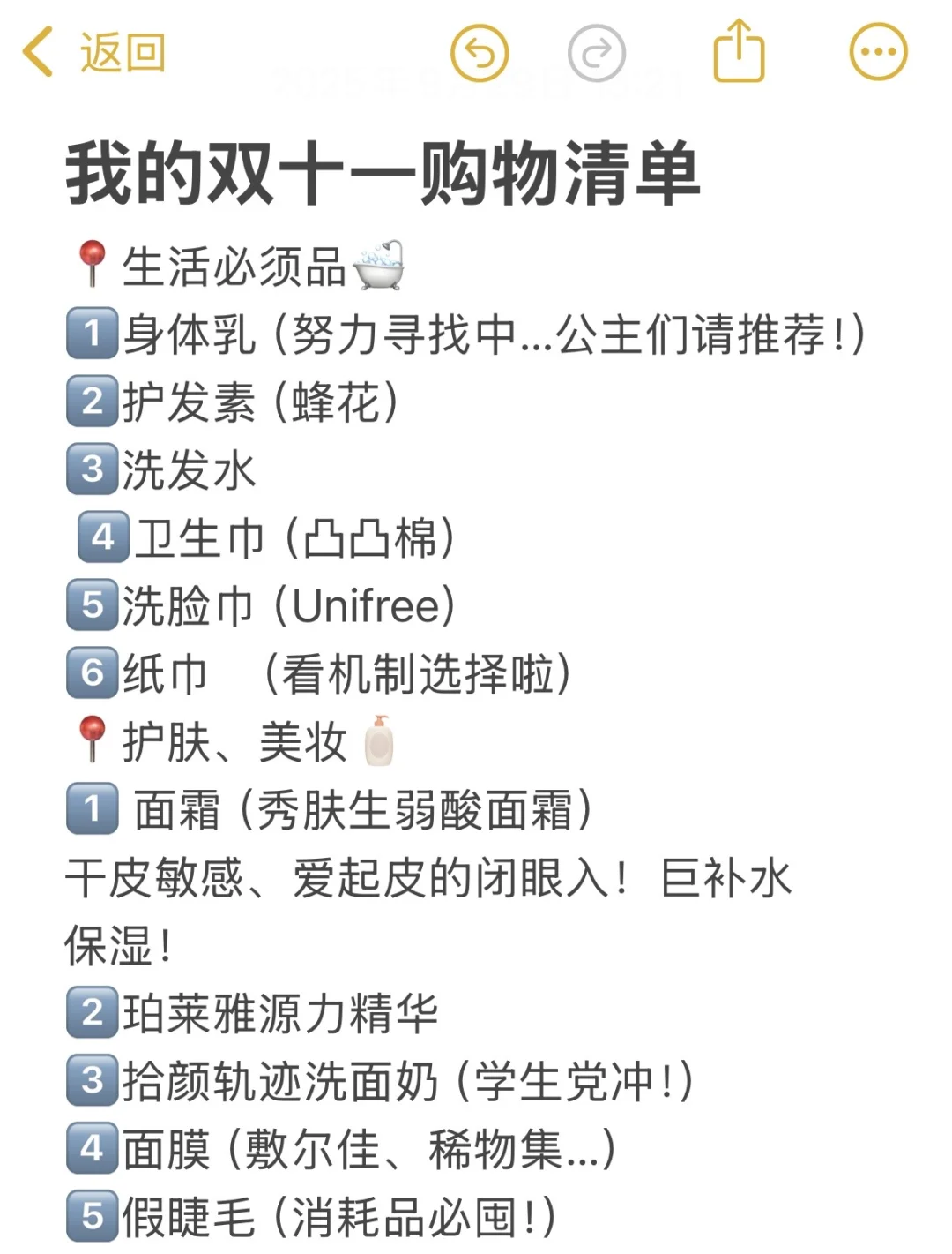 📍生活必须品🛁\n⃣身体乳(努力寻找中…公主们请推荐!)\n⃣护发素(蜂花)\n⃣洗发水\n⃣卫生巾(凸凸棉)\n⃣洗脸巾(Unifree)\n⃣纸巾 (看机制选择啦)\n📍护肤、美妆🧴\n⃣ 面霜(秀肤生弱酸面霜)\n干皮敏感、爱起皮的闭眼入!巨补水保湿!\n⃣珀莱雅源力精华\n⃣拾颜轨迹洗面奶(学生党冲!)\n⃣面膜(敷尔佳、稀物集…)\n⃣假睫毛(消耗品必囤!)\n📍服饰🛍\n⃣运动内衣\n⃣内裤\n⃣袜子\n⃣运动鞋\n📍食品🥤\n(减脂期零食就不买啦🤗不过零食很划算大家可以按需囤!)\n⃣无糖酸奶\n⃣纯牛奶\n⃣沃隆坚果\n大家一起查漏补缺呀!欢迎补充‼\n#省钱购物 #双十一购物 #双十一必买清单 #当代女大学生#双11省学指南 #天猫双11 #双11美妆个护必买#男士身体乳#清单分享#185体育生#国庆#双十一