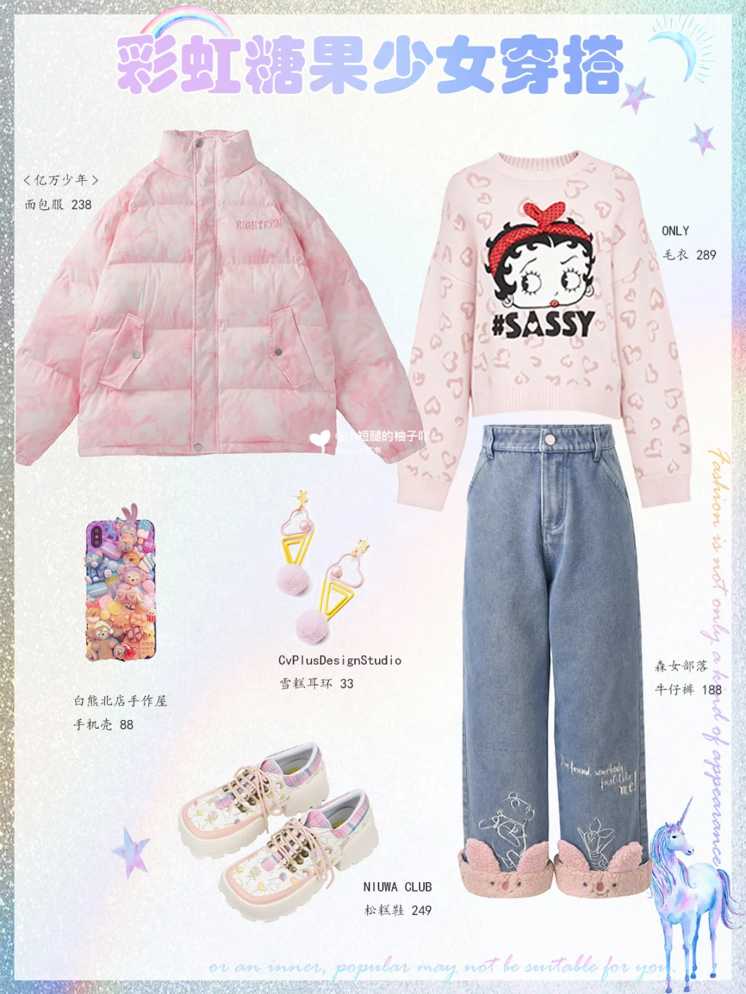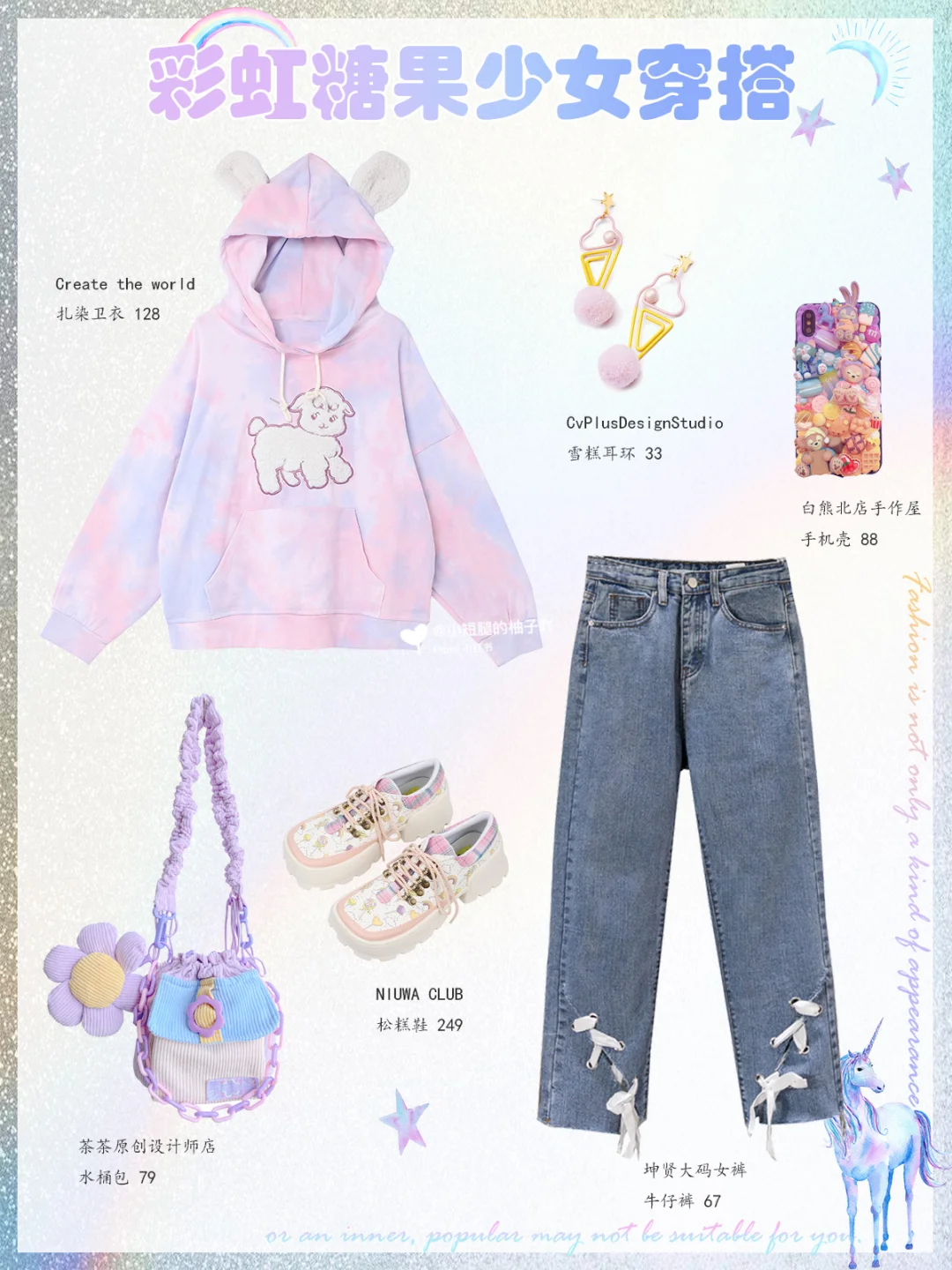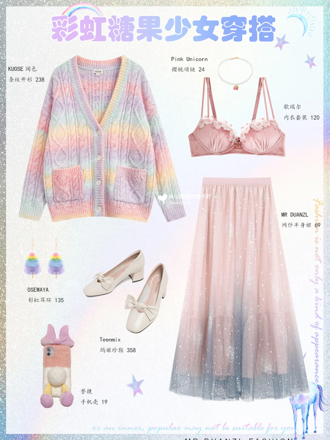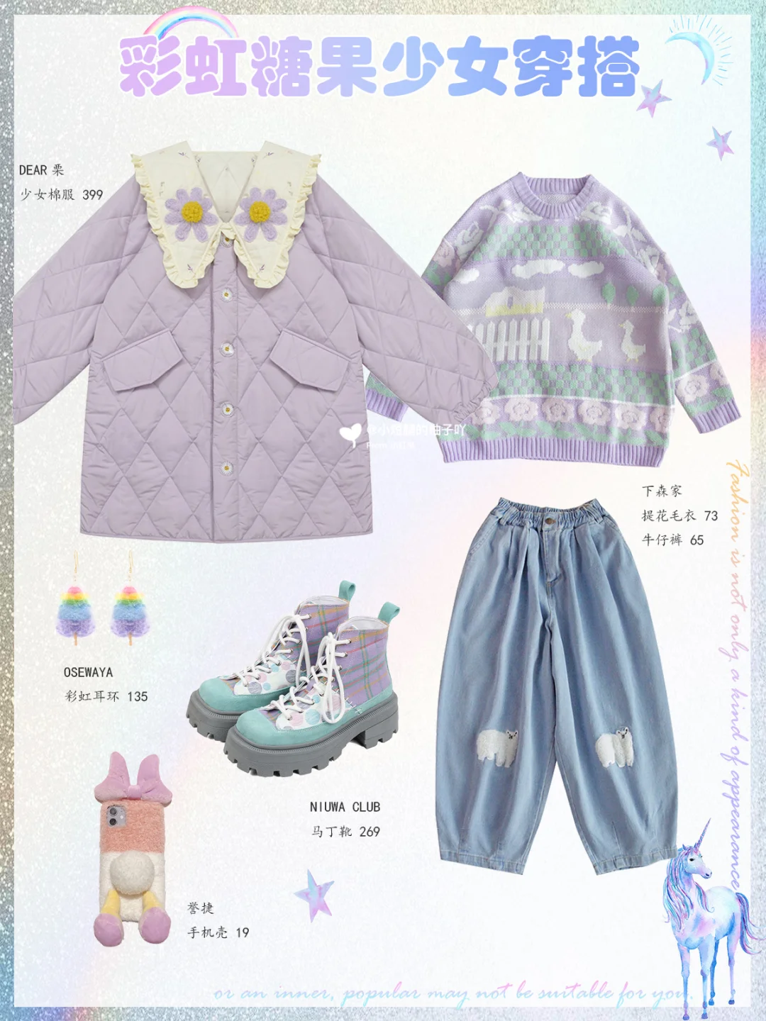 学生党穿搭📖小个子穿搭👧秋冬穿搭🍂节日穿搭\n \n美好的平安夜🤶\n㊗️小可爱们平安💕快乐💕心想事成💕暴富😎\n柚子为大家带来甜甜甜甜➕➕➕➕➕的彩虹色系穿搭,让清新的色调带给你美好的心情🌸喜欢就给柚子点赞👍➕收藏⭐️吧,谢谢支持啦\n🌟Look1 针织衫🪡➕网纱裙\n很经典的一个组合,渐变🌈的色调,搭配飘逸的网纱,温温柔柔惹人爱💕无论学生党还是上班族都很合适👌\n💫Look2 卫衣➕👖牛仔裤\n扎染卫衣,还带🈶️两只小耳朵,很是可爱吖,搭配牛仔裤,活力满满学院风🏫小花包是亮点哦🌻\n✨Look3 🌼棉服➕毛衣➕牛仔裤\n香甜浓郁的香芋味椰奶茶☕️大热的紫色调,超级显白哦😍搭配的彩虹🌈耳环可以说是点睛之笔啦\n⭐️Look4 棉服➕卡通毛衣➕牛仔裤👖\n充满趣味性的卡通毛衣,穿着很减龄,散发青春活力💃💃\n🌙Look5 外套🧥➕针织衫➕半身裙\n不规则的半身裙,添加🎀的细节,更显个性范👍\n今天的分享就到这里啦,我要去过节啦再送上一次我诚挚的㊗️福,平安 喜乐 掉秤 暴富\n最后还是那句话,喜欢就👍➕收藏吧,当然如果你们想看柚子分享其他风格的穿搭,也可以在评论区留言哦,柚子会马不停蹄的更新的💪💪💪\n@时髦小姐姐 @穿搭薯 @薯队长\n上班族穿搭|秋冬穿搭|冬季穿搭|一周穿搭挑战|每日穿搭|ootd|小个子穿搭|约会穿搭|穿搭小心机|学生党穿搭|平价穿搭|通勤穿搭|一周穿搭不重样|日常穿搭|少女心穿搭|不过时穿搭|同色系穿搭|温柔知性穿搭|毛衣穿搭|少女穿搭|搭配参考|彩虹色系穿搭|棉服穿搭|扎染穿搭