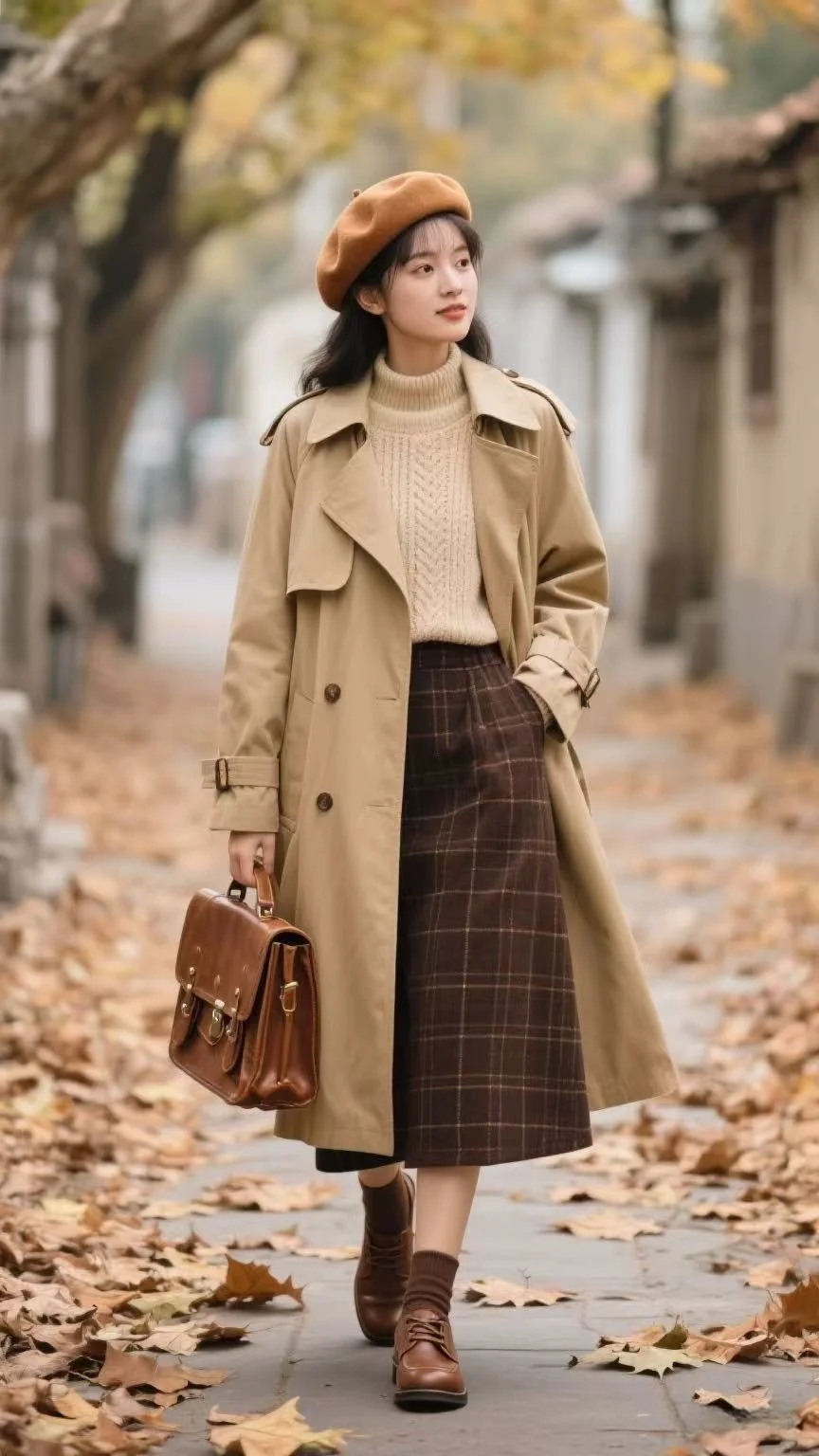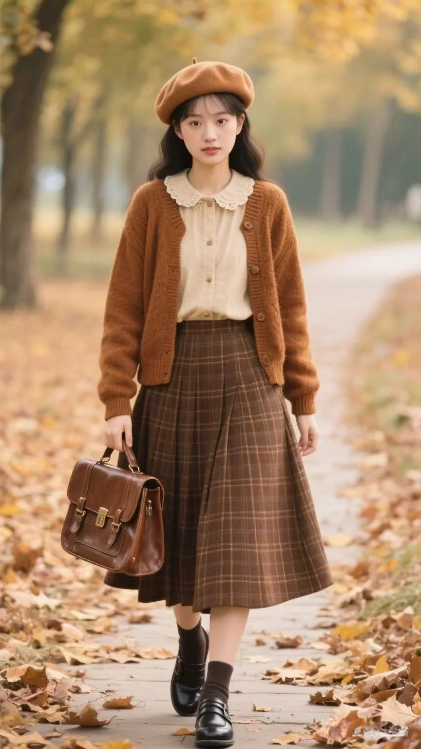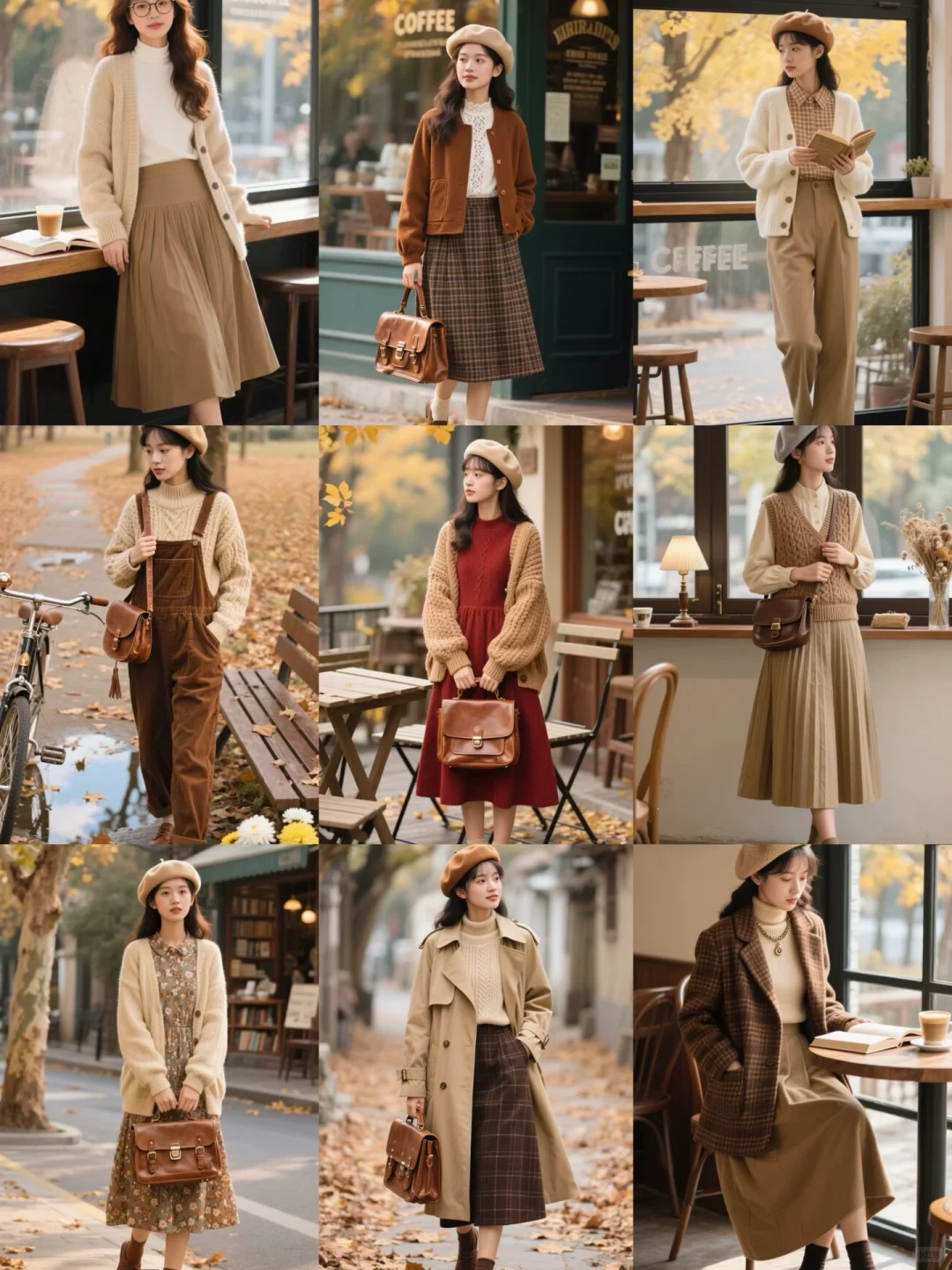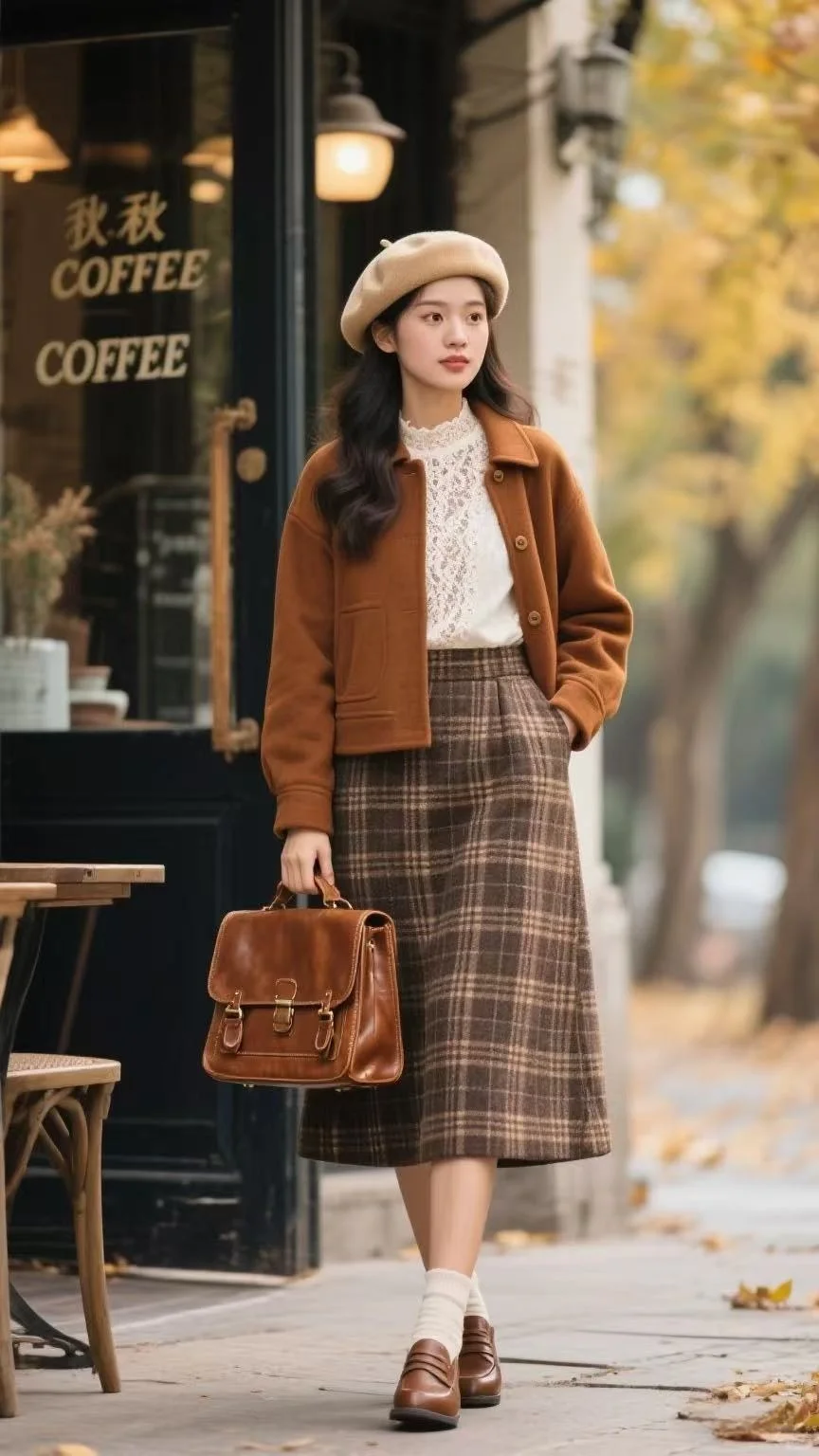 秋日氛围感拉满!这些复古穿搭太绝啦🍂\n宝子们,秋天的浪漫,都藏在这一组组超绝的复古穿搭里~\n✨软糯的米白色针织开衫,搭配卡其色半身伞裙,温柔似水。站在洒满阳光的咖啡店旁,仿佛是从旧时光里走来的文艺女主 ,优雅又迷人。配上同色系贝雷帽,精致感瞬间up。\n😍棕色灯芯绒外套内搭白色蕾丝衬衫,再配上格纹百褶裙,满满的复古学院风。拎上棕色的复古皮包,走在落叶纷飞的小道上,每一步都踏在秋日的浪漫里 。\n🥼驼色风衣与棕色格纹长裙的组合,大气又时尚。内搭高领毛衣,保暖又好看。坐在街边咖啡店,手捧一本书,一杯咖啡,就是秋日里最惬意的模样。\n😎还有棕色背带裤搭配米色毛衣,休闲随性中透着复古的腔调 ,背着棕色斜挎包,骑着单车穿梭在街道,仿佛回到了那个纯真美好的年代。\n💖宝子们,这些秋日复古穿搭有没有戳中你的心巴?快来评论区说说,你最pick哪一套呀~\n#秋日穿搭 #复古穿搭 #把糖炒栗子穿上身 #美拉德穿搭 #轻松拿捏秋日氛围感