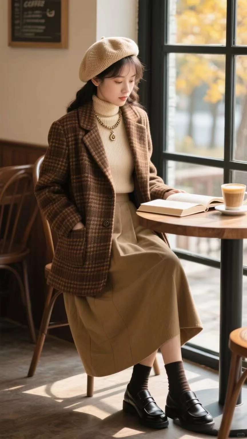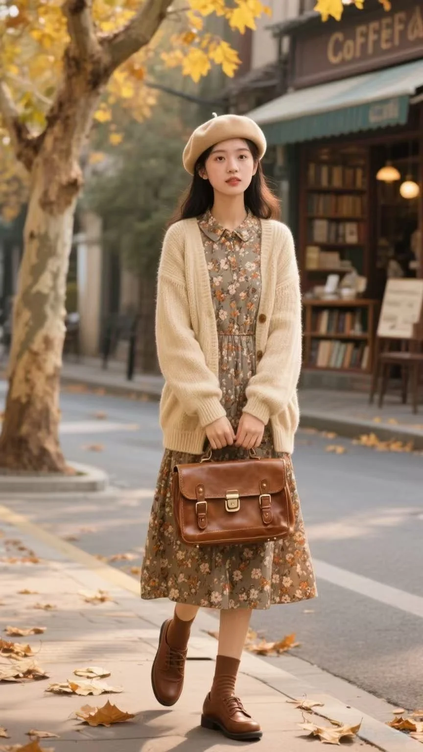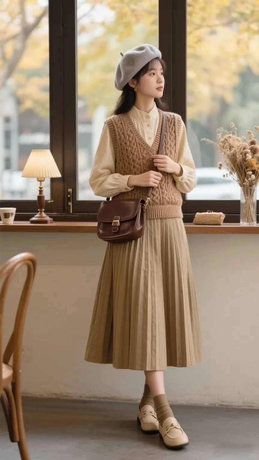 秋日氛围感拉满!这些复古穿搭太绝啦🍂\n宝子们,秋天的浪漫,都藏在这一组组超绝的复古穿搭里~\n✨软糯的米白色针织开衫,搭配卡其色半身伞裙,温柔似水。站在洒满阳光的咖啡店旁,仿佛是从旧时光里走来的文艺女主 ,优雅又迷人。配上同色系贝雷帽,精致感瞬间up。\n😍棕色灯芯绒外套内搭白色蕾丝衬衫,再配上格纹百褶裙,满满的复古学院风。拎上棕色的复古皮包,走在落叶纷飞的小道上,每一步都踏在秋日的浪漫里 。\n🥼驼色风衣与棕色格纹长裙的组合,大气又时尚。内搭高领毛衣,保暖又好看。坐在街边咖啡店,手捧一本书,一杯咖啡,就是秋日里最惬意的模样。\n😎还有棕色背带裤搭配米色毛衣,休闲随性中透着复古的腔调 ,背着棕色斜挎包,骑着单车穿梭在街道,仿佛回到了那个纯真美好的年代。\n💖宝子们,这些秋日复古穿搭有没有戳中你的心巴?快来评论区说说,你最pick哪一套呀~\n#秋日穿搭 #复古穿搭 #把糖炒栗子穿上身 #美拉德穿搭 #轻松拿捏秋日氛围感
