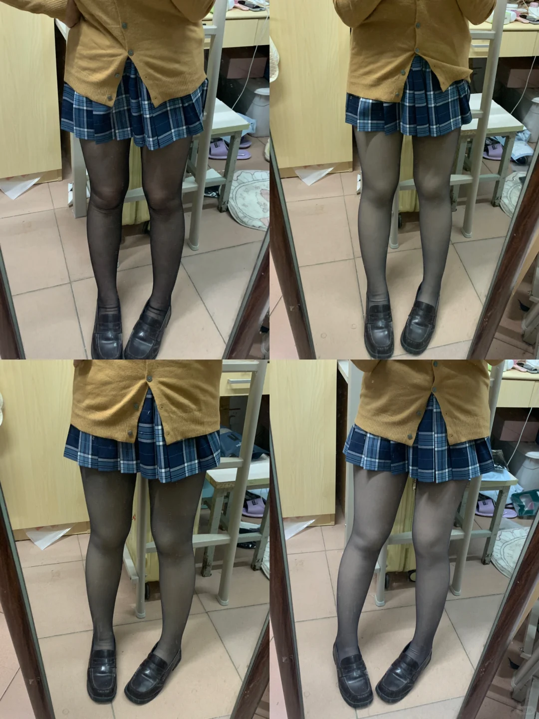p2-5是觅*薄绒p6-9是范希*薄绒p10-13是coco**家无绒\np14-17是pxx 宝纳斯**家\n本人情况:154 47.5kg\n大腿围:49 小腿围:29\n全部原相机直出 无拉腿\n🌟透肤度:宝纳*家比较黑,不透肤,感觉可以当夏季的厚黑穿,冬季不适合;觅🍊透肤度高,颜色均匀很自然!coco**家透肤度也可以,有点微压的效果!范希*家透肤度也不错,和coco**感觉差不多!\n🌟掉档程度:宝纳斯**家有点勒裆但不会掉裆,其他三款都没有掉档情况也没有卡裆!\n🌟脚部舒适感:穿上鞋 脚底舒适感最好的是觅🍊家和coco** 范*丽家也还不错!pxx的太薄了 没有什么感觉\n🌟下滑程度:四款都需要穿上去之后提一下!但是上身没有下滑情况\n🌟勾丝程度:夸夸觅*、coco**家还有范*丽 有手套!特别贴心!!!长指甲的宝宝可以带上手套🧤减少勾丝和划破!\n🌟颜色分布:觅*颜色分布很均匀‼感觉很显瘦 买的四款里是最厚的!但是最显瘦!‼coco**的效果也很不错!这三款黑丝光腿神器可以遮盖腿部瑕疵,而且颜色很适合日常通勤!什么肤色都可以驾驭,橄榄皮肤色穿上也很自然!\n室内光线颜色(由深到浅):pxx宝*斯>范*丽>觅*>coco**\n🌟弯曲褶皱:pxx宝*斯膝盖弯曲之后褶皱有点多,范*丽家褶皱在正常范围内可以接受!coco**家褶皱是有点,但舒展之后马上就恢复,觅*弯曲之后感觉没有什么褶皱!\n🌟弹性:四款弹性都很不错!!!延展度很好,高个子宝宝舒服可以买coco**家🥹\n🌟上身效果:觅🍊>coco**>范希*>pxx**\n觅🍊和coco**感觉超级显瘦 薄绒也感觉和无绒款差不多上身效果!!\n#光腿神器 #黑丝 #平价 #丝袜 #jk #jk制服 #黑丝光腿神器