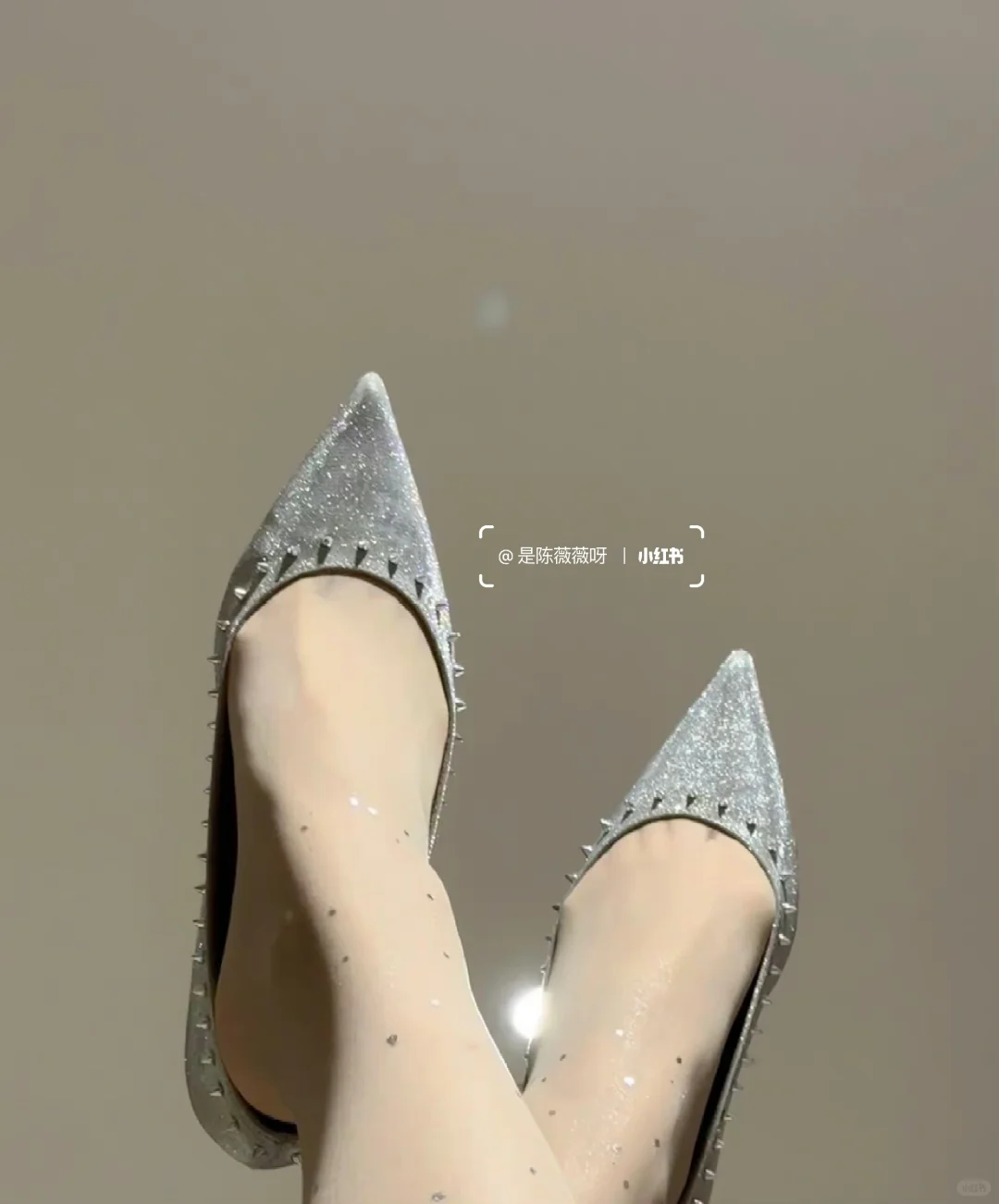 纯欲感爆棚的闪亮肉丝配银色铆钉尖头平底鞋