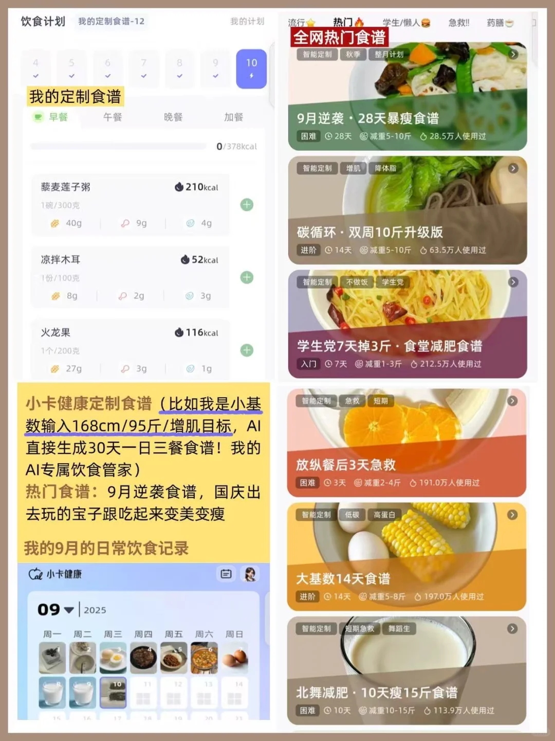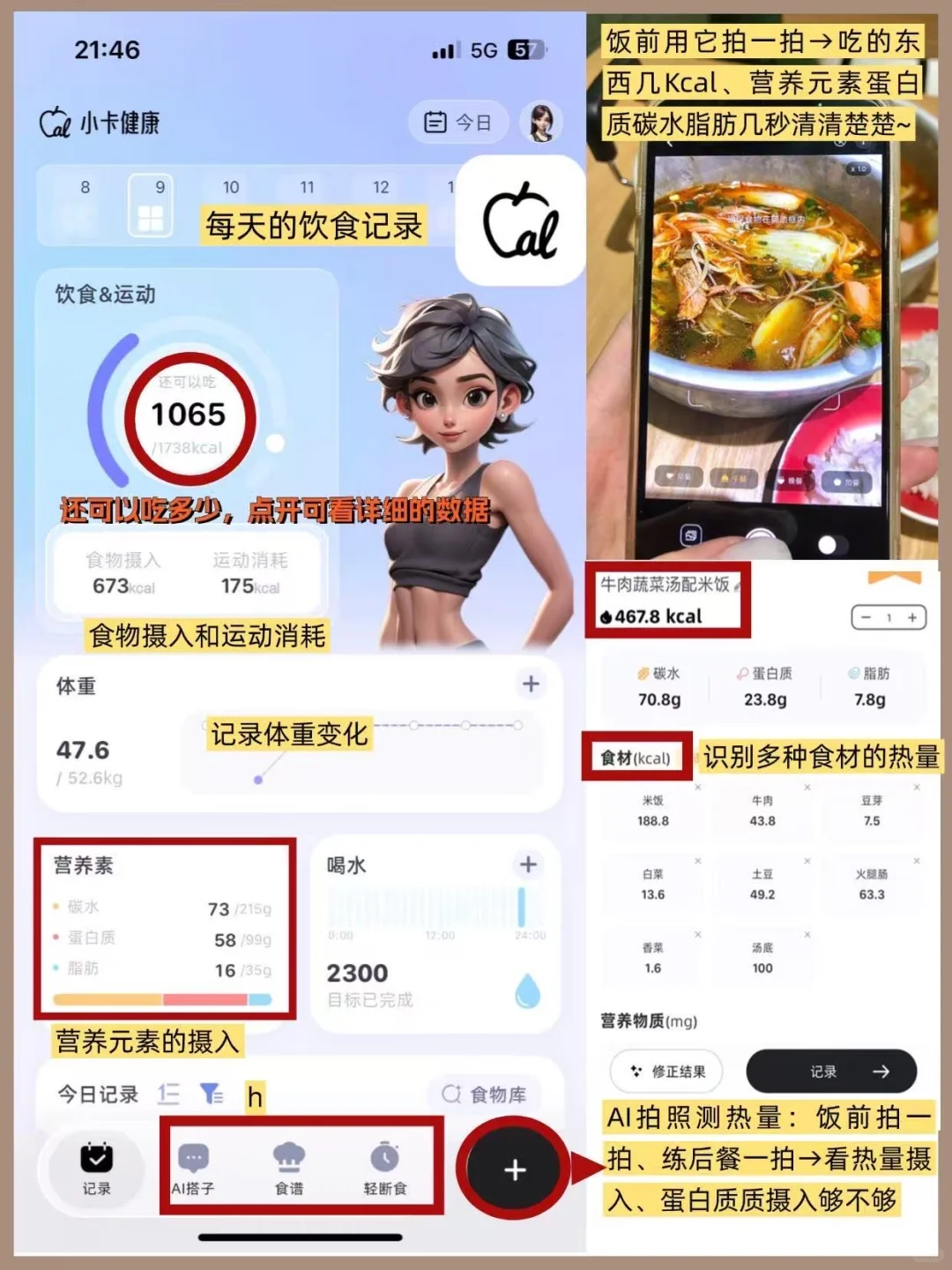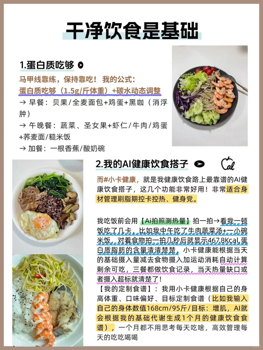 P1被几万集美夸过这么美的腹肌马甲线线条,达到了细腰和紧致肌肉的完美平衡,是怎么练的?\n小基数突破身体瓶颈也挺难的。我也经历过卡平台期,努力训练线条感不够明显,达不到自己的理想状态。后来坚持【干净饮食+规律健身】,逐渐看到漂亮的身材线条显化。\n-\n【干净饮食是基础】\n马甲线靠练,保持靠吃! 我的公式:\n蛋白质吃够(1.5g/斤体重)+碳水动态调整\n→ 早餐:贝果+鸡蛋+黑咖(消浮肿)\n→ 午晚餐:蔬菜+虾仁/牛肉/鸡蛋+荞麦面/糙米饭\n→ 加餐:一根香蕉/酸奶碗\n-\n#小卡健康,是我健康饮食路上最靠谱的AI健康饮食搭子\n我吃饭前会用【Ai拍照测热量】拍一拍→看我一顿饭吃了几卡,比如我中午吃了牛肉蔬菜汤+一小碗米饭,对着食物拍一拍几秒后就显示467.8Kcal,碳蛋脂含量清清楚楚,它能根据当天的基础摄入量减去食物摄入加运动消耗自动计算剩余可吃,三餐都做饮食记录,当天热量缺口或者摄入超标就清楚了!\n【我的定制食谱】:用小卡健康输入自己的身体数值168cm/95斤/目标:增肌,AI就会根据我的基础代谢生成1个月的健康饮食食谱),一个月都不用思考每天吃啥,高效管理每天的吃吃喝喝\n【热门食谱】:小卡几乎集齐全网热门100+食谱:\n用了小卡健康半年帮我规划健康饮食食谱,让我的健身的效率翻倍,显化好身材\n-\n【规律健身雕刻线条】\n每周3~4次训练,几乎全身都练:肩背、核心腹、臀腿。\n力量训练:\n- 肩背:高位下拉、划船、哑铃飞鸟\n- 杠铃深蹲、臀冲、箭步蹲(练臀腿线条)\n- 核心腹:卷腹类动作,高位卷腹椅、仰卧抬腿\n配合有氧运动20min:\n- 每周2~3次跑步机爬坡或快走,20min\n- 动态拉伸10分钟\n作为小基数,我太懂「不敢吃又怕掉线条」的焦虑!小卡健康真的在帮我了解饮食、管理营养、保持状态的工具,姐妹们在刷脂期,想调整饮食结构养成干净饮食习惯的可以下载小卡健康辅助管理饮食。\n#小基数体型的健身天赋进化史#小卡健康#干净饮食#健康饮食#好身材#见人不如健身