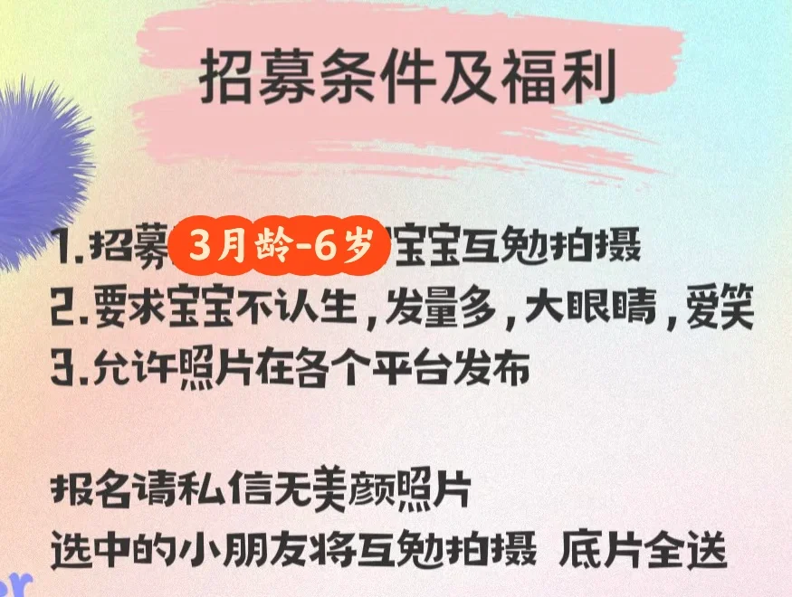 招募要求:\n1️⃣3月龄-6周岁男宝女宝\n2️⃣性格好、爱笑、肤白、大眼睛、有头发\n3️⃣拍摄时间均在周内完成,周一至周五\n4️⃣拍照片及视频素材将用于各个网络平台宣传发布使用(仅作展示)\n \n📷参与方式:\n一键三连(点赞+收藏 +关注)\n在评论区晒出你家宝宝的萌照+月龄🎈\n \n(本次拍摄免费赠送所有底片+9张电子版精修照)\n有意向的宝妈宝爸可以评论报名附上宝贝照片~\n \n我们正在寻找可爱的小模特宝宝,参与我们的全新创作主题,希望能有双向奔赴的宝宝加入🫶🏻#儿童摄影 #邯郸儿童摄影 #邯郸 #邯郸宝宝写真 #童模 #邯郸互勉 #互勉约拍 #邯郸摄影 #邯郸约拍 #邯郸写真