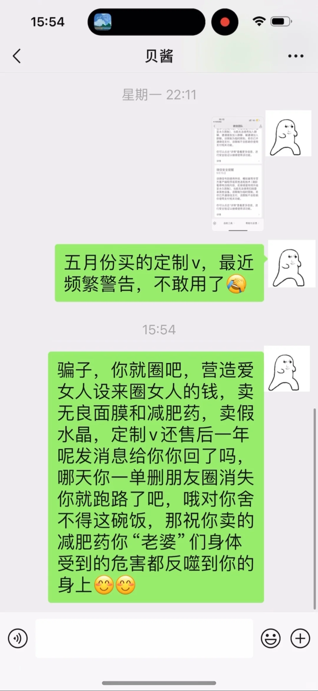 现在很多女生都喜欢用爱女人设⭕️米。我之前在小红书加的一个发头像的人,朋友圈经常发头像和壁纸,营造爱女人设,一口一个宝宝老婆,一个多月后就开始卖减肥💊、🍑搜不到的无良面膜,还有定制v之类的东西,后来我的v差点被feng了,发消息给她她也不回,继续发朋友圈。名字叫贝贝,她的朋友圈很多人拥护她,如果有加了她的网友记得留个心眼#不要上当受骗 #揭穿骗子套路 #骗子无处不在谨防上当受骗 #不要被骗了\n \n真实的爱女∶教女孩子清醒自律上进变好\n虚假的爱女∶伪装成很爱女,分享一些头像背景键盘皮肤,然后开始麦红包封面,减🥩💊,假水晶