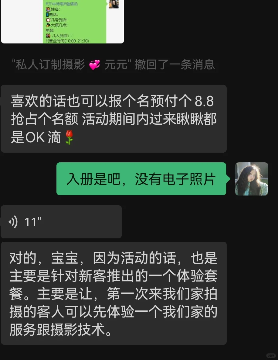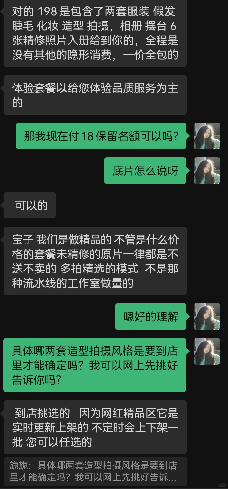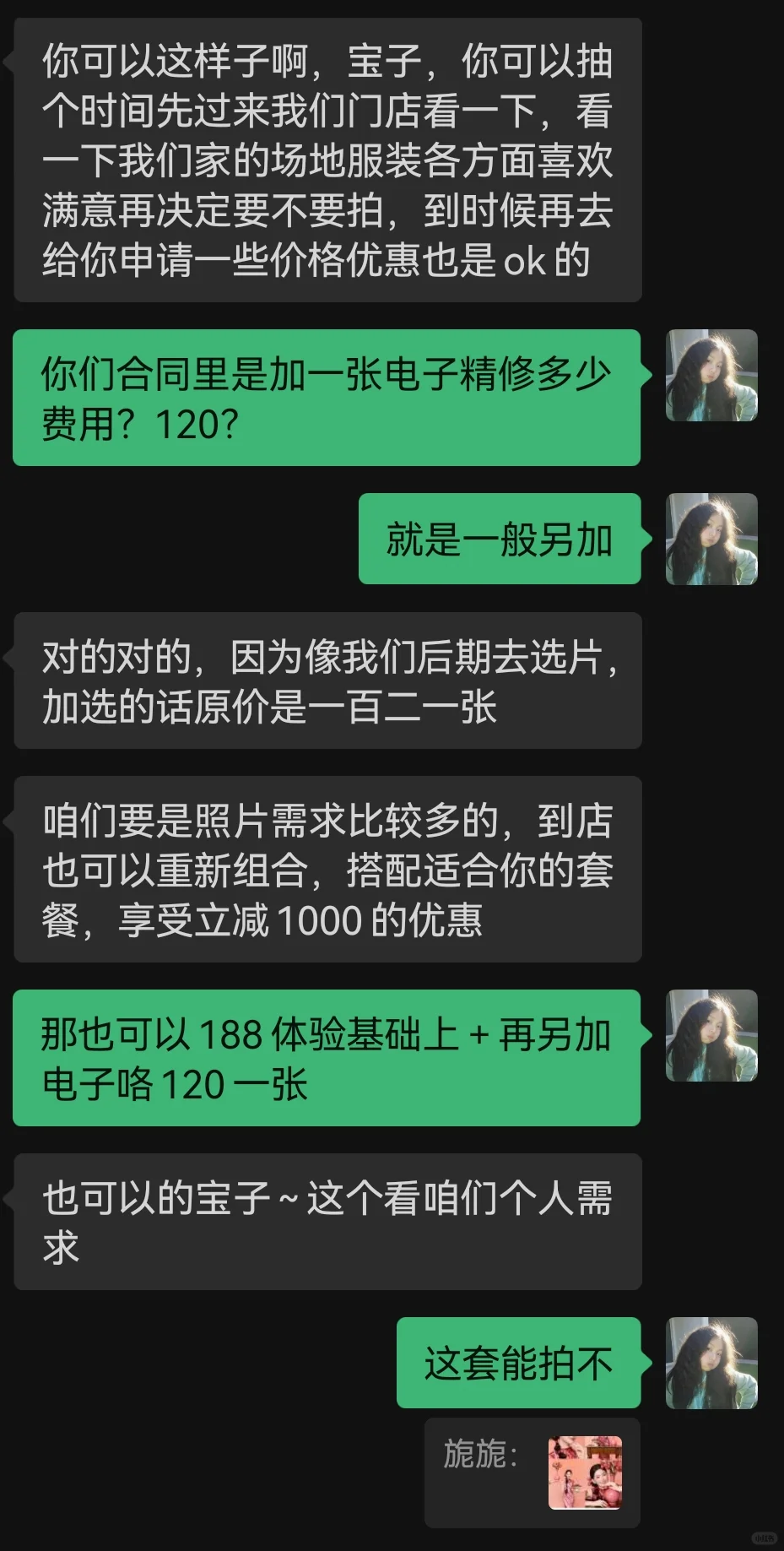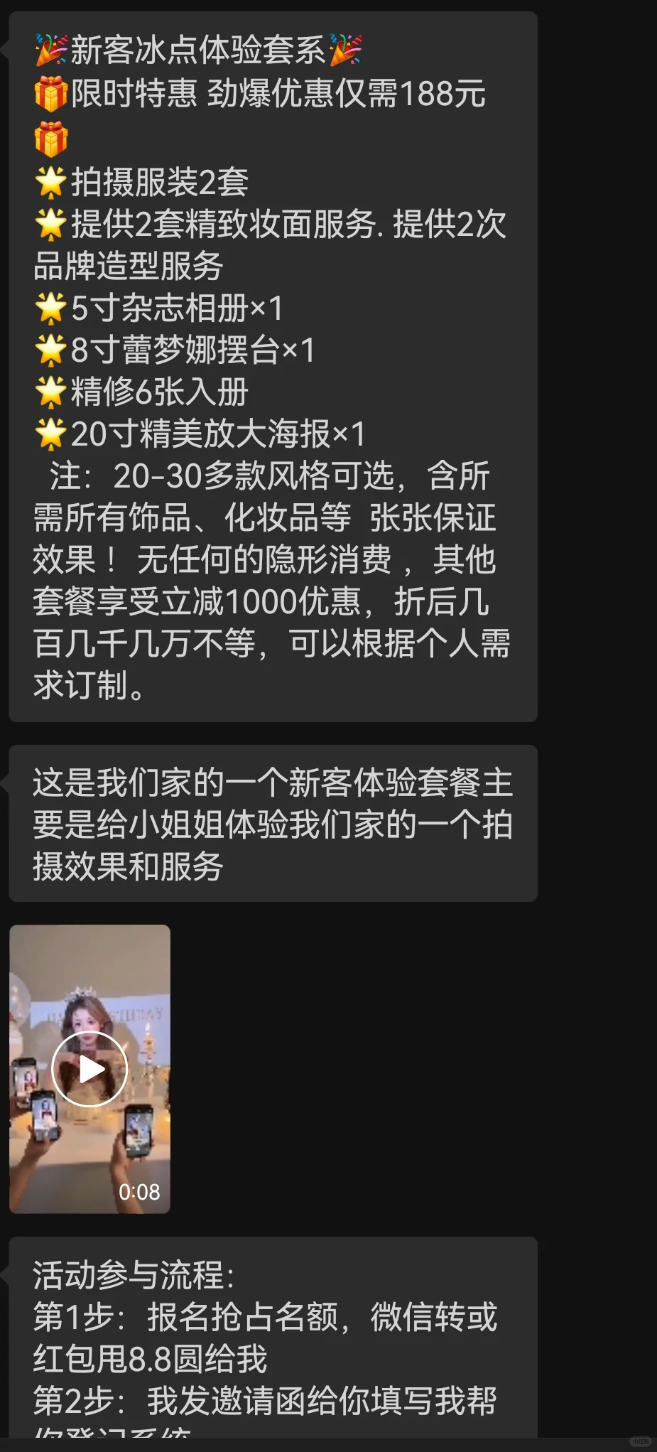 🌟发这篇帖子是因为自己作为大学生🧑🎓,初入这个小社会,喜欢拍写真,前前后后海马体+影楼+旅拍约拍也有七套了,想给大家分享一下一些经历,希望小伙伴们不要被语言障眼法哦,你以为和实际不一样就不好了~\n \n分享个人经历,不存在评判商业模式,一分价钱一分货,总是体验不同的,拍摄成本呀技术也是都要的~\n \n💦P1:我们会看到198,288,299的低价引流帖,加上vx后就会发他们的套餐,这个时候你会发现“哇塞!拍两套么!6张精修!这也太幸福了!”\n❌❌❌实际上它说的是“六张精修入册‼️”入册是什么意思:是给你一个相册,相册里面印着六张照片是精修的,是一张电子照片都不会给你的哦~\n \n💦P2:低价引流后,你就会付一笔小额定金(不可返还),我还自作聪明转账备注了一下😅\n❌❌❌然后你按照约定时间到店里了,他们会告诉你“我们这个套餐其实是入册,对吧很不值呀,你也发不了pyq”🥹,毕竟你是被拉到店里了,他们软磨硬泡很难坚定立场的👏🏻最后拿出套餐1.6k👏🏻3服3造9精修电子版照片,这才是真正的价格💸💸💸\n❌❌❌当你犹犹豫豫一会儿,他们会说“哎呀你是学生,我和我们经理商量一下,看看能不能给你学生价”🥹,然后拉上大厅边上一个就坐着的“经理”角色,沟通一番后告诉你“1.2k!我们经理还是很好说话的哈!再送你个相册+摆台”这才是真正真正的套餐和价格💸💸💸\n(以上话语皆属实)\n \n🌟🌟🌟:一般+1张电子照片是120~150💰\n \n💦P3~P5:又咨询了一家,也是一样的话术\n🌟🌟🌟:不过发现可以“体验价格+120一张电子版照片”(这样的组合也是可以滴)\n \n🌟🌟🌟告诉你线下店里600多套衣服挑选,基本是不可能的,我在化妆的时候,听到一个助理告诉我的化妆师🤫“客人比较想拍这套”,化妆师🤫“这套妆造不好做,做出来不好看,而且这件衣服破了”\n \n🌟🌟🌟胸贴要自己准备好的(店里60💰💦,✅美团),服装呀,鞋子往往不干净,推销说的消毒听听就好啦~\n \n🎞🎞🎞其实也是比较正常的营销策略,不然大家可能也不愿意进一步咨询下去,但有些宝宝可能觉得为什么不一步到位真实价格呢,其实决定了来拍那肯定是有备而来的,这样的话术可能会微微觉得自己“上当了”,觉得商家不够真诚~\n \n❤️🔥❤️🔥❤️🔥最后希望喜欢拍照的宝宝都能开心拍到自己满意的写真!\n#写真攻略 #写真小tips #个人写真 #避坑