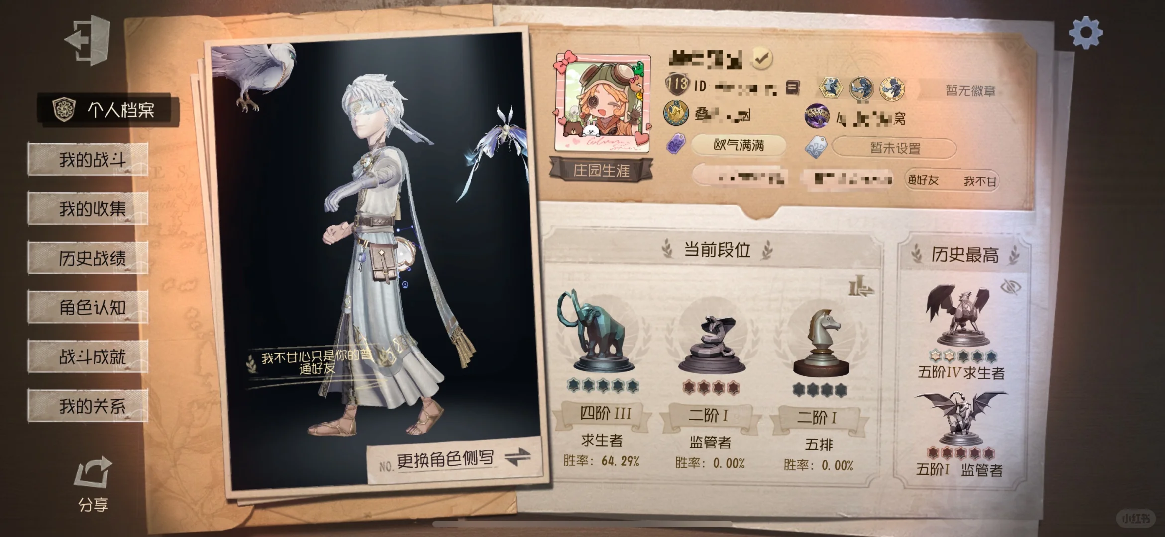 宝宝们我来试试找一个第五固玩 女大卡女最好已成年 平时没课的时候都能打 有点社恐但是熟了会经常找你玩🥹\n熟悉了可以挂标签绑亲密关系 标签挂的朋友都忙现生了 不卡1v1只要看到我在线都能拉我一起玩 要是打不了会和你解释\n有点菜水平基本也就是四五阶左右 打匹配和联合多一点不爱打排位 心态好不压力人不骂人 cp主磕黯白 只要不是佣占先祭黄占其他都能陪你磕\n当然是同好就更好了🥺可以一起建设cp\n#第五人格固玩 #第五人格 #固玩dd