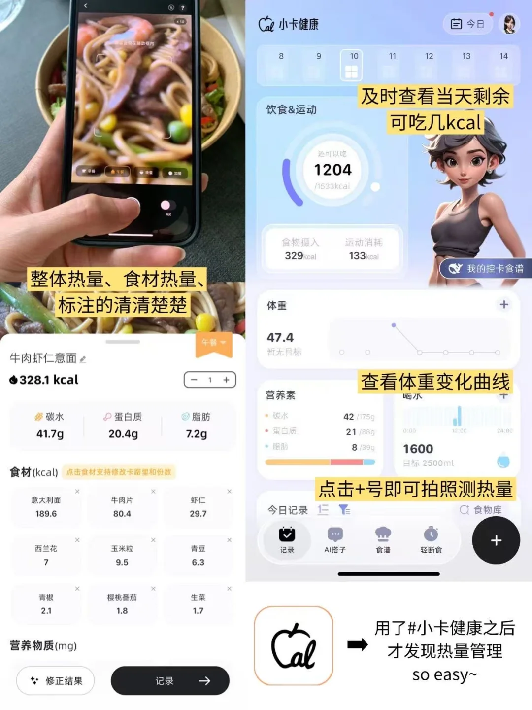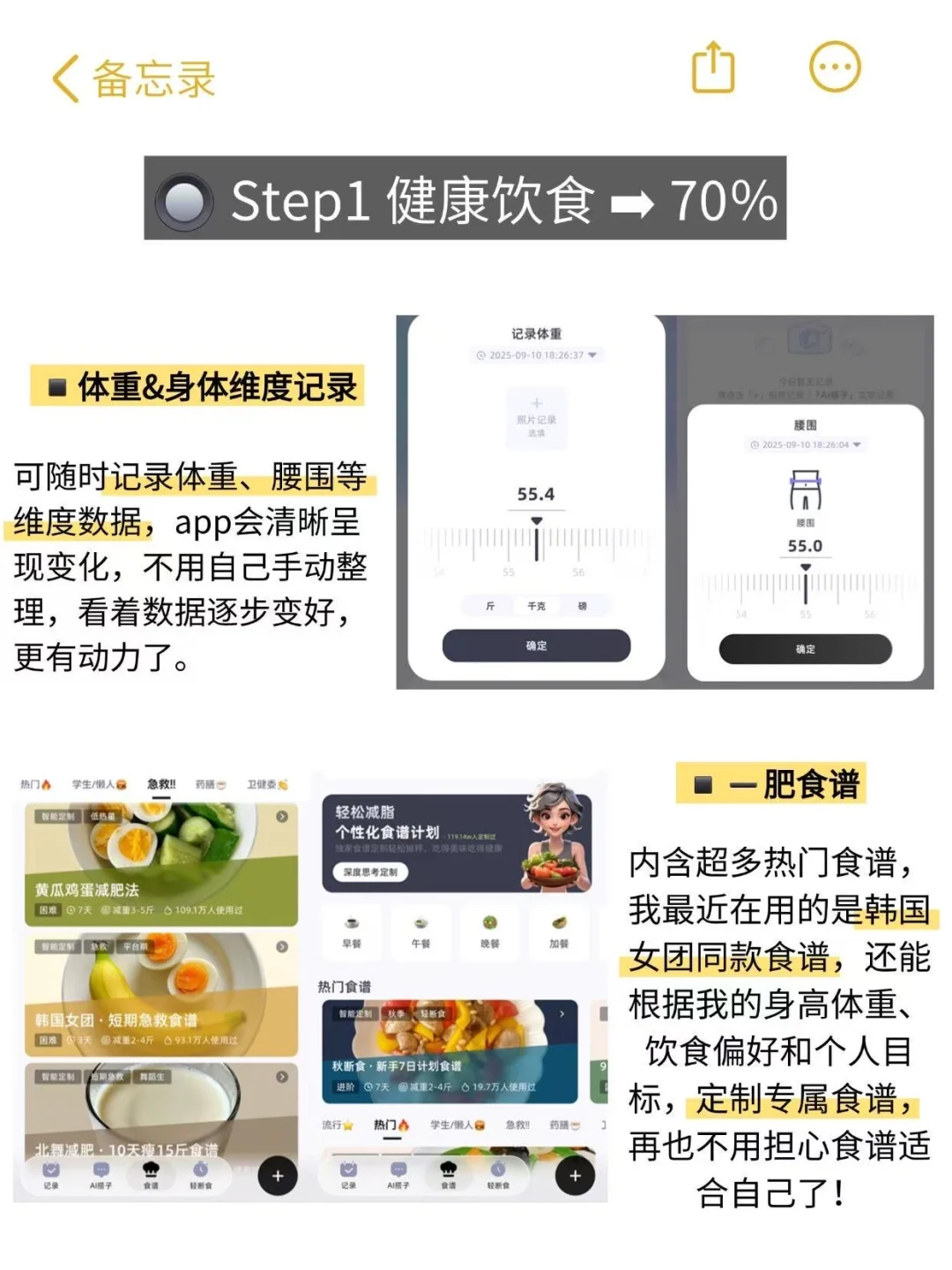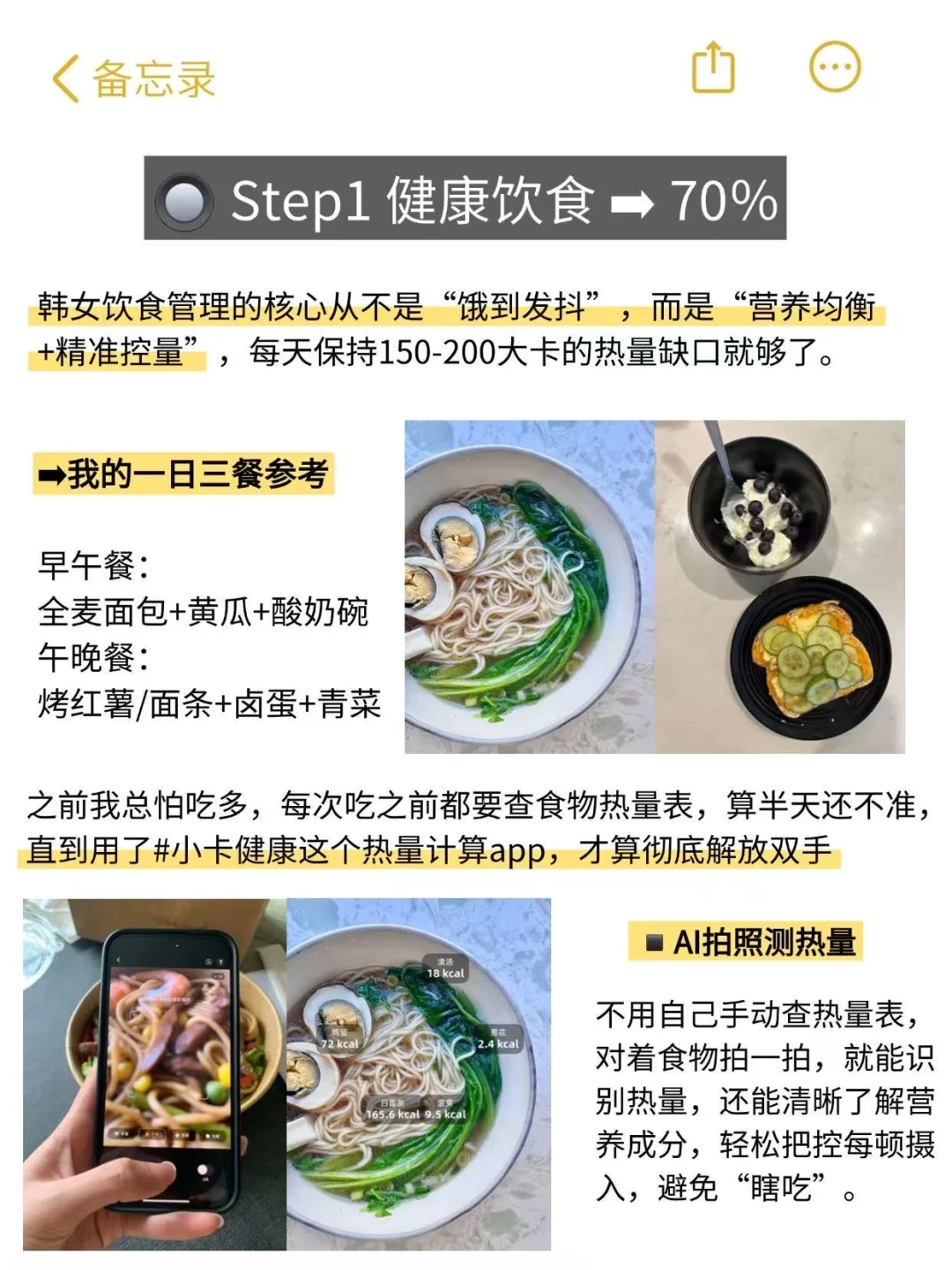 谁懂啊!我真的是韩女好身材的狂粉,韩女那种不是干瘦、而是透着健康紧致的线条感,穿简单的T恤牛仔裤都超有氛围感的身材,真的太戳我了!\n前阵子奶茶轮番安排,还总熬夜吃宵夜,现在穿紧身衣能明显看到小肚腩,拍照的时候得刻意收肚子、找角度,整个人看着又臃肿又没精神。\n-\n后来刷到韩女分享的变美思路,才发现她们靠“健康饮食+日常好习惯”慢慢调整,我果断跟着学,没饿肚子也没猛运动,才1个多月就找回了腰线,皮肤状态变好了。\n-\n🔘Step1 健康饮食 ➡ 70%\n韩女饮食管理的核心从不是“饿到发抖”,而是“营养均衡+精准控量”,每天保持150-200大卡的热量缺口就够了。\n➡我的一日三餐参考\n早午餐:全麦面包+黄瓜+酸奶碗\n午晚餐:烤红薯/面条+卤蛋+青菜\n之前我总怕吃多,每次吃之前都要查食物热量表,算半天还不准,直到用了#小卡健康这个热量计算app,才算彻底解放双手\n-\n◾️AI拍照测热量:不用自己手动查热量表,对着食物拍一拍,就能识别热量,还能清晰了解营养成分,轻松把控每顿摄入,避免“瞎吃”。\n◾️➖肥食谱:内含100+热门食谱,还能根据我的身高体重、饮食偏好和个人目标,定制专属食谱,再也不用担心食谱适合自己了!\n-\n🔘Step2 养成日常好习惯 ➡ 30%\n韩女很注重“由内而外的精致”,不是靠浓妆,而是好习惯养出来的。\n◾️绿茶水洗脸\n每天早上用放凉的绿茶水洗脸,绿茶里的成分能舒缓皮肤,我之前T区总出油,坚持下来出油少了,毛孔都看着细了点。\n◾️严格防晒\n出门必做严格防晒,能防紫外线晒黑,还能减少光老化。\n◾️规律运动\n不用天天泡健身房,选对运动更重要,我每周固定居家视频跟练3次,每次30-45分钟左右,大致是2次腿部训练加一次全身有氧。\n➡我的跟练课程参考:\nJo姐&Kpop女团MV 45分钟 跟练\nmizi+BLACKPINK 12分钟 跟练\n李知恩最强瘦小腿10分钟跟练\n#小卡健康#饮食记录app#自律女生#热量计算app#饮食管理 #好皮肤#身材焦虑#像韩女一样自律#变瘦 #身材管理