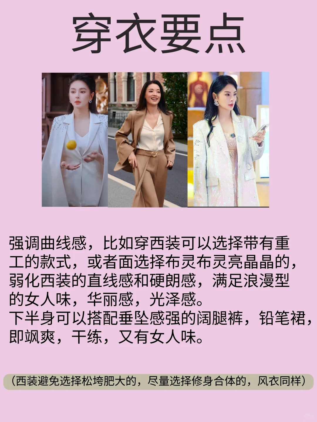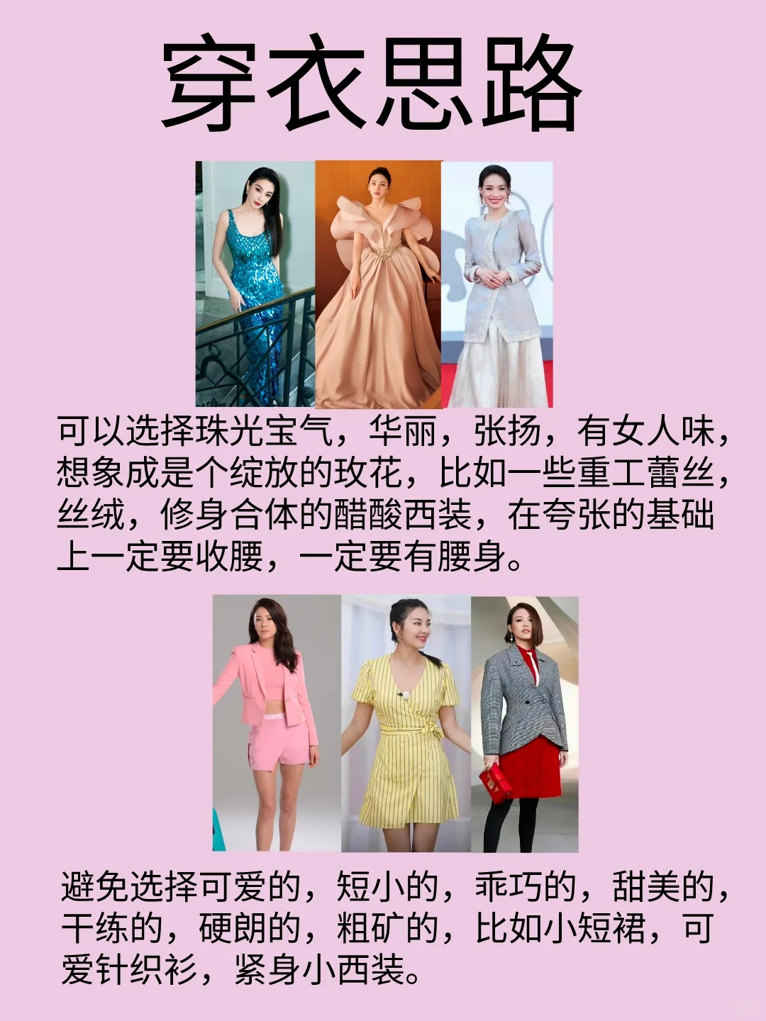 浪漫型风格特点:曲线型,大量感,给人妩媚,妖娆,华丽的感觉,化妆和不化妆差距大,化妆后是风情万种大女人,不化妆,会显得寡淡,没精神。\n \n穿衣:尽量选择有腰线和曲线感的衣服,颜色可以选择亮色,图案往大了选,把珠光宝气诠释到位,鞋子可以搭配细高跟,或者亮色配饰。\n避免选择宽松的卫衣,大衬衫,可爱的,小巧的衣服,前者显壮后者显得拘谨。\n日常穿搭中,浪漫型穿错衣服,很容易显胖显土显老气,所以避免直线剪裁的衣服,线条感太强的衣服都会显壮,显胖,无法诠释浪漫型的曲线感,所以收腰款式裙装比裤装更合适,如果穿裤子,那上衣要选择能展示出腰线,亮色的款式,裤子避免粗糙,软趴趴,没有质感的料子,选择垂坠感强的面料,有型的裤子。\n \n注:全身的亮色不要过多,过多会显得太满。\n \n妆容:强调眉眼,唇妆,但在日常生活中,眼部勾出眼线,刷上睫毛膏,再画个红唇足够,太浓重的妆容,搭配日常的服装,只会显得过于用力,效果适得其反。\n \n#形象管理 #浪漫型 #浪漫型风格 #八大风格 #时尚穿搭 #风格 #穿搭 #时尚 #时尚薯 #潮流薯